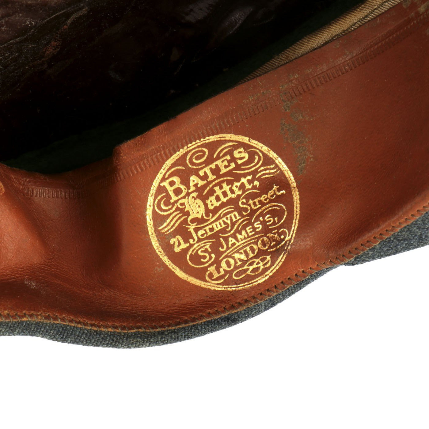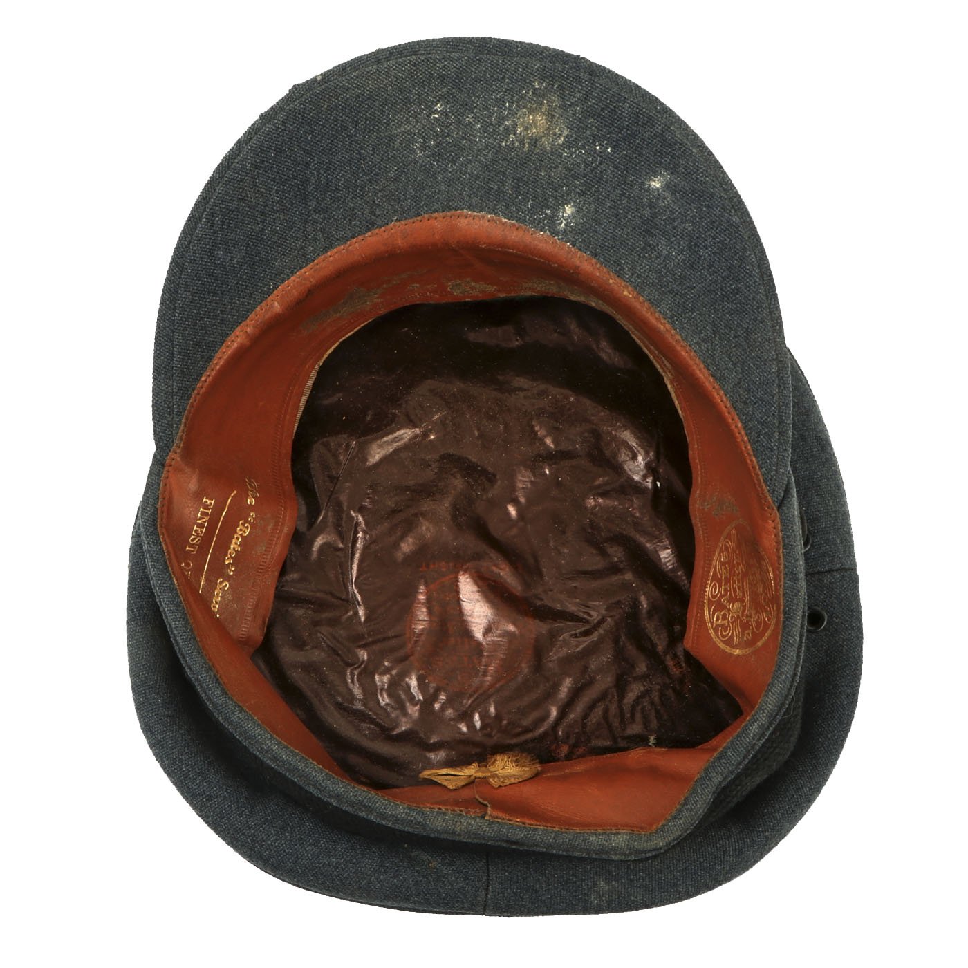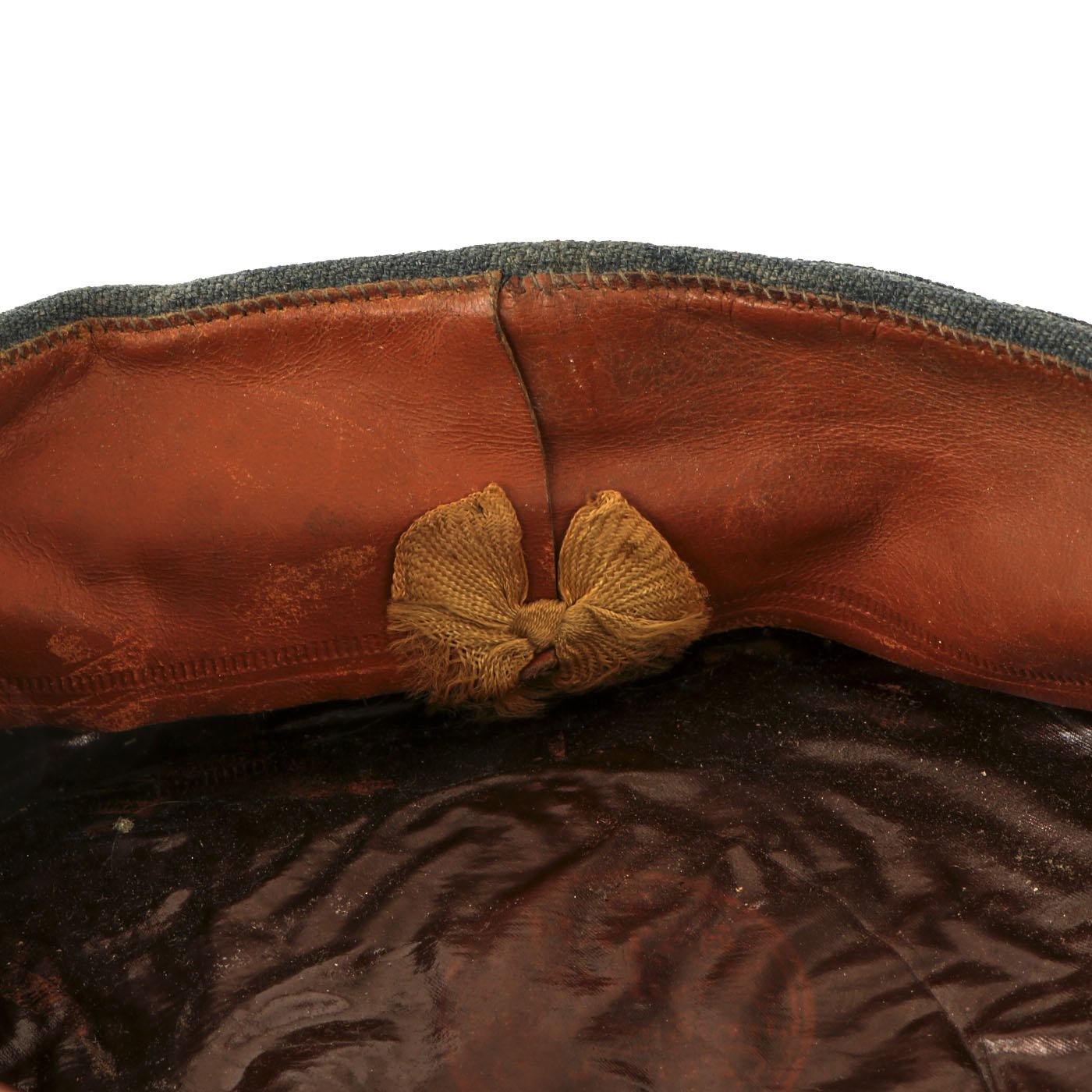 Offered in overall very good condition with a few minor nips here and there. The interior celluloid sweat shield has become orange in color, which happens as the material deteriorates. It is however still flexible. There is light wear to the sweatband, and some dirt staining on the front where the forehead would rest. Size is approximately 7 1/4 US (58cm).
