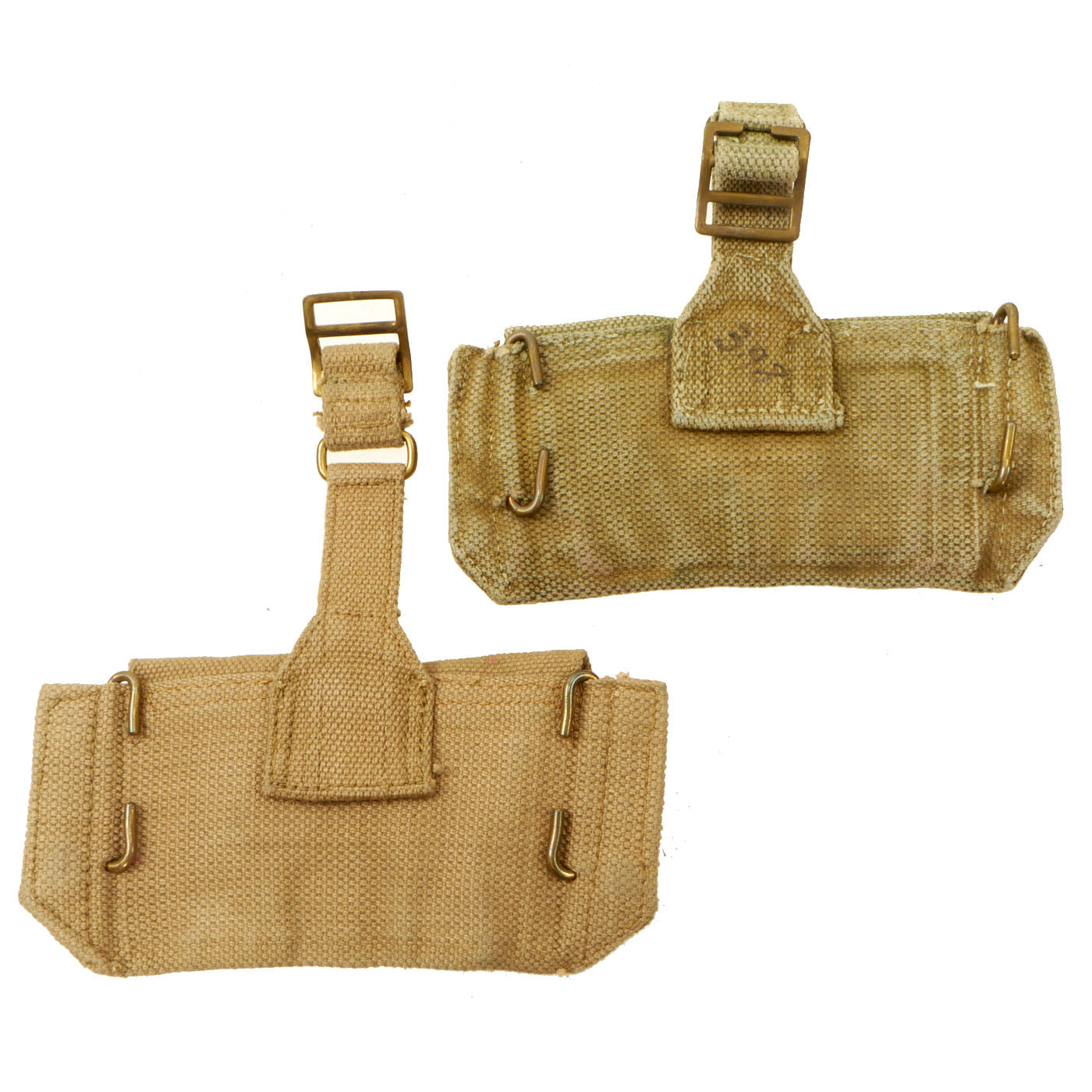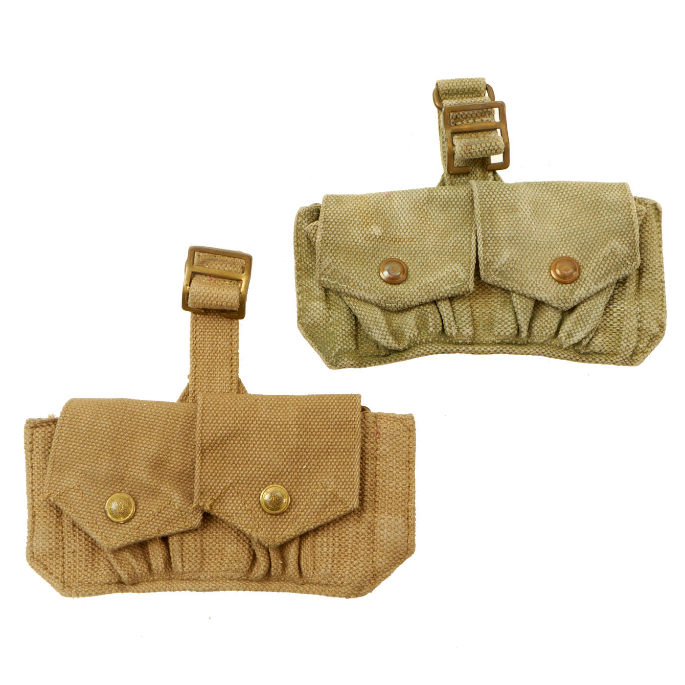 - x2 1937 Pattern Double Cartridge Pouch: A horizontal rectangular case with two square pouches that carried a total of 20 rounds (4 × 5-round clips). It was designed for use by non-infantry soldiers who carried a rifle. Each pouch contained (2) 5-round chargers that were separated by a cloth divider. The pouch had two snaps: the bottom snap was used if only one clip was carried and the top snap was used if both clips were carried. The back of the carrier attached to the web belt with two long oval metal hooks and the top had a strap that linked into the shoulder strap.