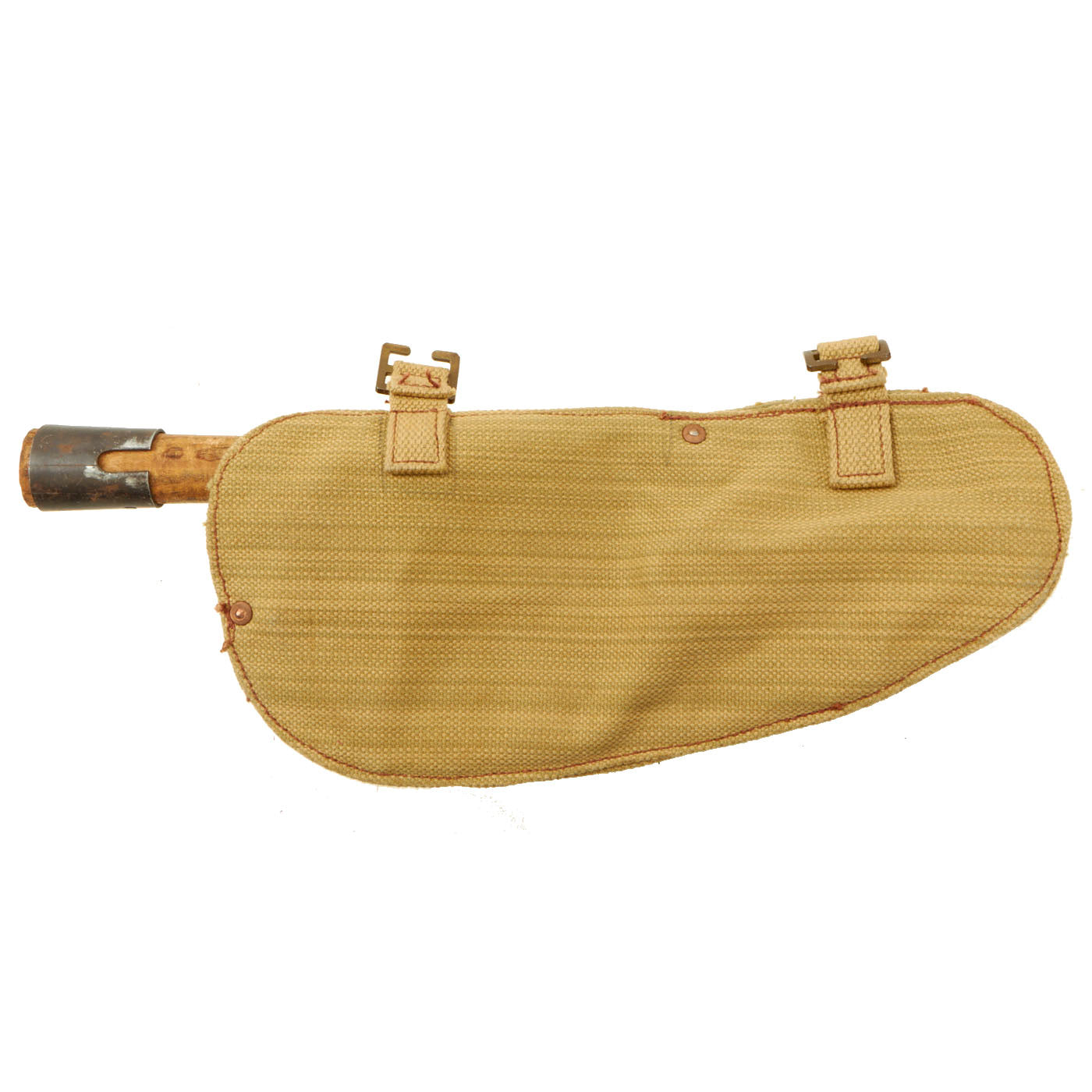- Pattern 1937 Entrenching Tool WITHOUT Bayonet Lug: The 37 pattern webbing set originally included a small shovel for entrenching. This was found to be pretty useless and it was decided to reintroduce the ‘sirhind’ type of entrenching tool used with the 08 pattern web set. This entrenching tool obviously needed a carrier, so the designers at Mills took the old 08 entrenching tool cover and modified it for use with 37 pattern webbing. The design included the same kidney shaped webbing bag as the old 08 pattern design, and it was into this that the head of the entrenching tool was placed. The British 1937 Pattern entrenching tool added a bayonet lug to the tool's handle, allowing the Lee-Enfield spike bayonet to be mounted on the end and converting the tool into a mine prodder.