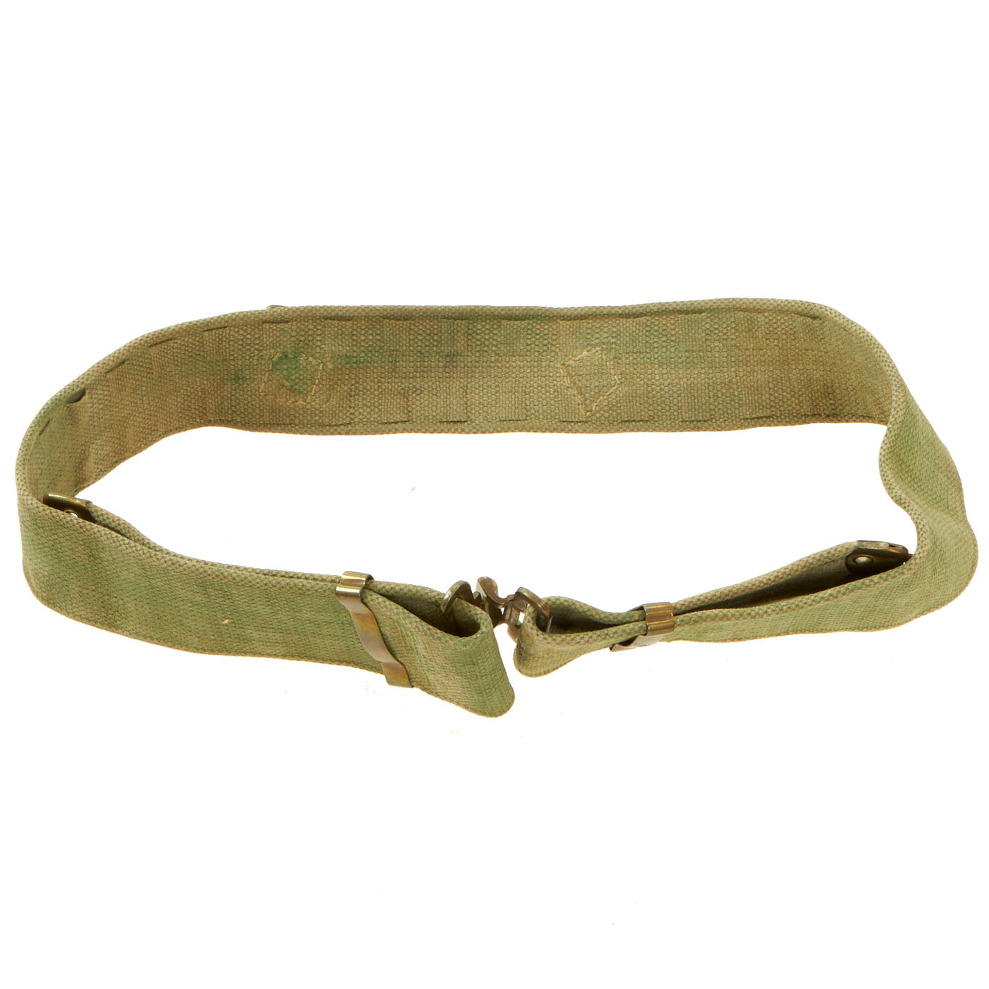 - 1937 Pattern Green “Pistol” Belt: These belts were worn around the waist and clipped together at the front using the 'hook and loop' buckle. They also have the two buckles at the back for attaching to the braces.
