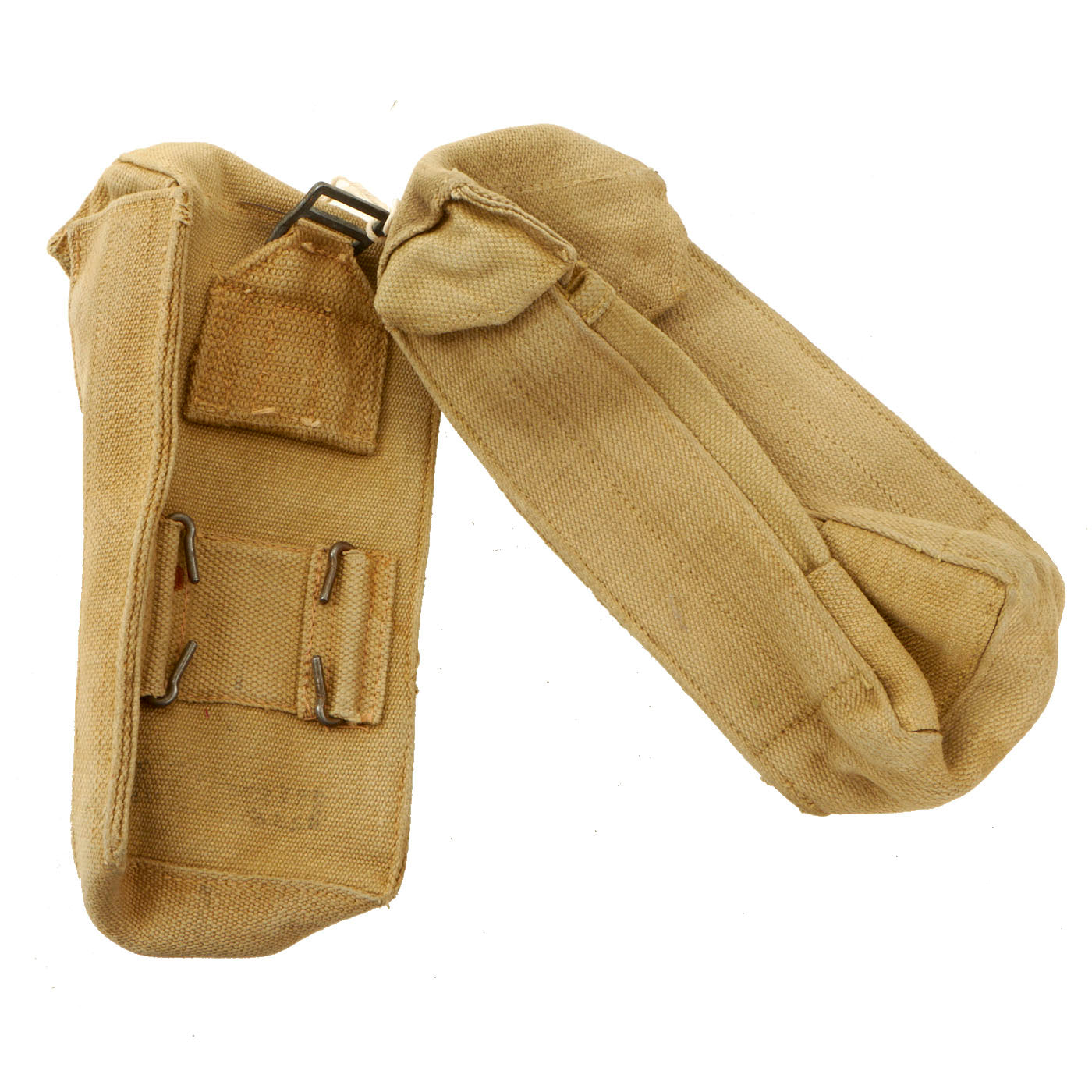 - x2 1937 Pattern Mk2 Basic Pouches: A large vertical rectangular pouch that went through three versions (Marks I, II, and III). It could carry either (2) BREN magazines, (6) 20-round Thompson SMG magazines, (4) No 36M Fragmentation, No 69 Offensive, or No.77 White Phosphorus grenades, (4) No 36M cup-discharger rifle grenades with attached gas-check baseplates, (2) Smoke Grenades, or boxes of Small Arms Ammunition. The Mark I version had three cartridge loops sewn into the inner lid for carrying three ballistite Rifle Grenade Blanks for launching rifle grenades; this feature was later omitted on the Mark II pouch. The longer Basic Pouch Mark III could hold (5) 32-round STEN Machine Carbine Magazines.