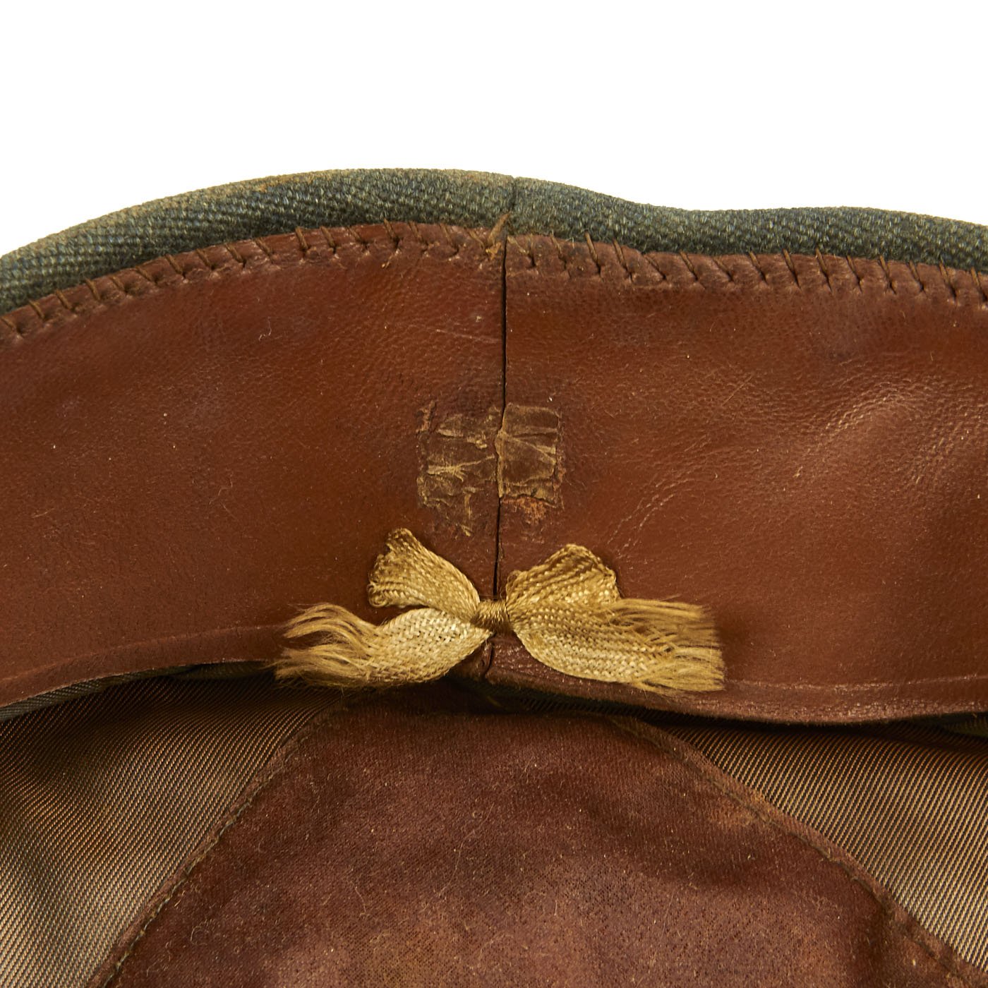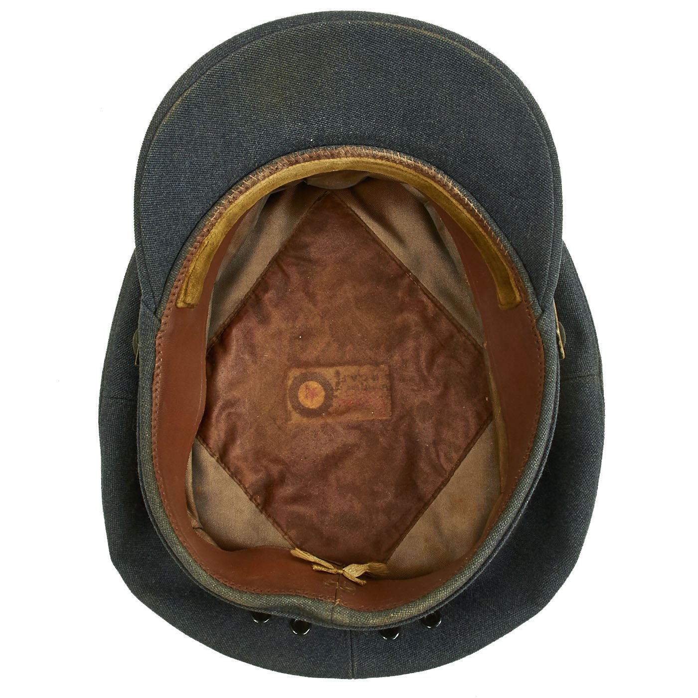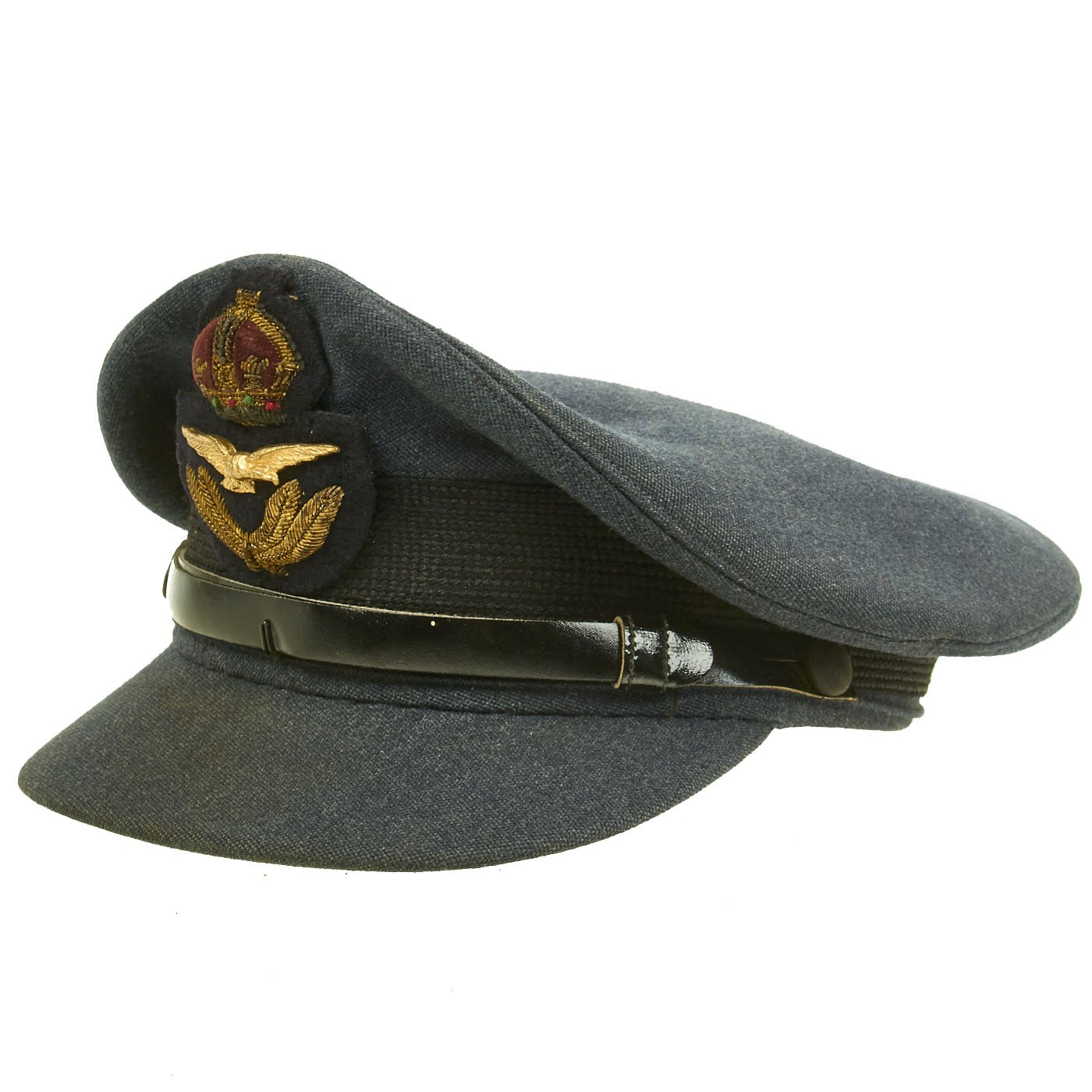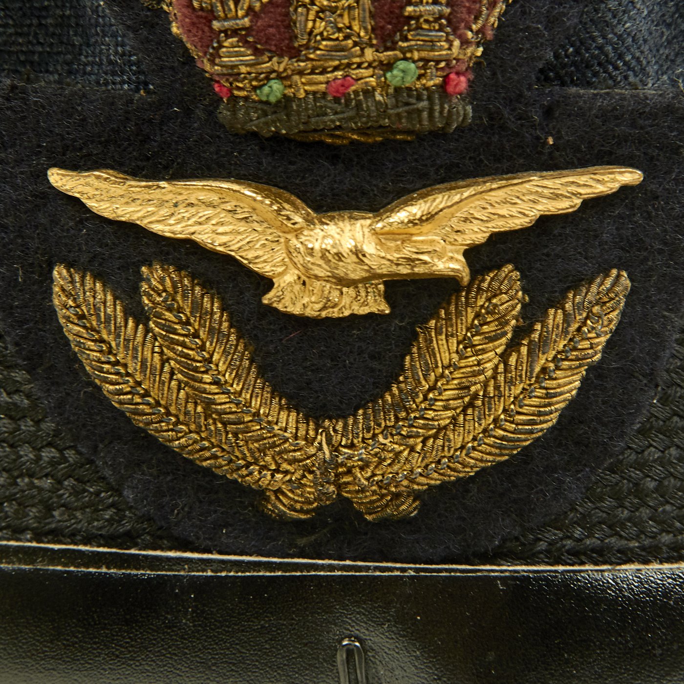 Original Item: Only One Available. This is a beautifully made RCAF officer's peaked visor cap dating from WWII. Constructed of blue barathea wool with black mohair band and lovely padded bullion embroidered King's Crown badge and laurels with gold wash metal eagle. The interior is in very good condition with a diamond sweat guard lining intact to the crown and leather sweatband. It reads in black ink in two locations P/O BURT (Pilot Officer Burt).