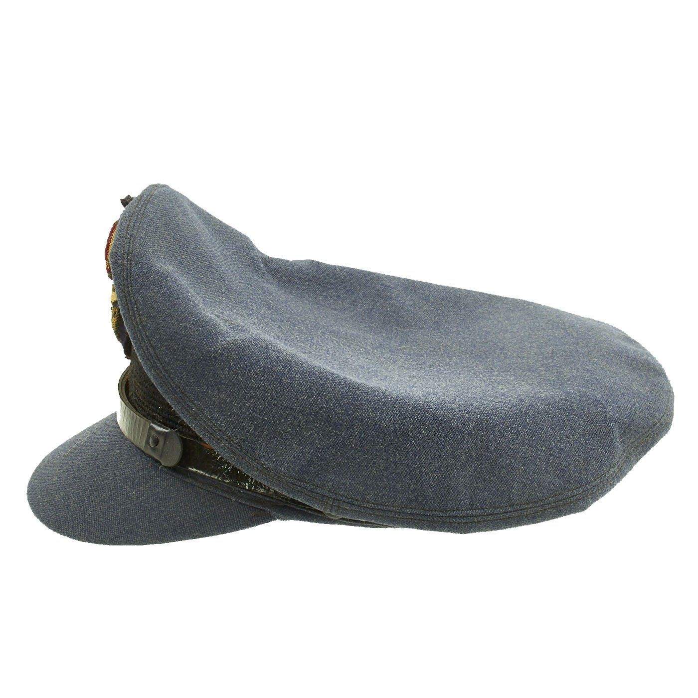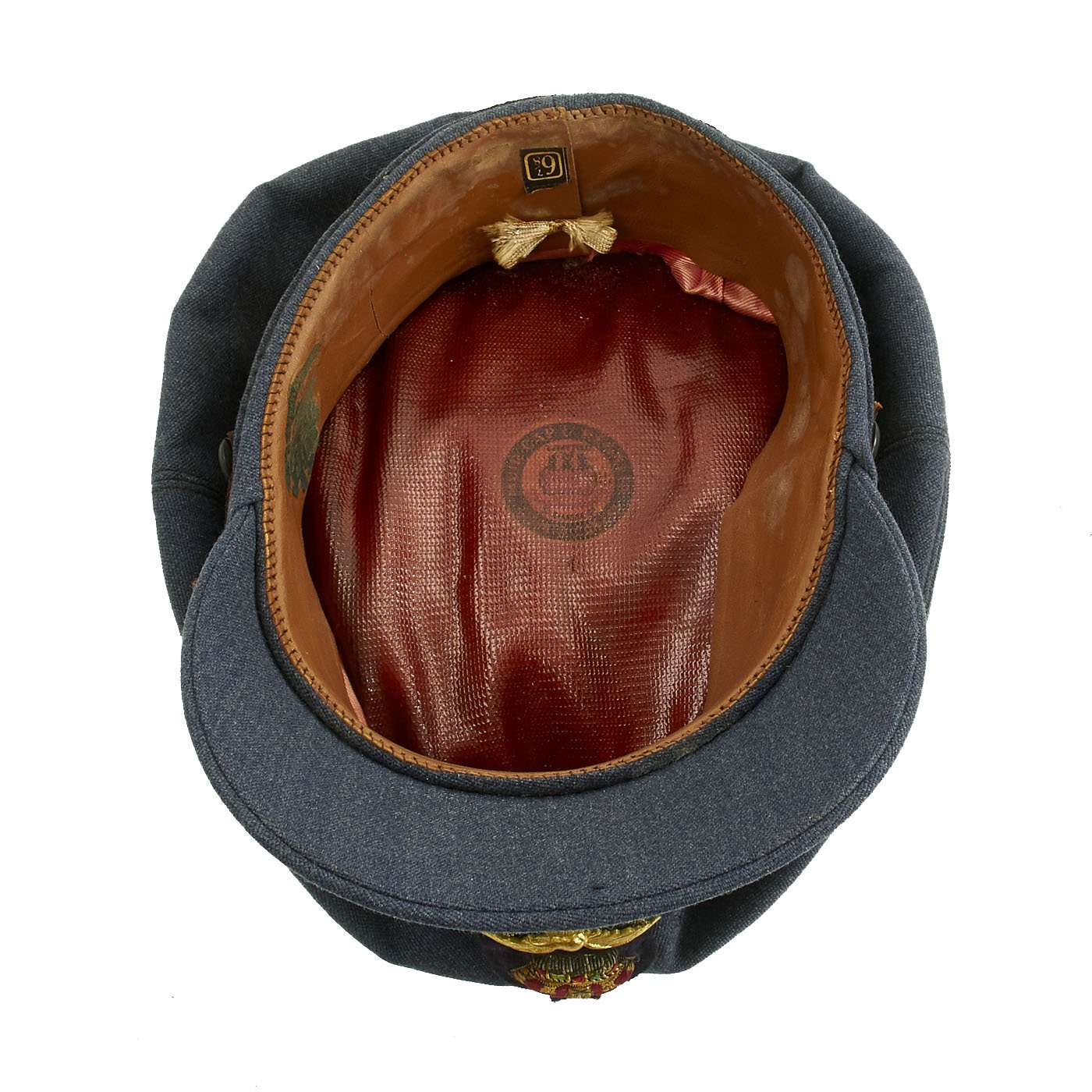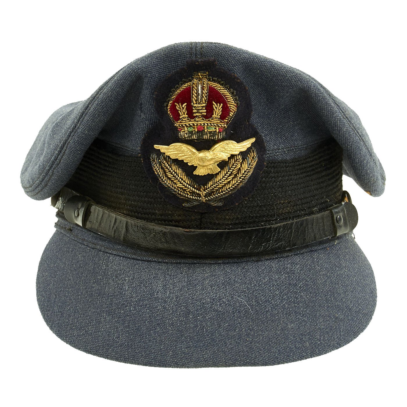 Original Item: Only One Available. This is a beautifully tailored RCAF officer's peaked visor cap dating from WWII. Constructed of blue barathea wool with black mohair band and lovely padded bullion embroidered King's Crown badge and laurels with gold wash metal eagle. The interior is in very good condition with a celluloid sweat guard lining intact to the crown and leather sweatband which is embossed with the makers name: