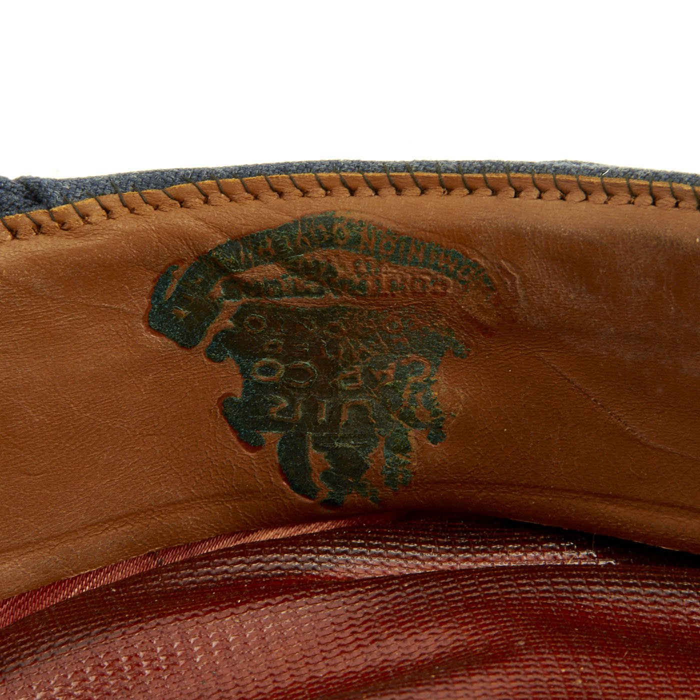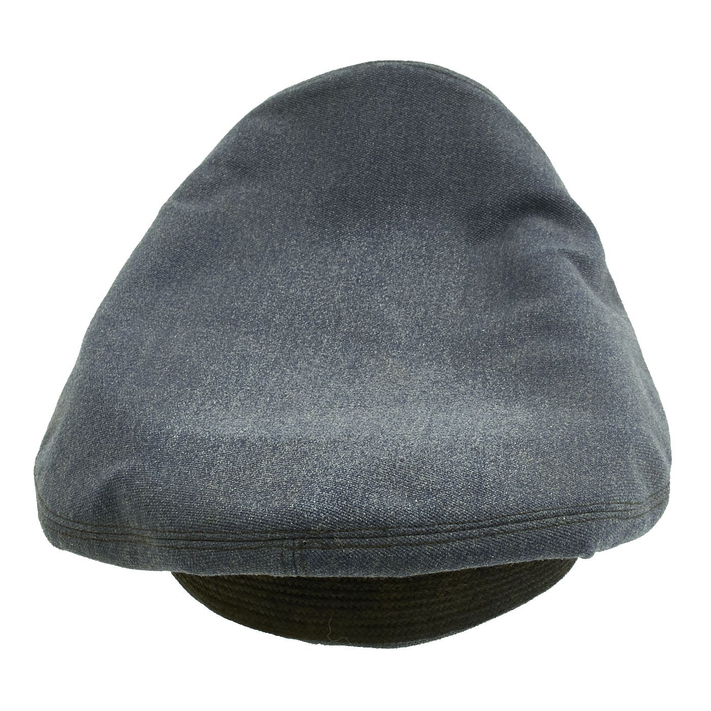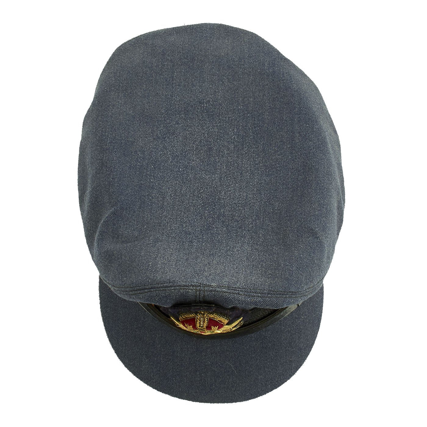 Original Item: Only One Available. This is a beautifully tailored RCAF officer's peaked visor cap dating from WWII. Constructed of blue barathea wool with black mohair band and lovely padded bullion embroidered King's Crown badge and laurels with gold wash metal eagle. The interior is in very good condition with a celluloid sweat guard lining intact to the crown and leather sweatband which is embossed with the makers name: