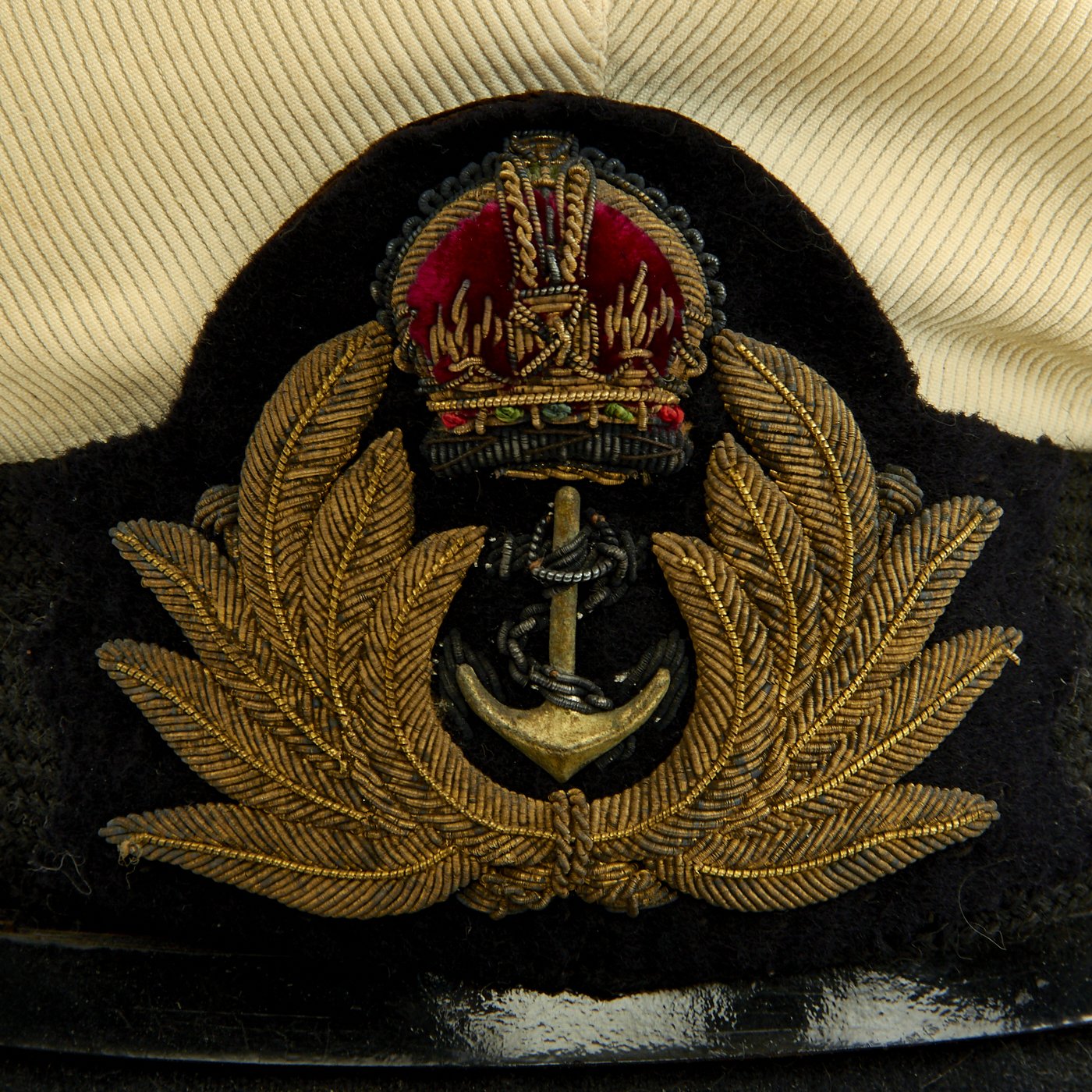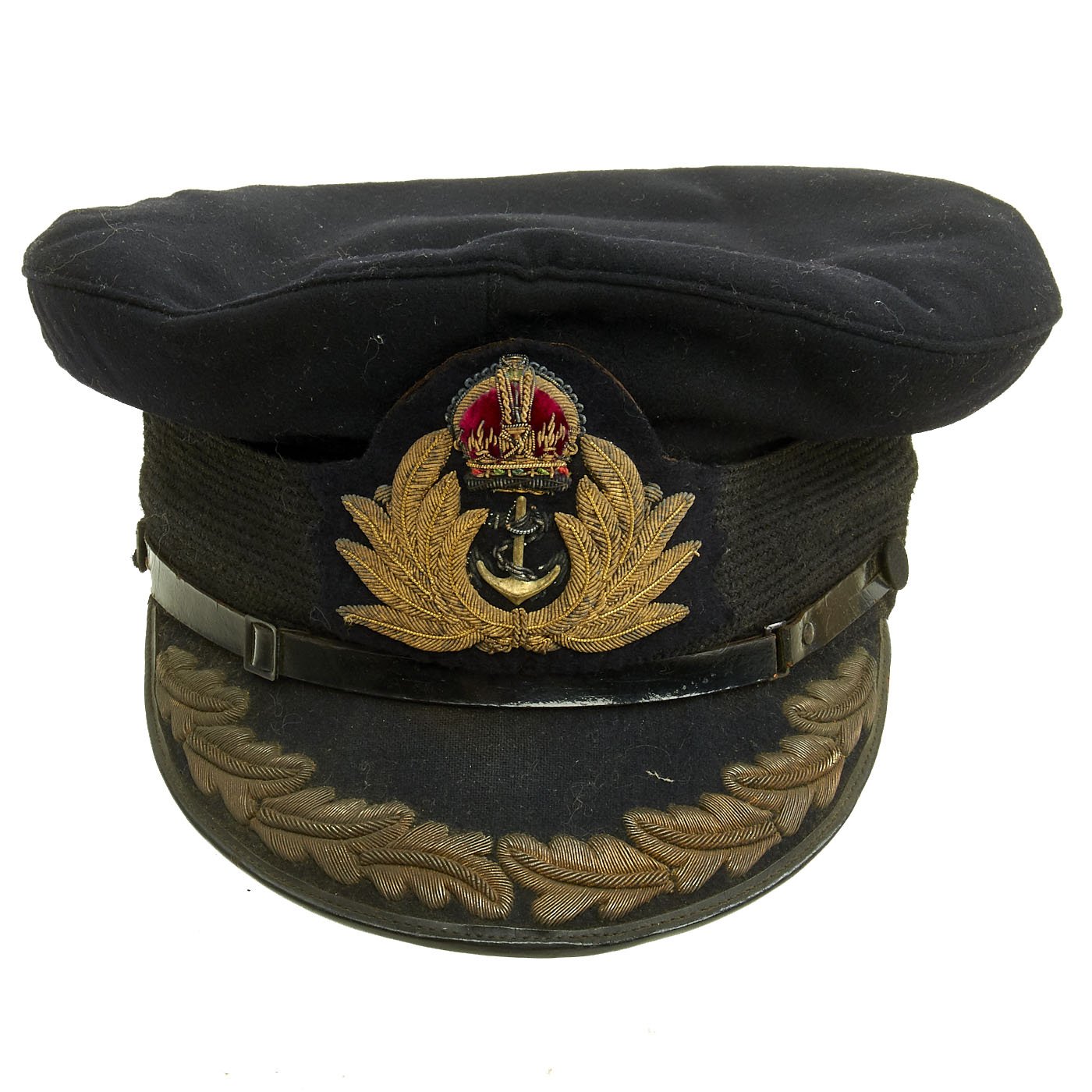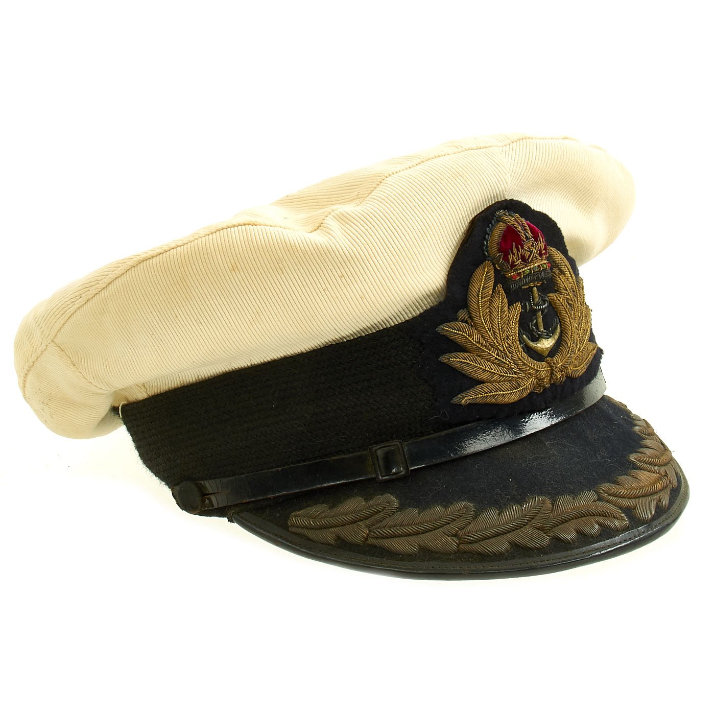 Original Item: Only One Available. This is a very nice British WWII Royal Navy Officer's Visor Cap, usually referred to as a "Peaked" cap in the U.K. It features the standard navy wool body, with some nice padding inside the crown to maintain the shape. It comes with i's correct with white cotton cover for use in the Tropics and the Summer months. The wool topped leather visor is heavily bullion wire embroidered with a single row of oak leaves around the edge, indicating a rank of Commodore 2nd Class, Captain or Commander. The black mohair hat band features bullion embroidered Kings Crown and brass anchor inside a lovely embroidered wreath.