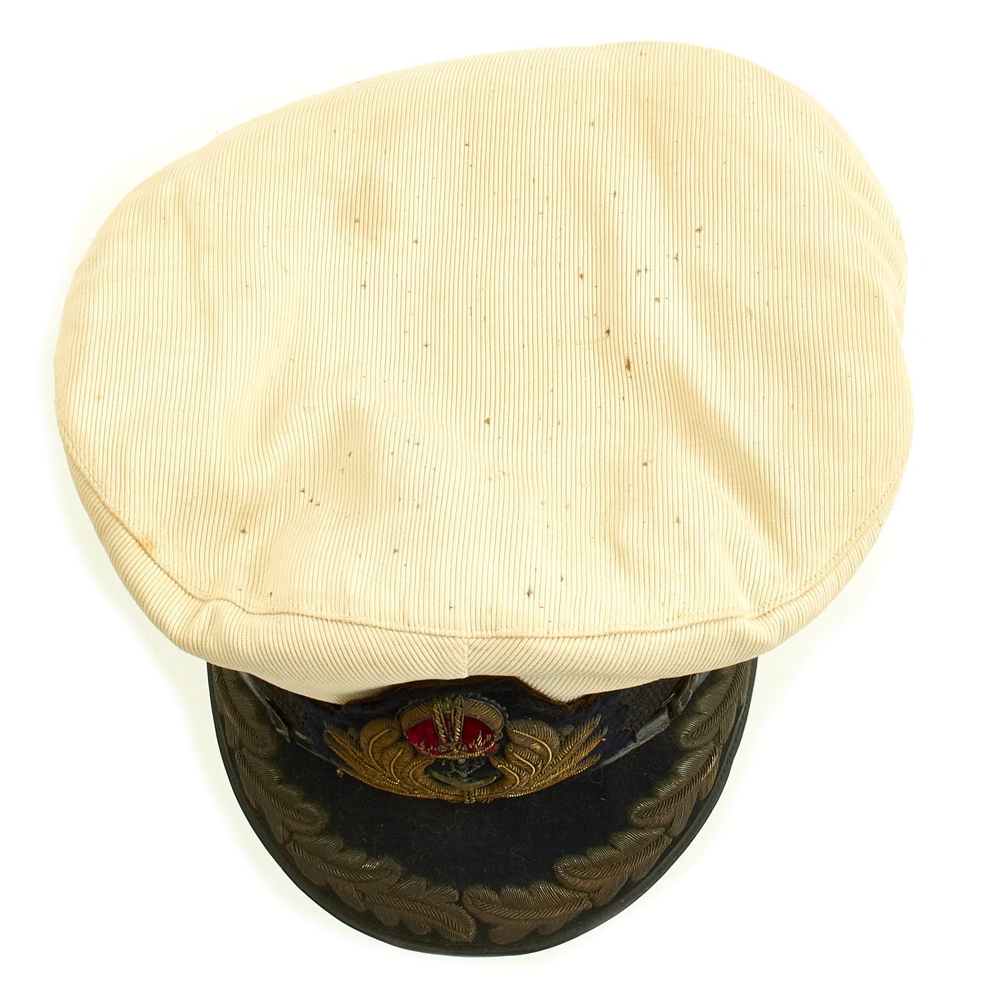 Overall condition of the hat is very good with typical signs of use and age. The cap cover has some age toning, and has been on the cap for a very long time, as the area behind the badge is still white. There is no size marked, but it seems to be around a size 7 1/4 - 7 3/8. We have had very few Royal Navy caps in the past, and they are very scarce on the market.