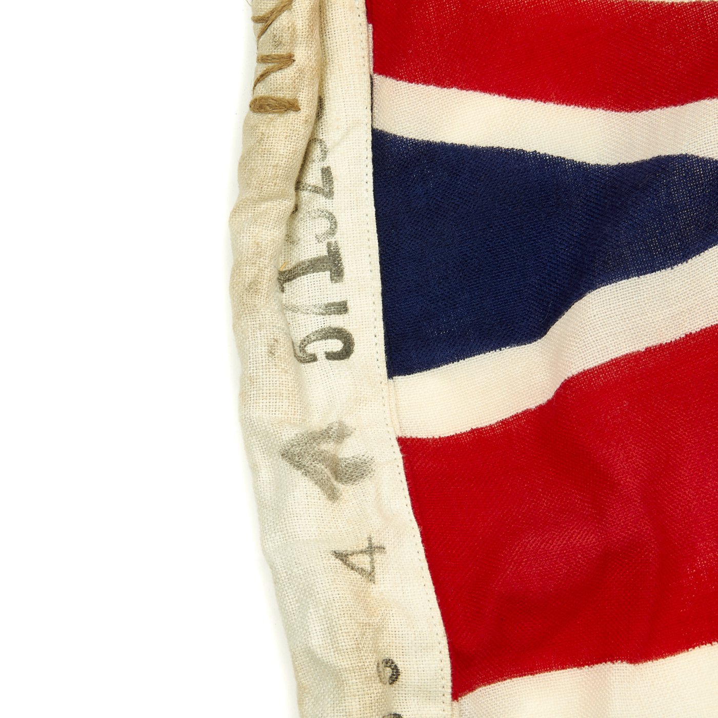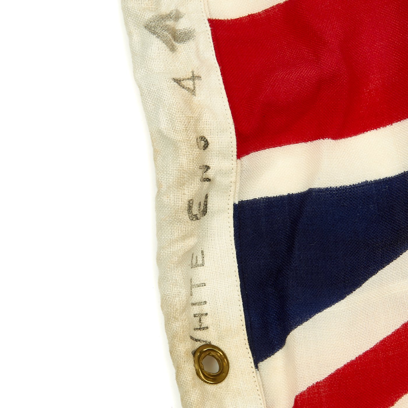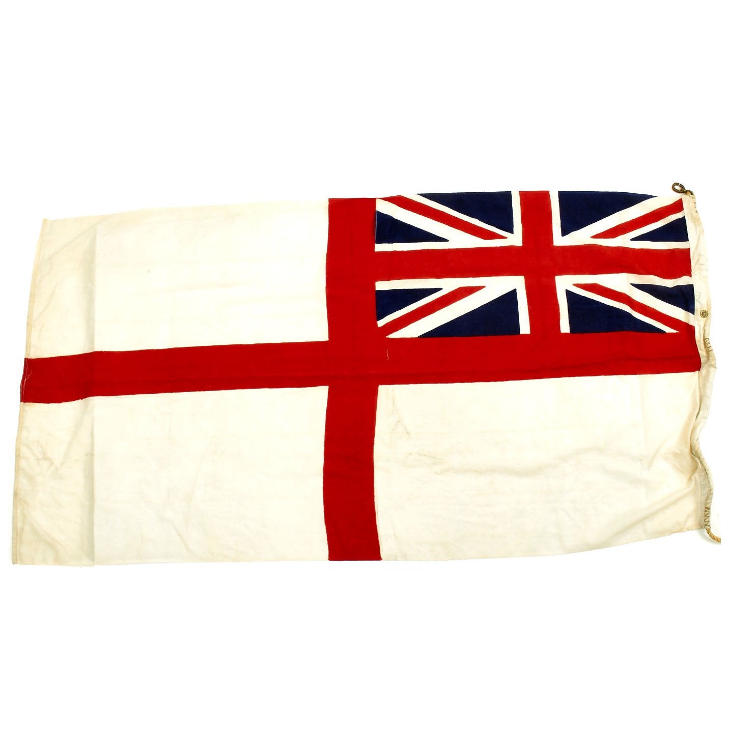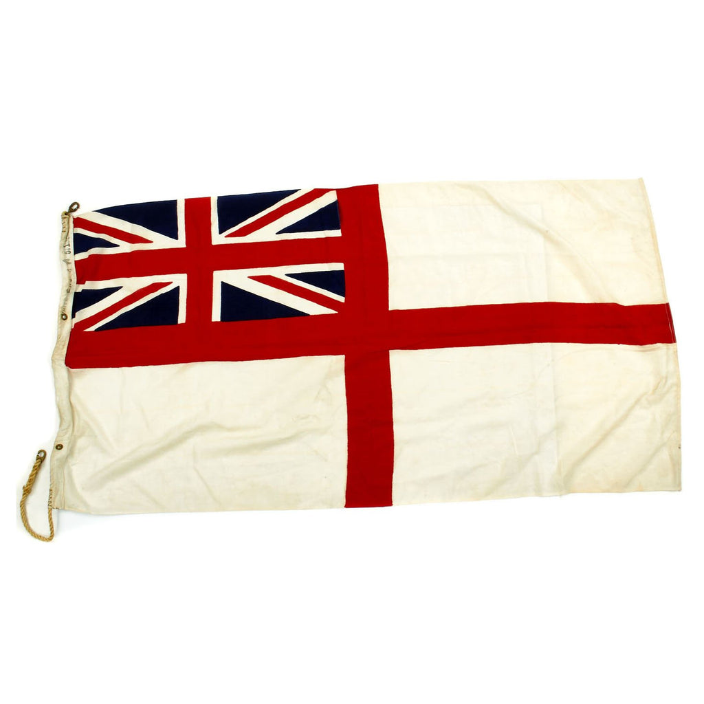 Original Item: Only One Available. This is a very nice Original British WORLD WAR TWO era Royal Navy White Ensign (flag), a type of flag used exclusively by the Royal Navy. It has a large cross of St. George in the "field" of the flag, with a British Union Jack in the upper left-hand "canton" next to the header. A very displayable large size of 71" x 36", this was probably used on a smaller ship, possibly a launch or patrol boat. The flag header is marked WHITE ENS 4 with a BROAD ARROW stamped together with production number 5713298.
