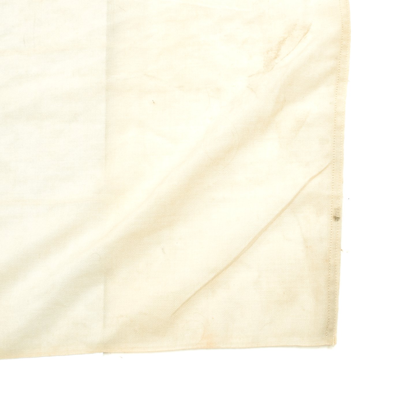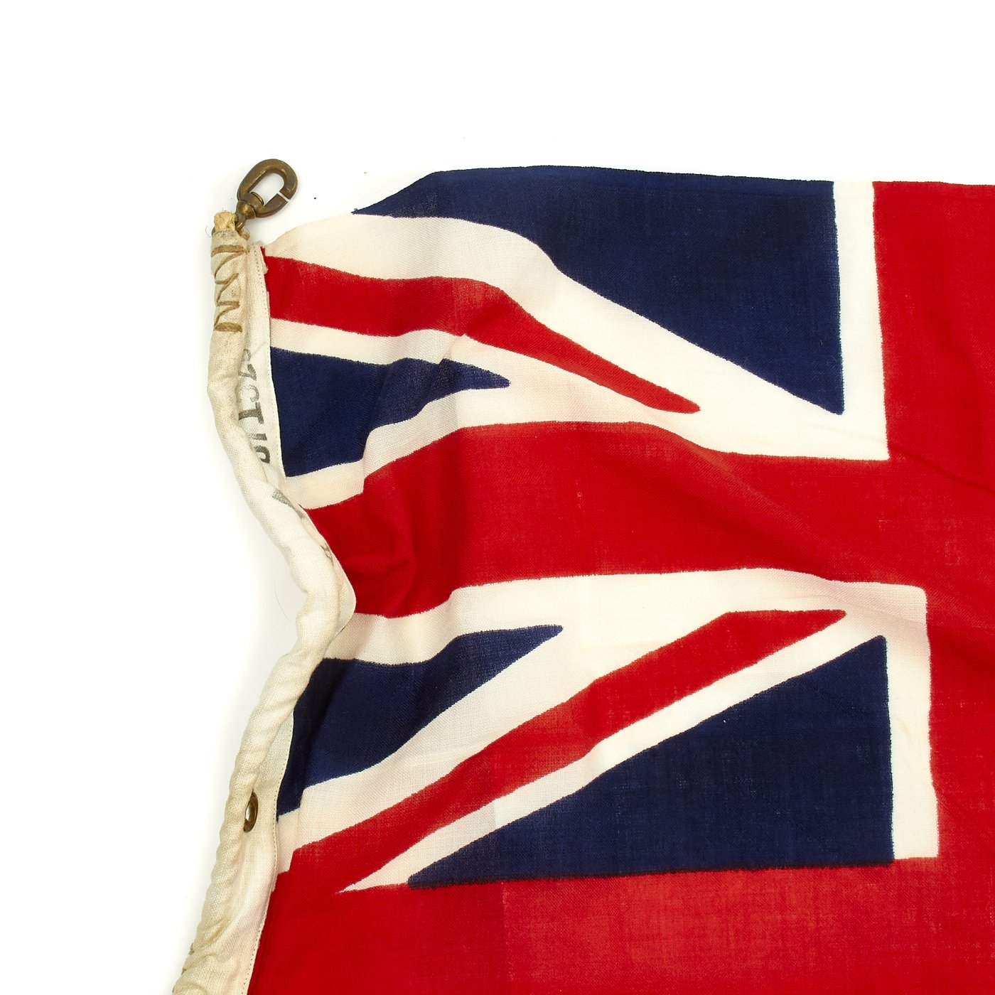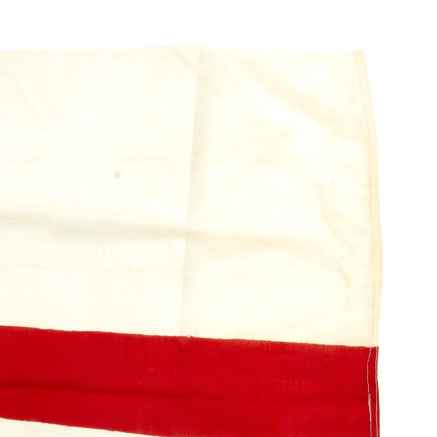 Original Item: Only One Available. This is a very nice Original British WORLD WAR TWO era Royal Navy White Ensign (flag), a type of flag used exclusively by the Royal Navy. It has a large cross of St. George in the "field" of the flag, with a British Union Jack in the upper left-hand "canton" next to the header. A very displayable large size of 71" x 36", this was probably used on a smaller ship, possibly a launch or patrol boat. The flag header is marked WHITE ENS 4 with a BROAD ARROW stamped together with production number 5713298.