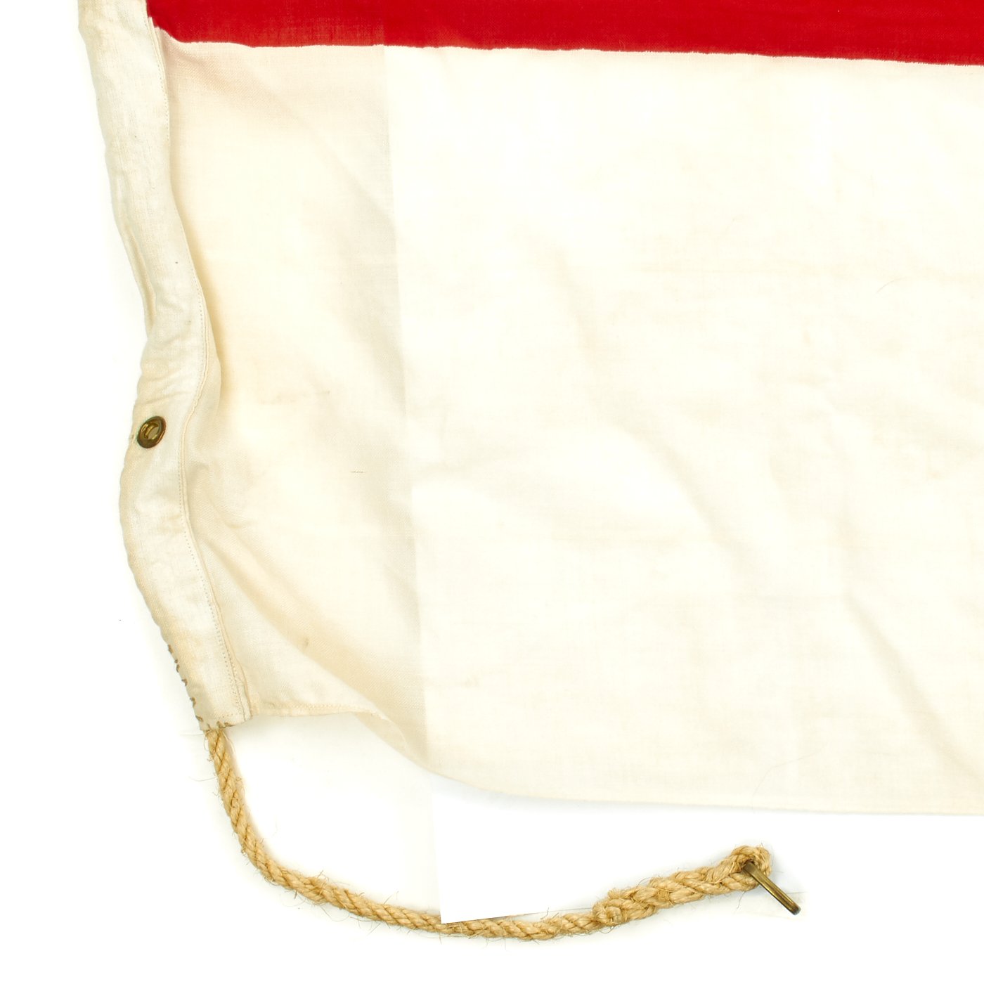 The flag appears free of Moth or other damage, and has clear colors with little bleed over. It definitely could use a good ironing, as it is creased from poor folding. In great condition, still has its intact hemp rope halyard, with brass clips at each end. Ready to display!