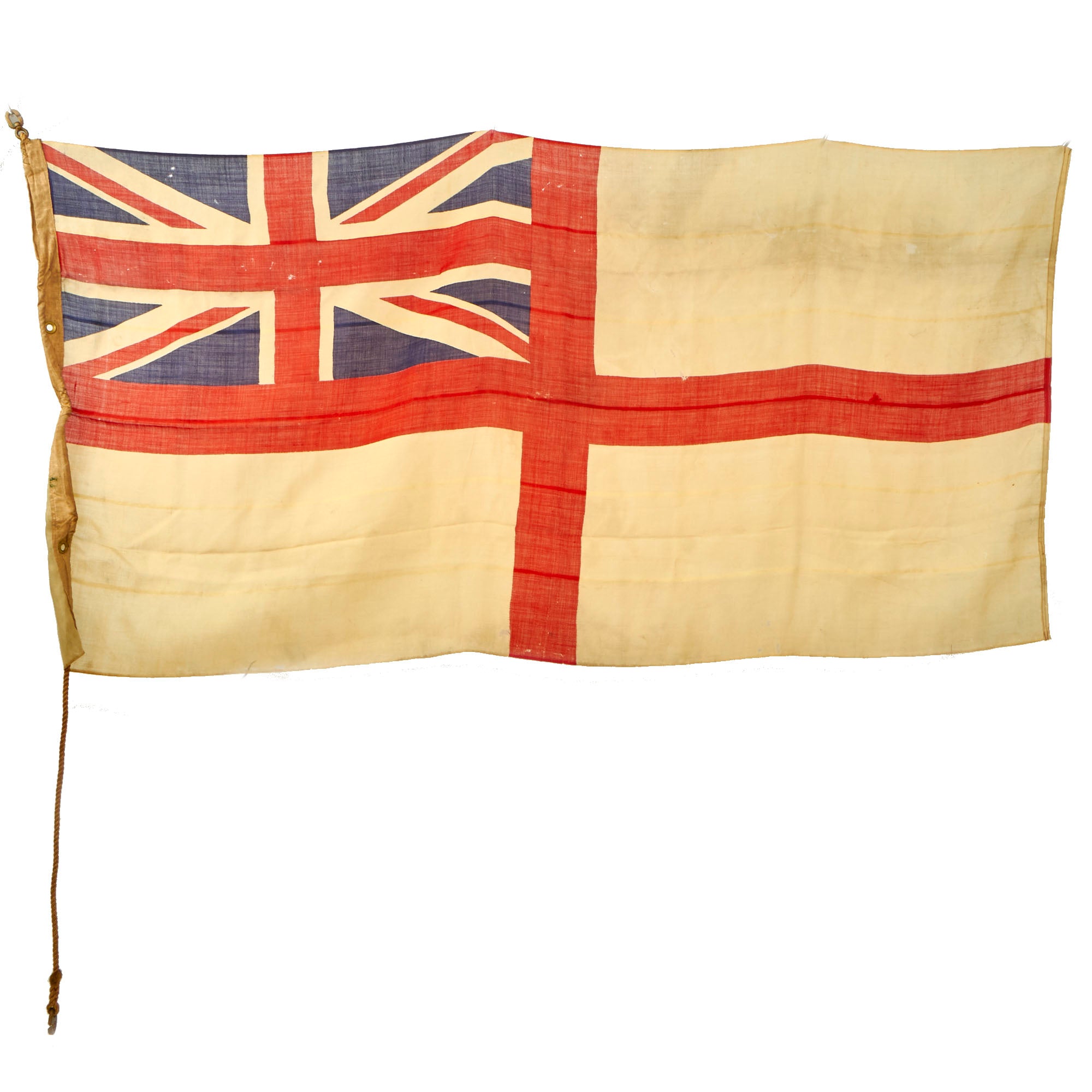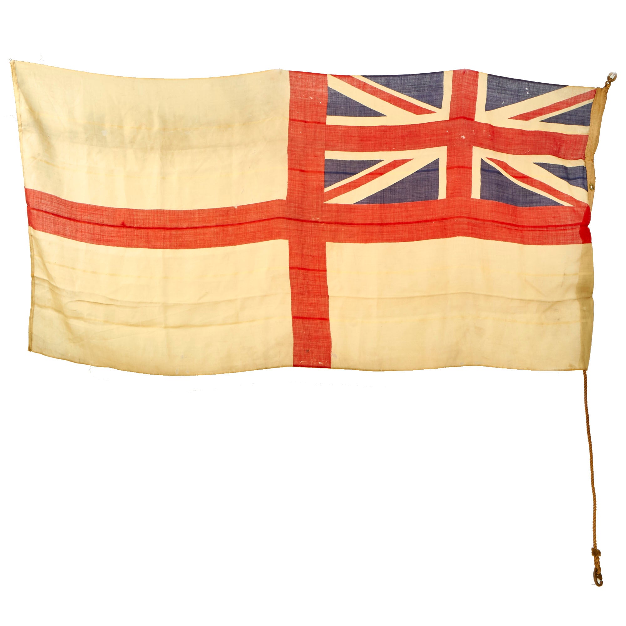 Original Item: Only One Available. This is a very nice Original British WWII era Royal Navy White Ensign (flag), a type of flag used exclusively by the Royal Navy. It has a large cross of St. George in the "field" of the flag, with a British Union Jack in the upper left-hand "canton" next to the header. A very displayable large size of 73" x 36", this was probably used on a smaller ship, possibly a launch or patrol boat.