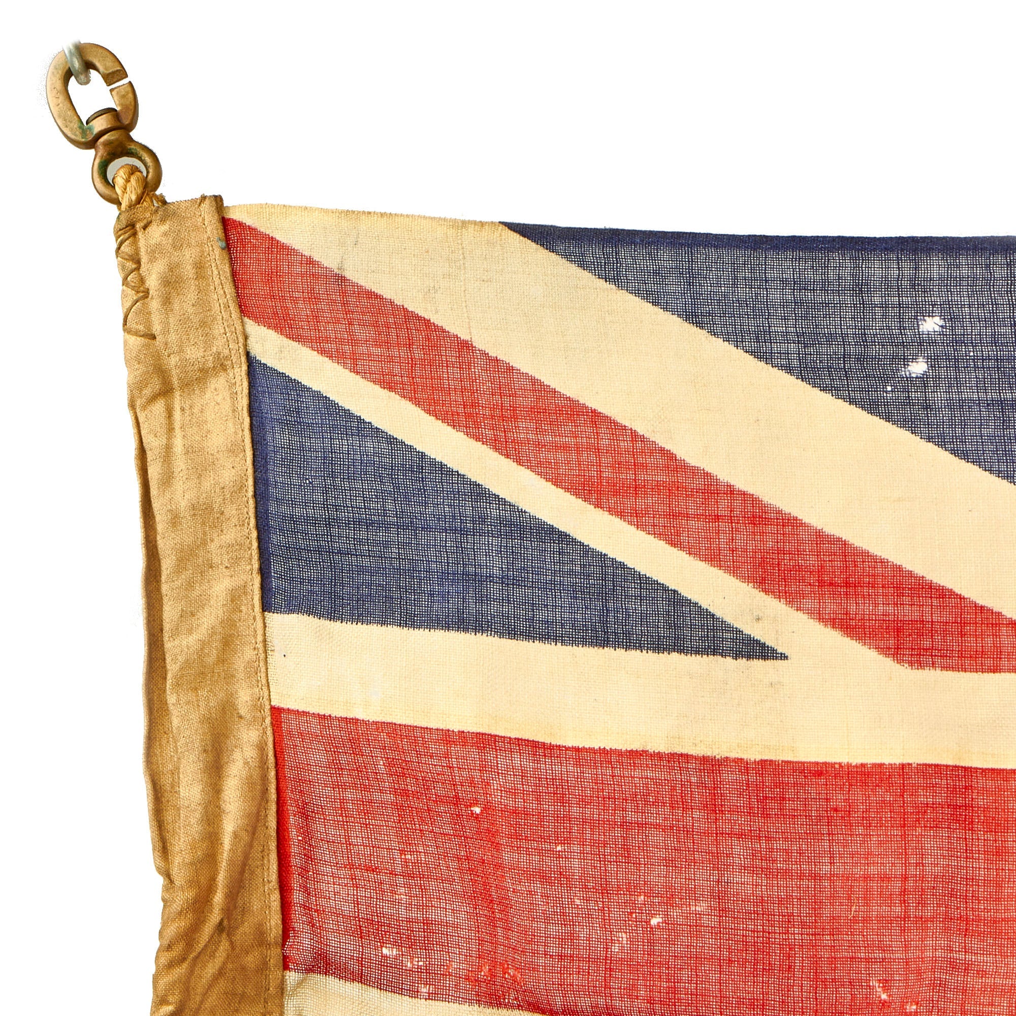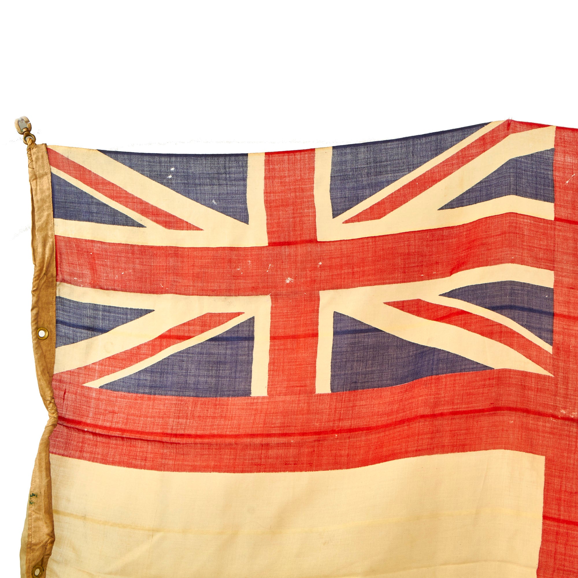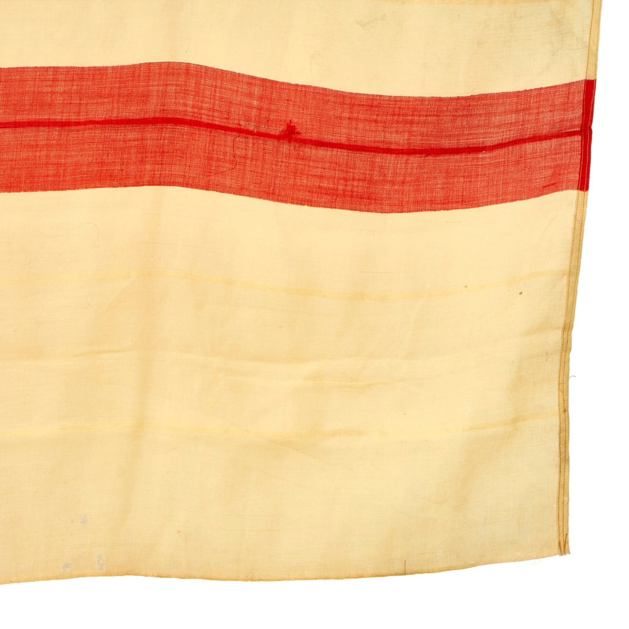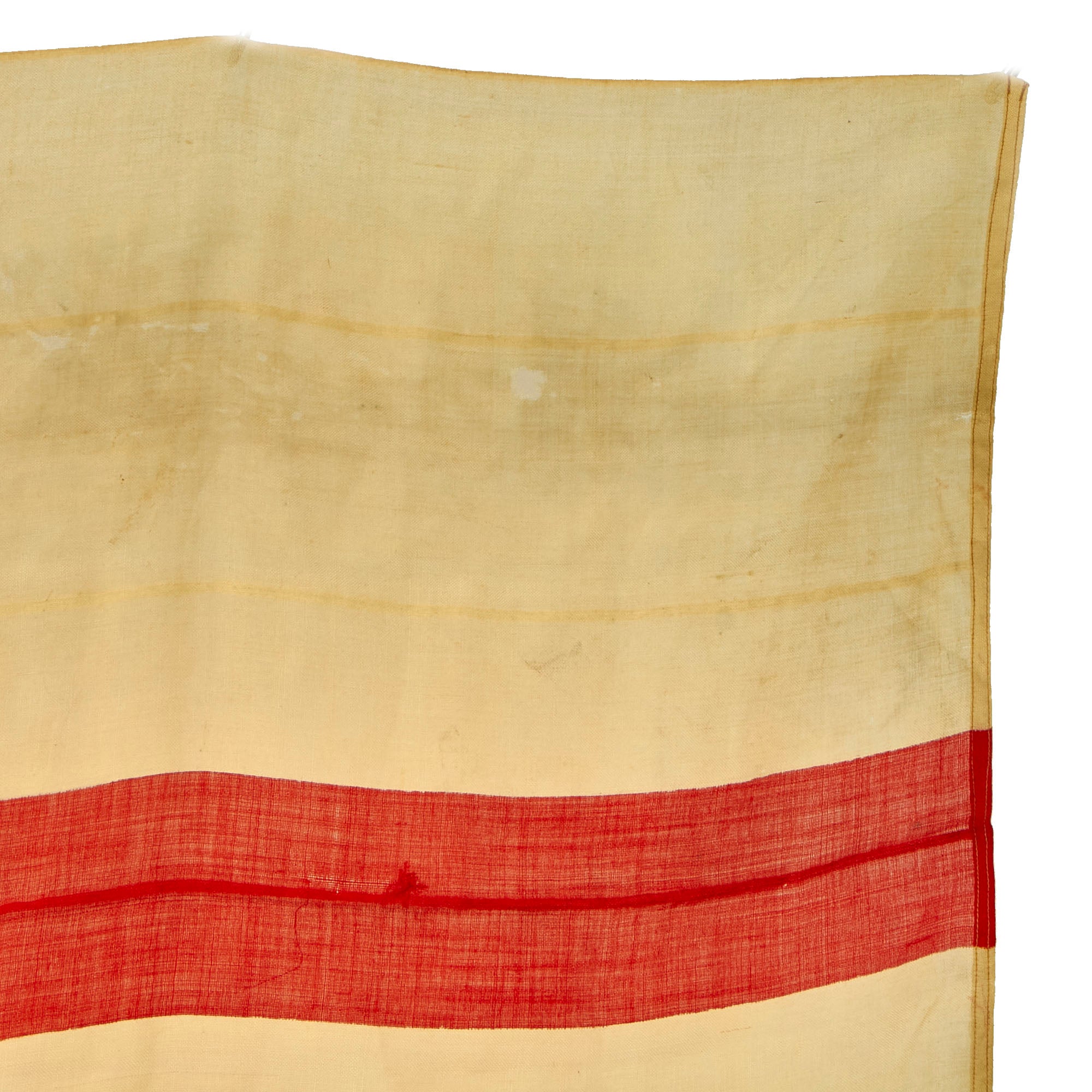 The flag does appear to have seen long service, as it has faded to a tan color. It appears to be made of wool, with a canvas header. There are some tears and places it has worn through, as well as possibly a bit of moth damage.