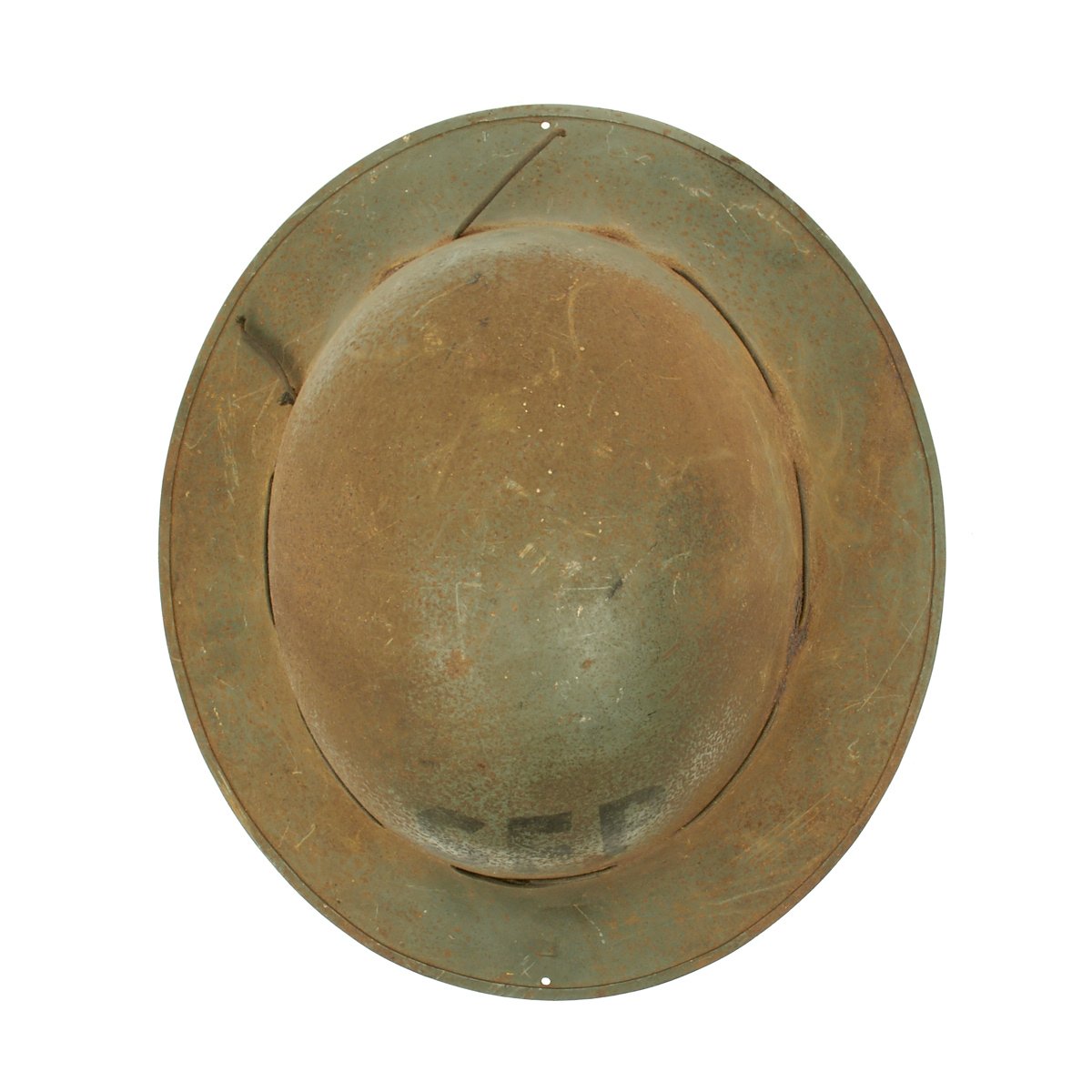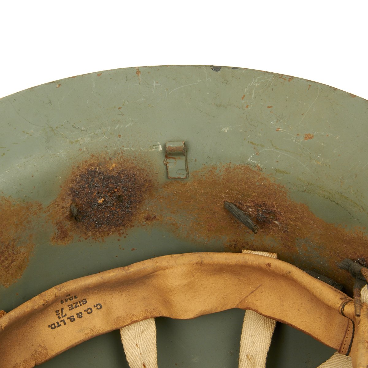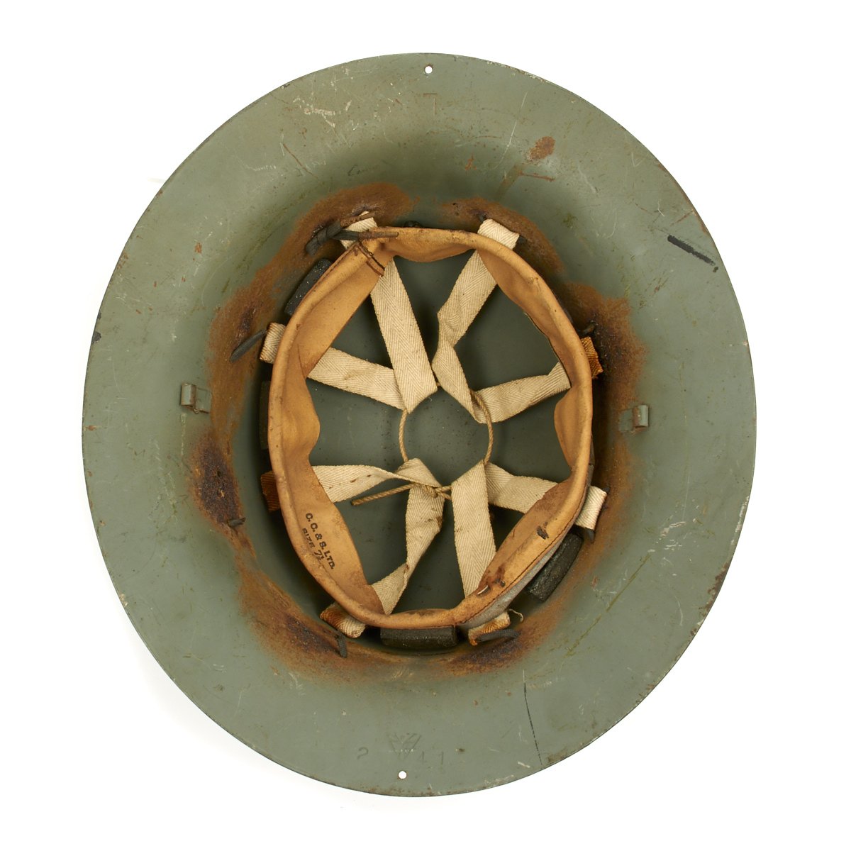 It is in good condition with original paint and liner. The liner and attachment cord are in decent condition, though the chin strap is unfortunately absent. The Liner is marked C.C. & S. LTD / SIZE 7 1/4 / 1941, and has had some of the rubber pads degrade over time. Also the liner attachment string has mostly rotted out due to moisture or a reaction with the steel. A nice example of home front headgear from the blitz!