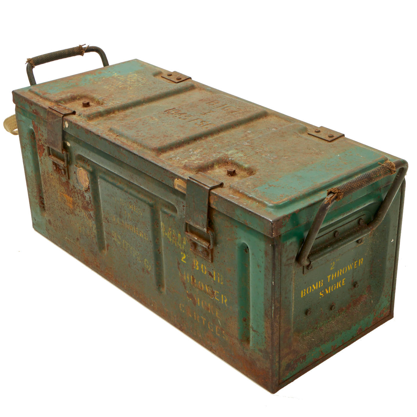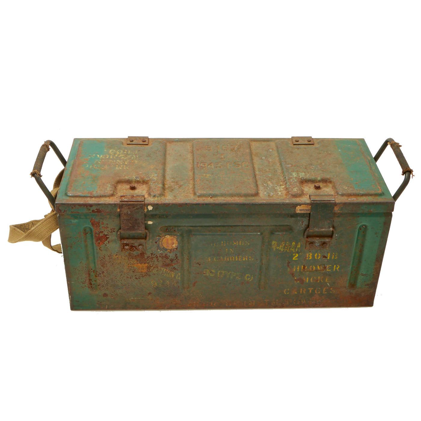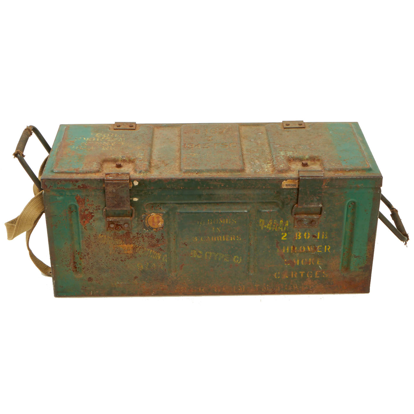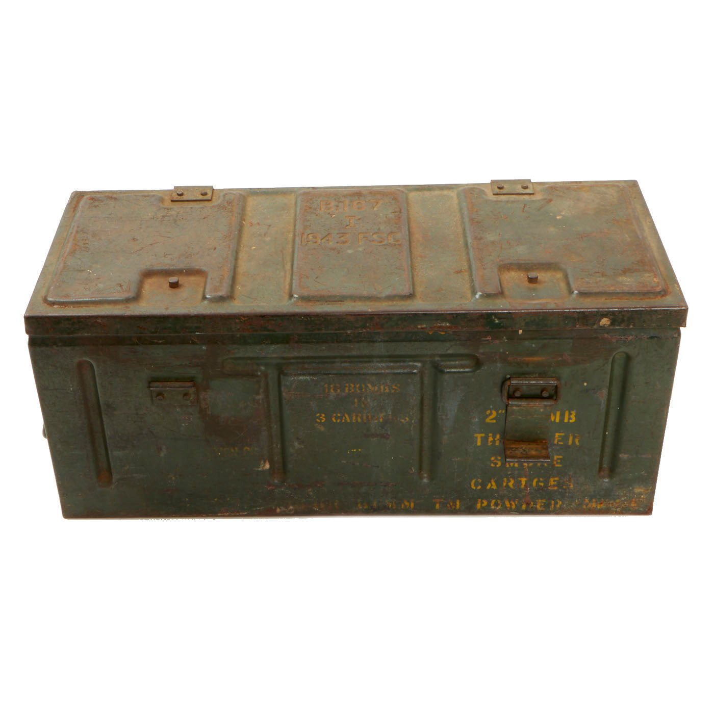 - Two Mortar Bomb Ammunition Chests. Both Dated 1943. Both retain their original paint, with stenciled markings in yellow. Original paper labels are still affixed to either box as well. Both boxes were intended to carry eighteen mortar bombs in cardboard tubes.