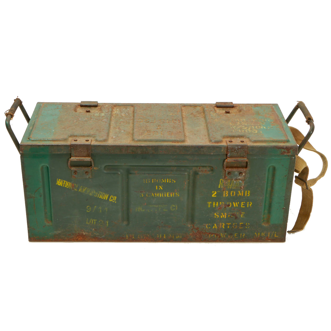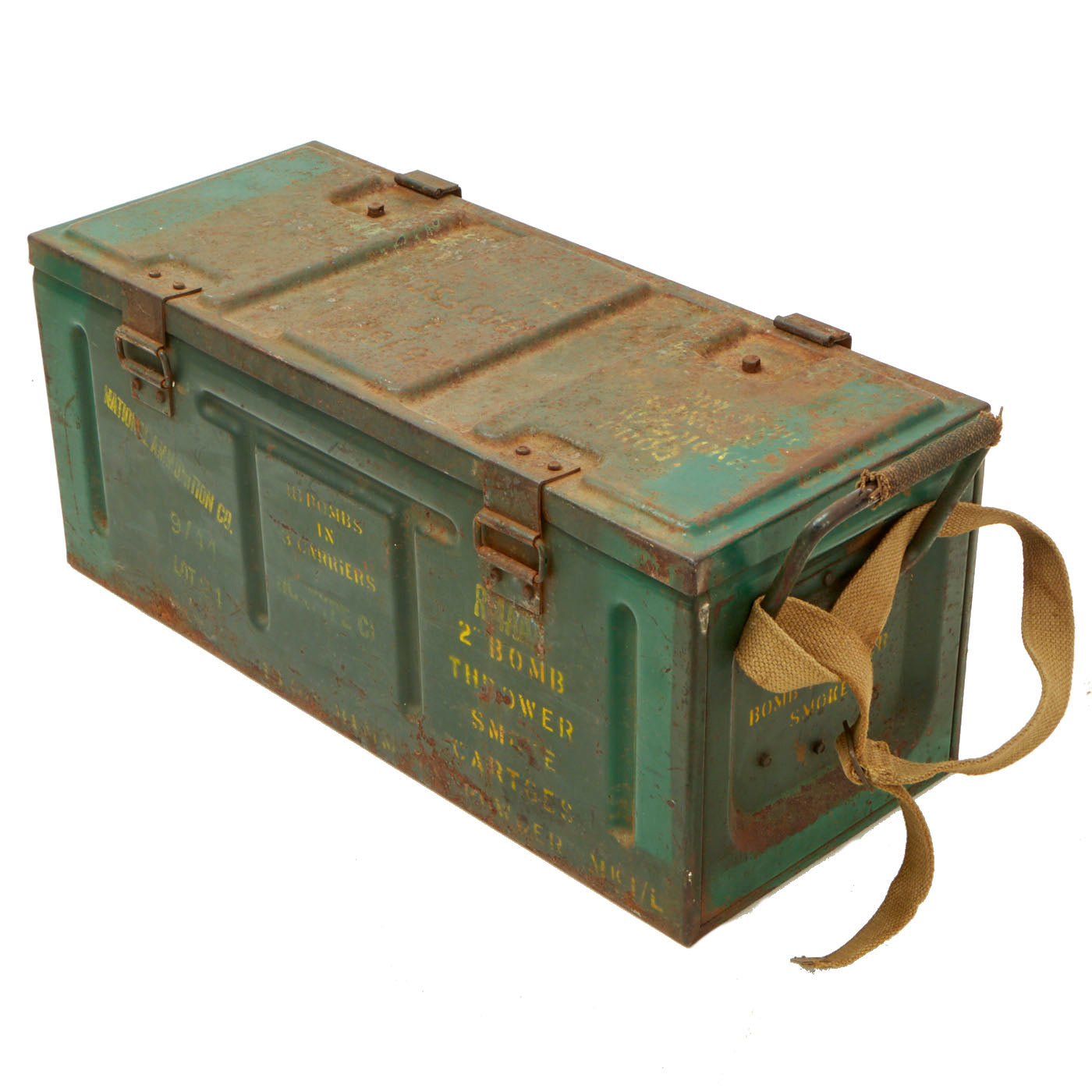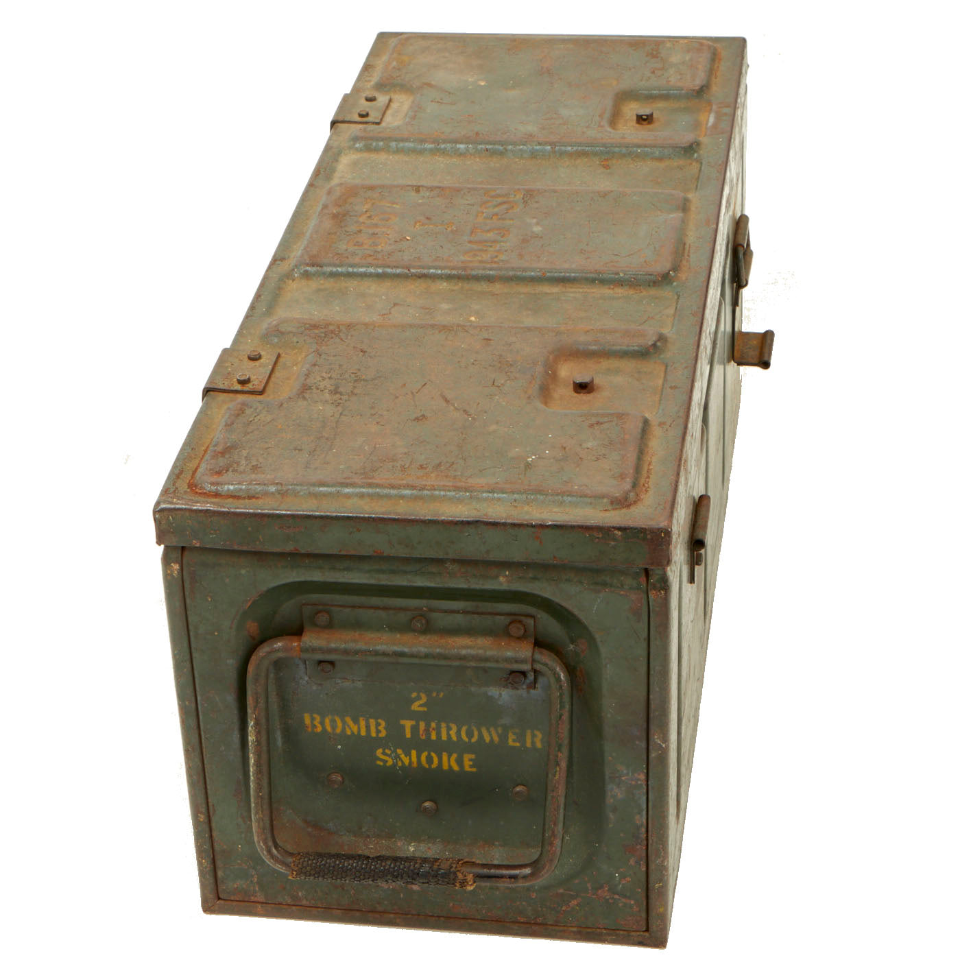 - Two Mortar Bomb Ammunition Chests. Both Dated 1943. Both retain their original paint, with stenciled markings in yellow. Original paper labels are still affixed to either box as well. Both boxes were intended to carry eighteen mortar bombs in cardboard tubes.