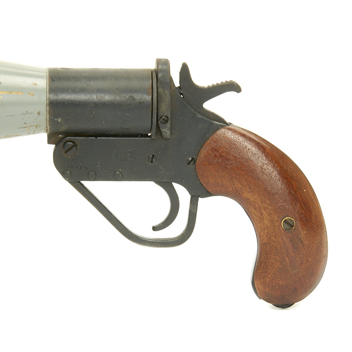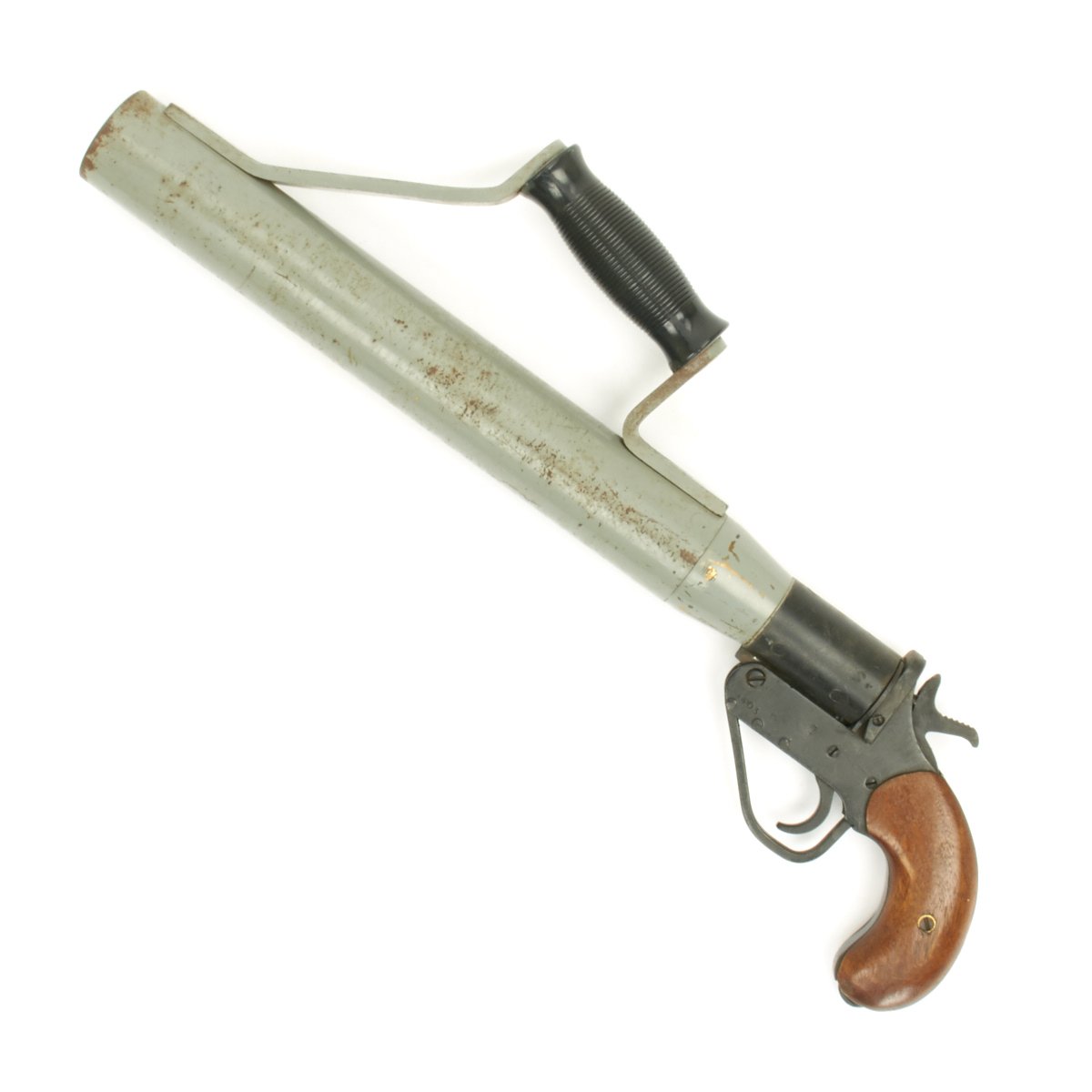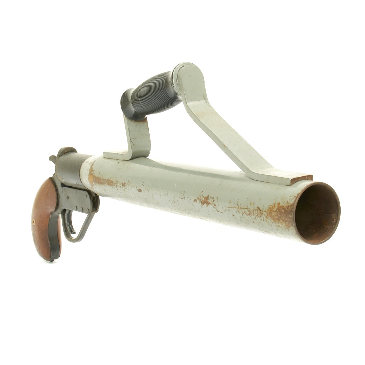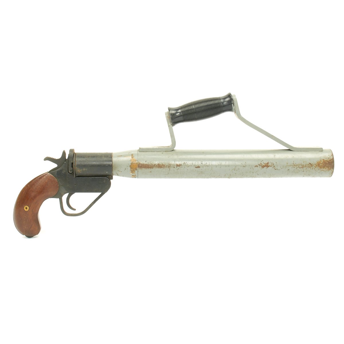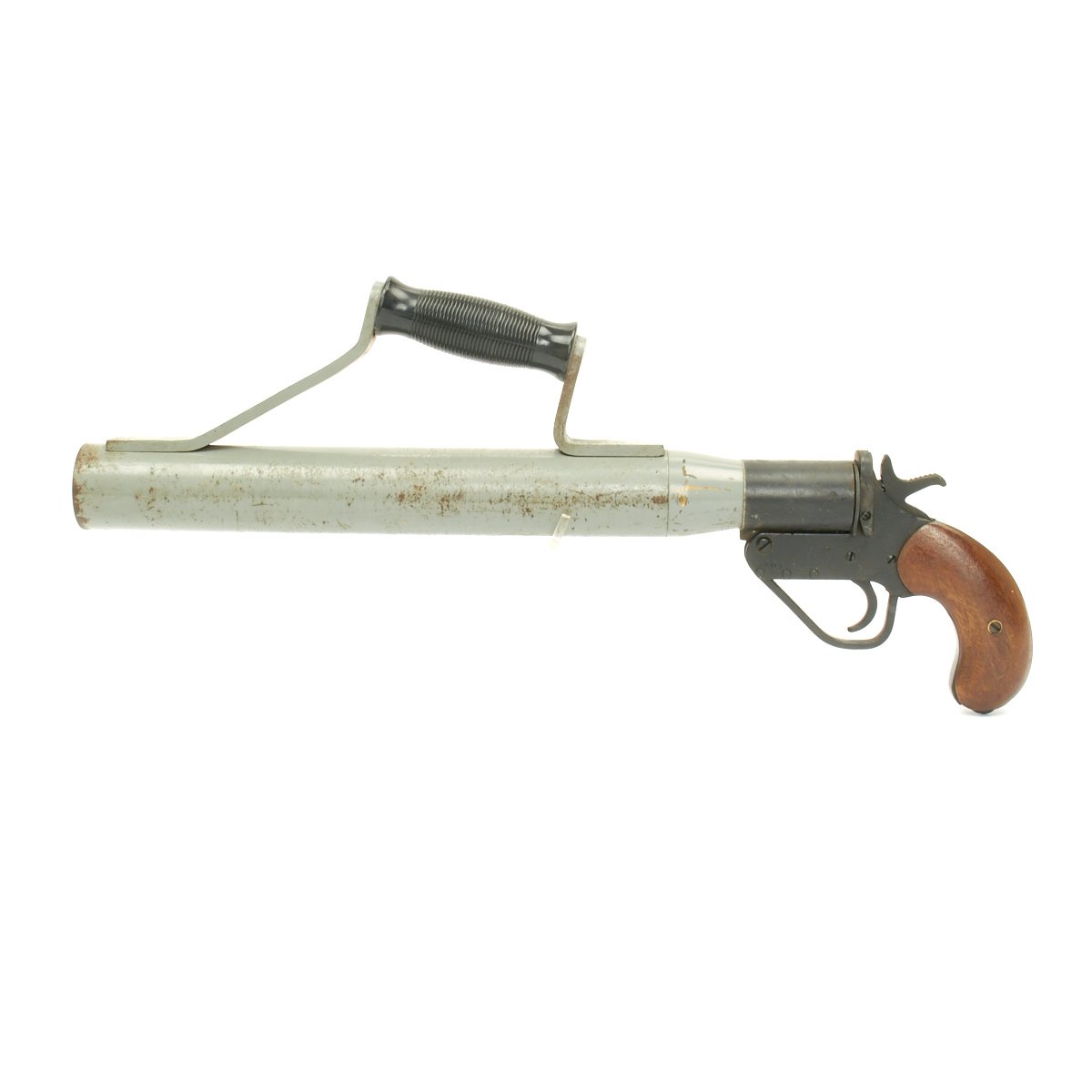This is a Schermuly Line Throwing Rocket Pistol has a steel frame with brass chamber the rocket tube, or barrel, is steel. It has mahogany grips and a Bakelite secondary handle, and there are British proof marks on the chamber and frame, the chamber is also marked 1" which is the cartridge size. Overall, the pistol is in very good condition.