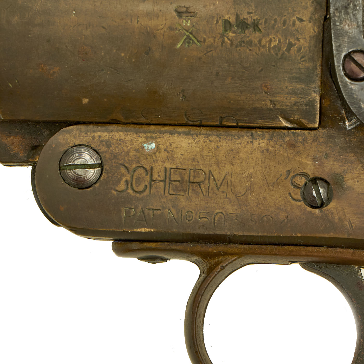 This Schermuly Line Throwing Rocket Pistol has a brass frame and chamber, while the rocket tube, or barrel, is steel. It has mahogany grips and a ribbed Bakelite secondary handle, and there are British proof marks on the chamber and frame. It is also marked with serial number 18648 on the barrel and frame, and has patent information on the left side of the frame. Overall, the pistol is in very good condition, and still has the original Schermuly orange label under the grip.