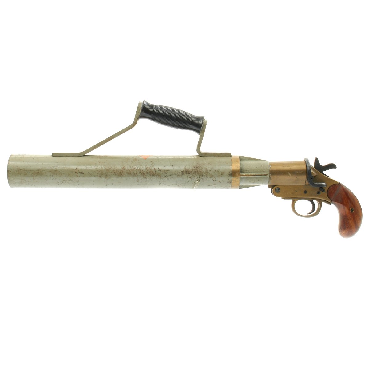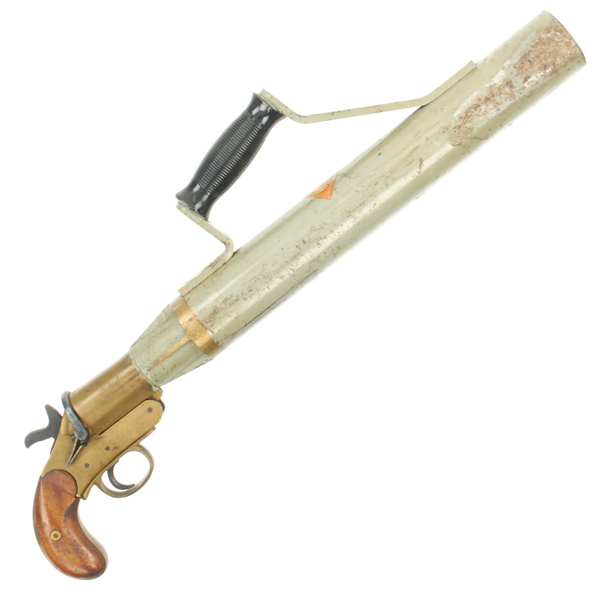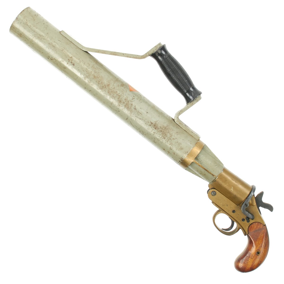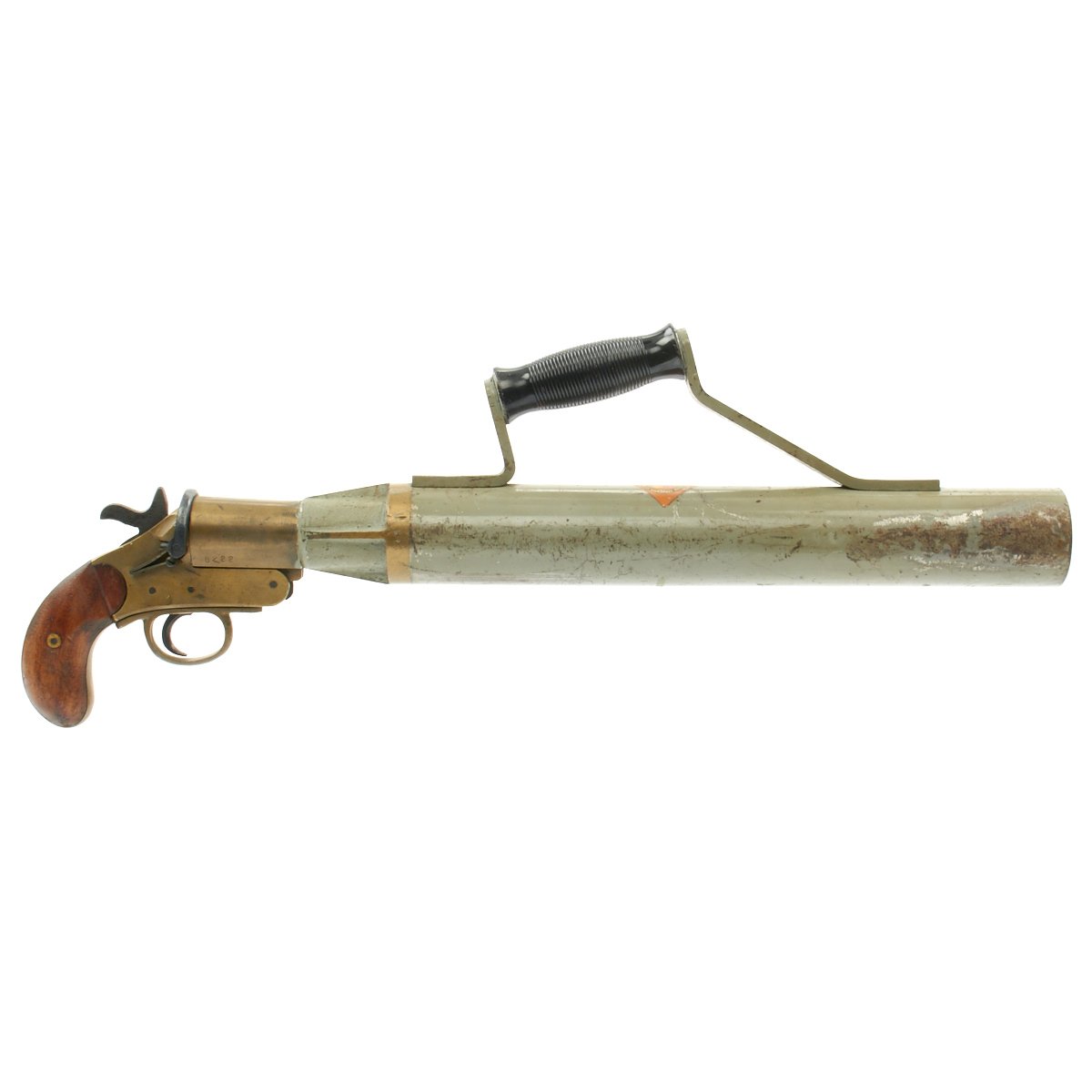 This Schermuly Line Throwing Rocket Pistol has a brass frame and chamber, while the rocket tube, or barrel, is steel. It has mahogany grips and a ribbed Bakelite secondary handle, and there are British proof marks on the chamber and frame. It is also marked with serial number 8222 on the barrel and frame, and has patent information on the left side of the frame. Overall, the pistol is in very good condition, and still has the original Schermuly orange label under the grip.