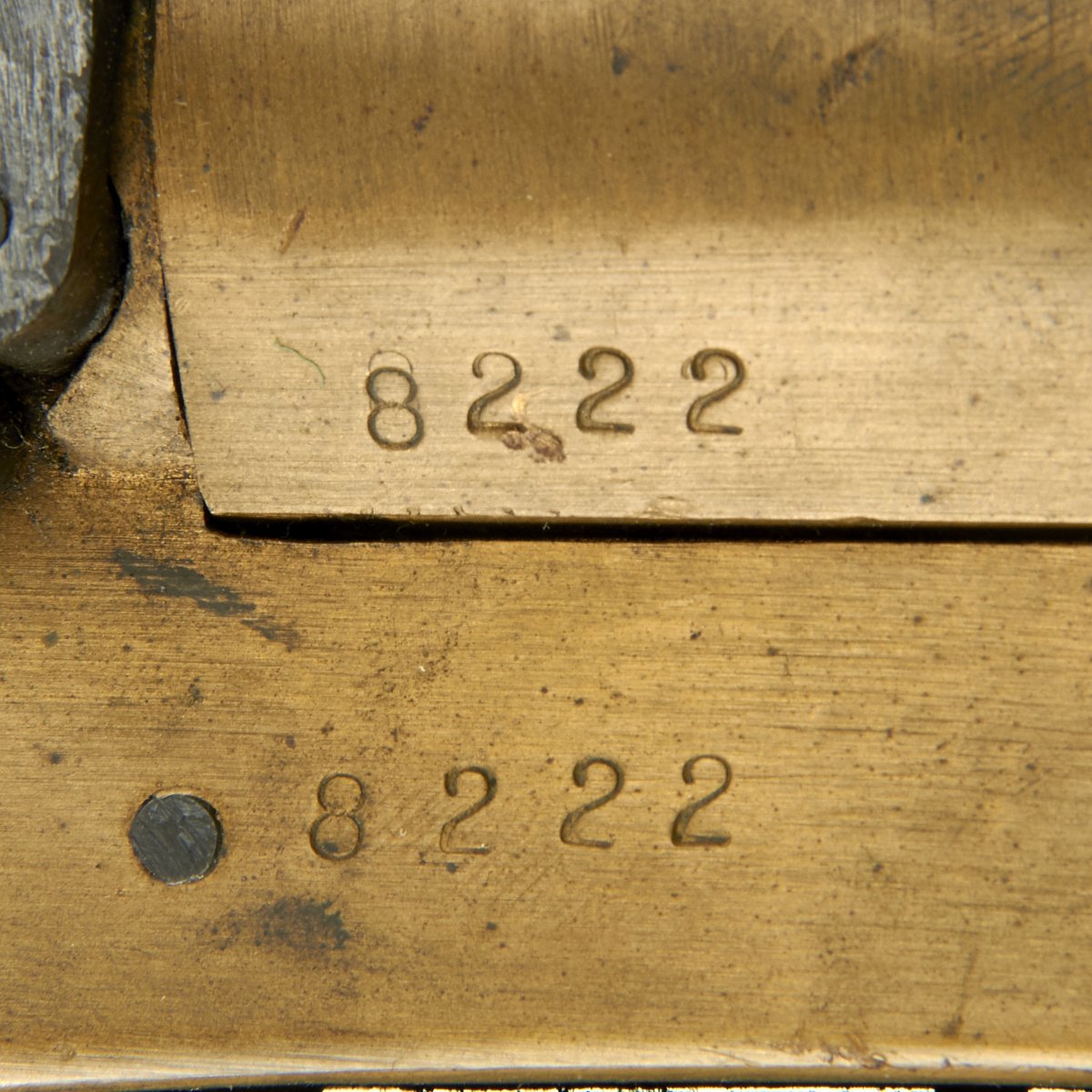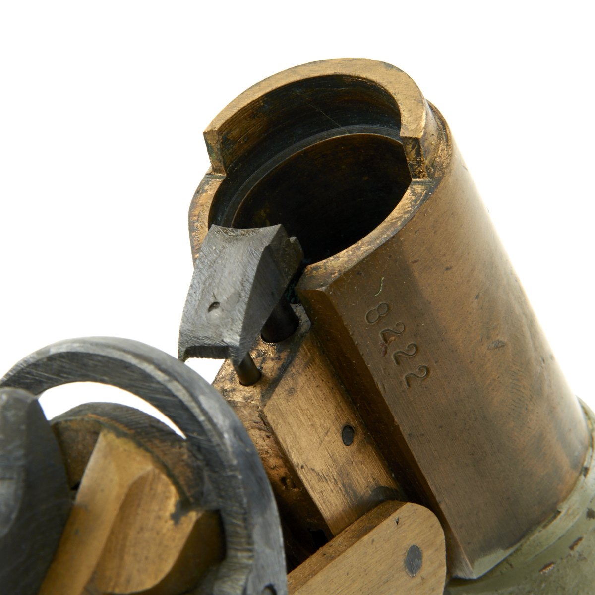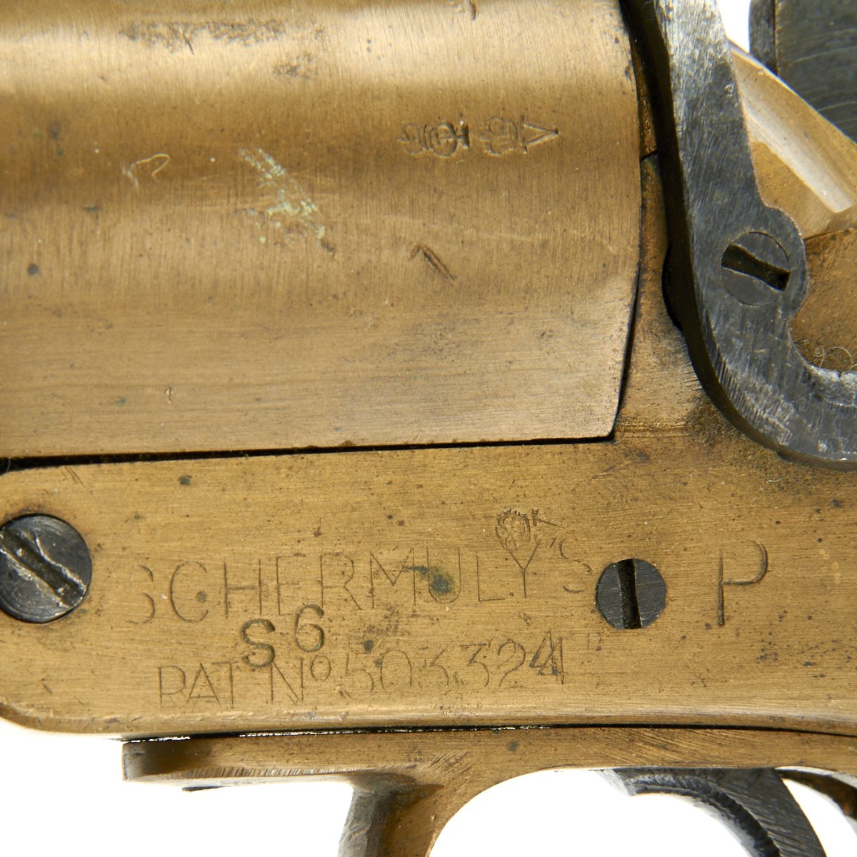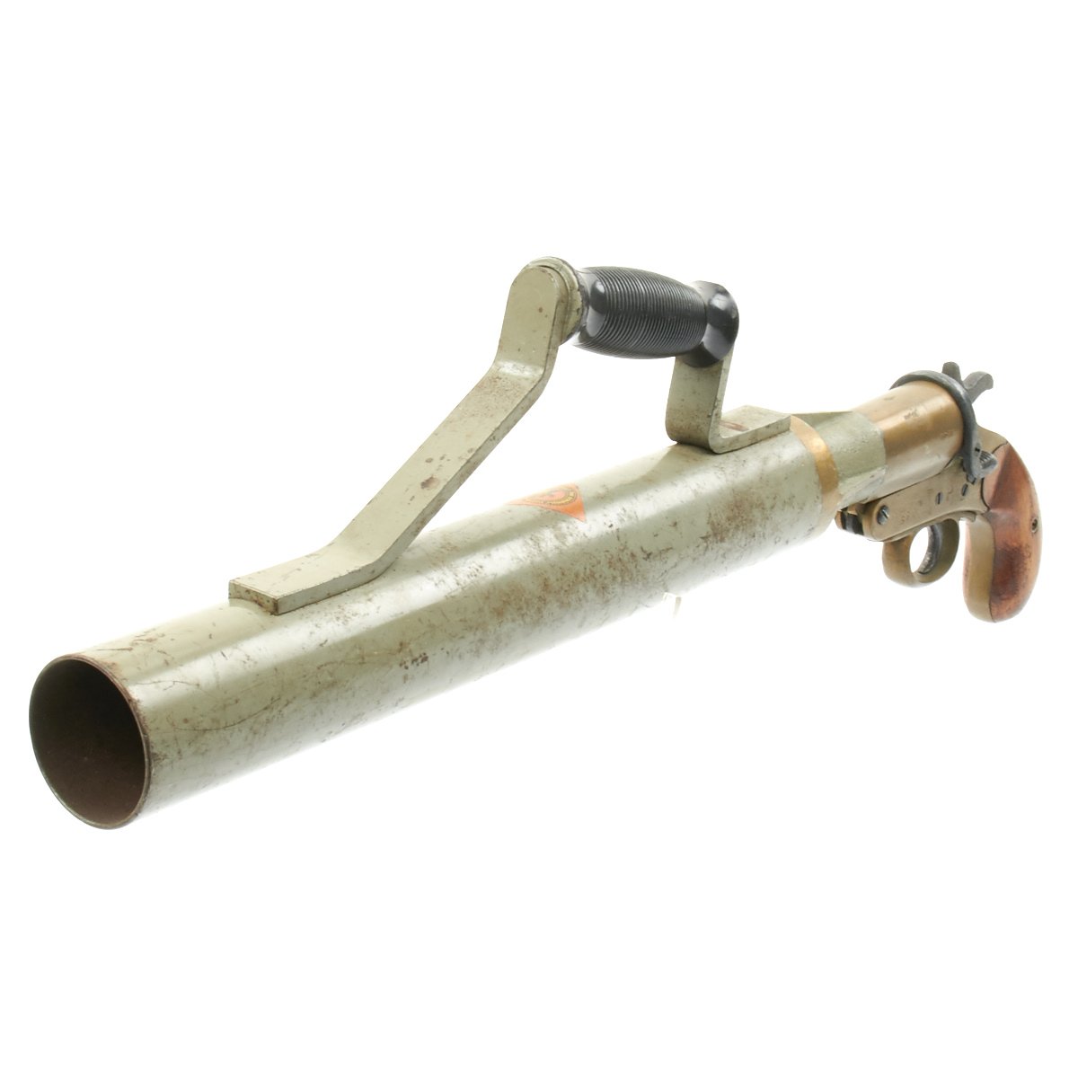 This Schermuly Line Throwing Rocket Pistol has a brass frame and chamber, while the rocket tube, or barrel, is steel. It has mahogany grips and a ribbed Bakelite secondary handle, and there are British proof marks on the chamber and frame. It is also marked with serial number 8222 on the barrel and frame, and has patent information on the left side of the frame. Overall, the pistol is in very good condition, and still has the original Schermuly orange label under the grip.