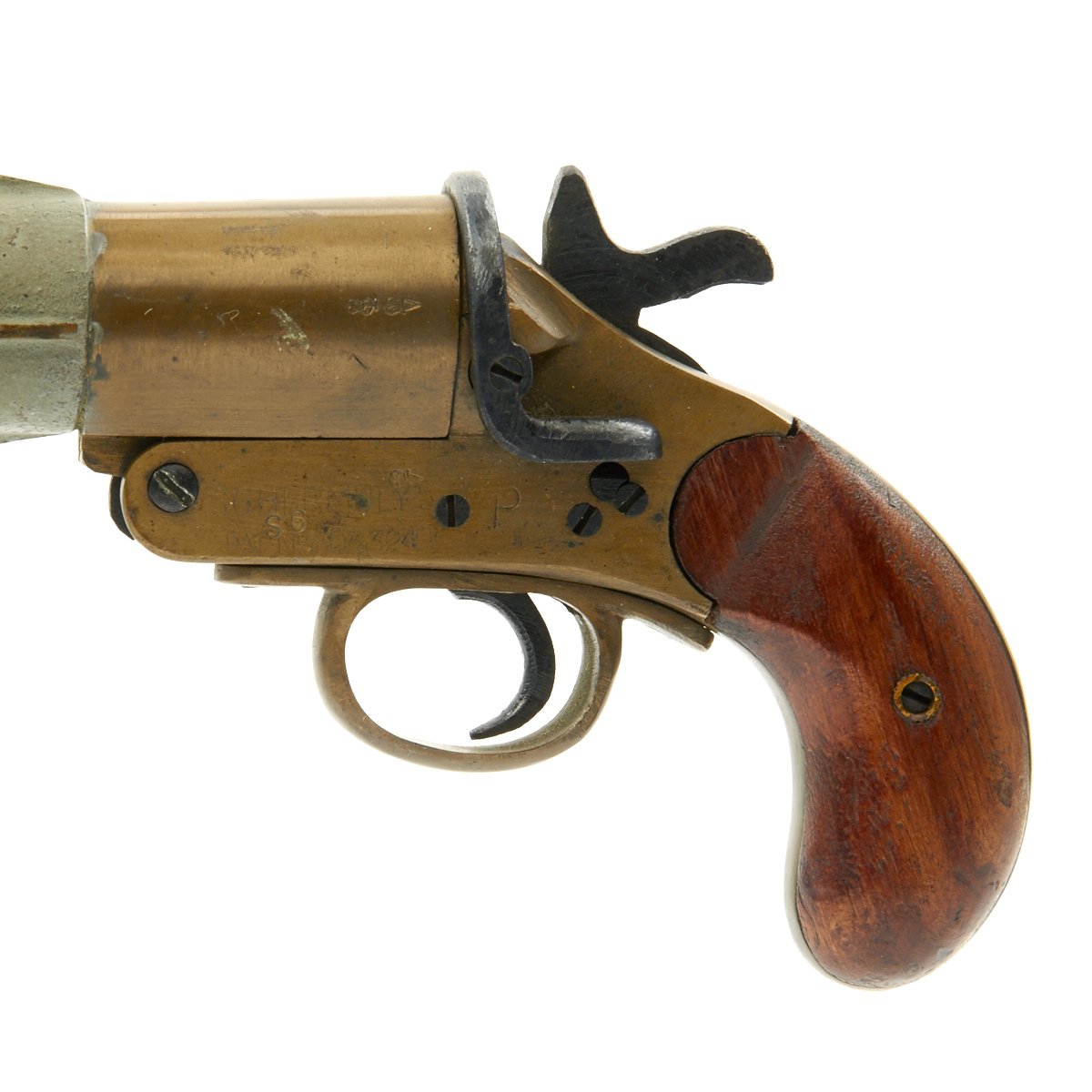 The pistol barrel has an extra handle to steady the gun when firing. The wood grips are made of mahogany.
