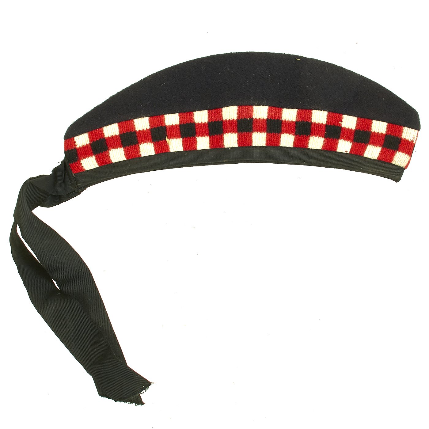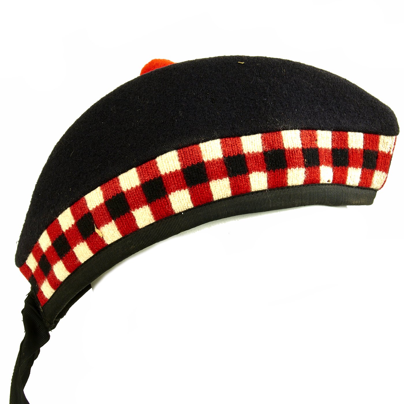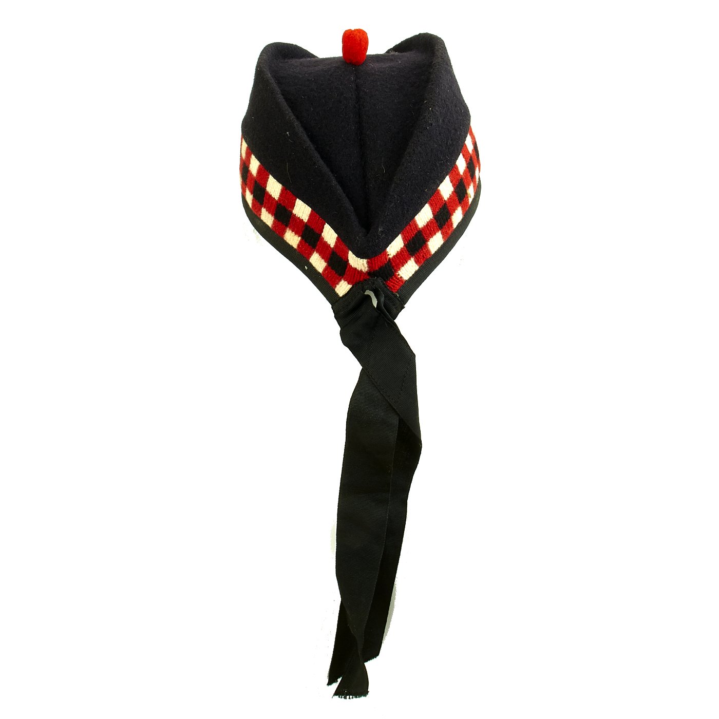 Original Item: Only One Available. The glengarry bonnet, or side cap, is a traditional Scots cap made of thick-milled woollen material, decorated with a toorie (small pom pom) on top, frequently a rosette cockade on the left side, and ribbons hanging behind. It is normally worn as part of Scottish military or civilian Highland dress, either formal or informal, as an alternative to the Balmoral bonnet or tam o' shanter. For many years it was the standard headgear of all highland regiments in the British Army, except for the Black Watch, who retained a blue Balmoral Bonnet.