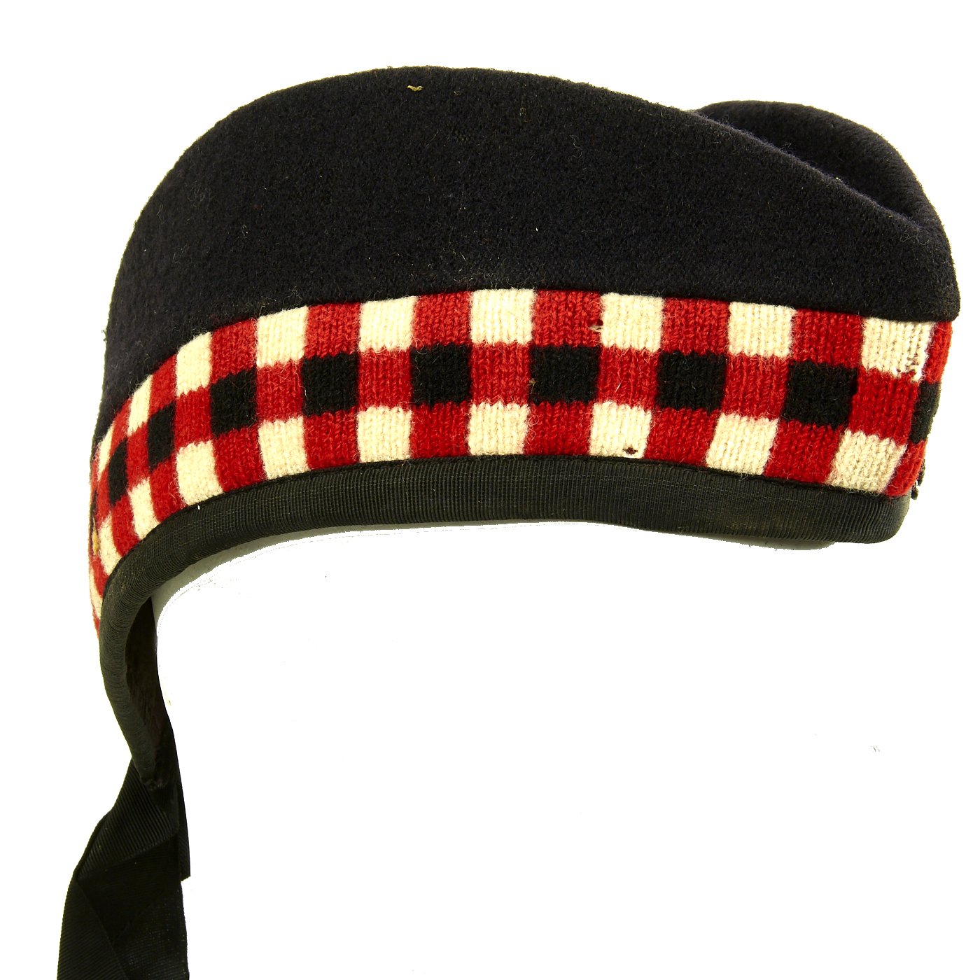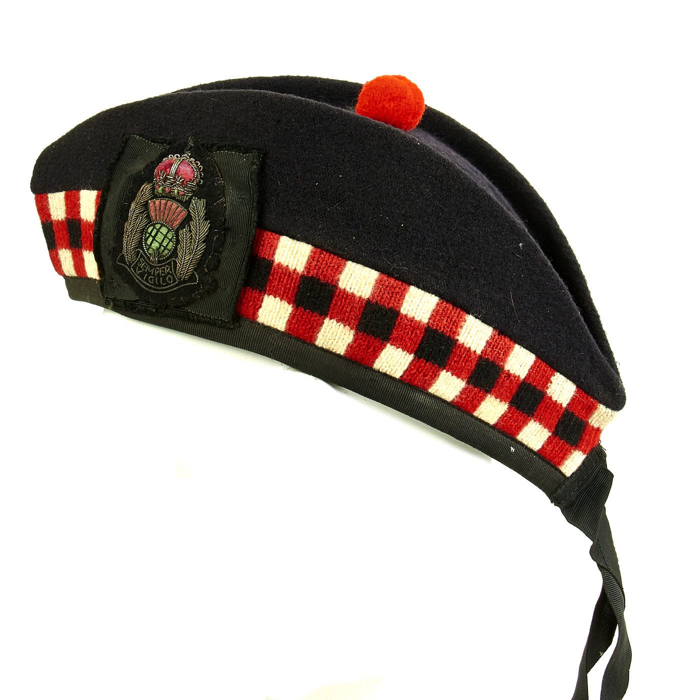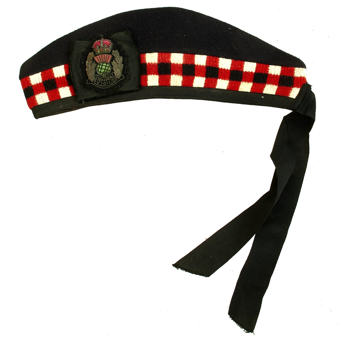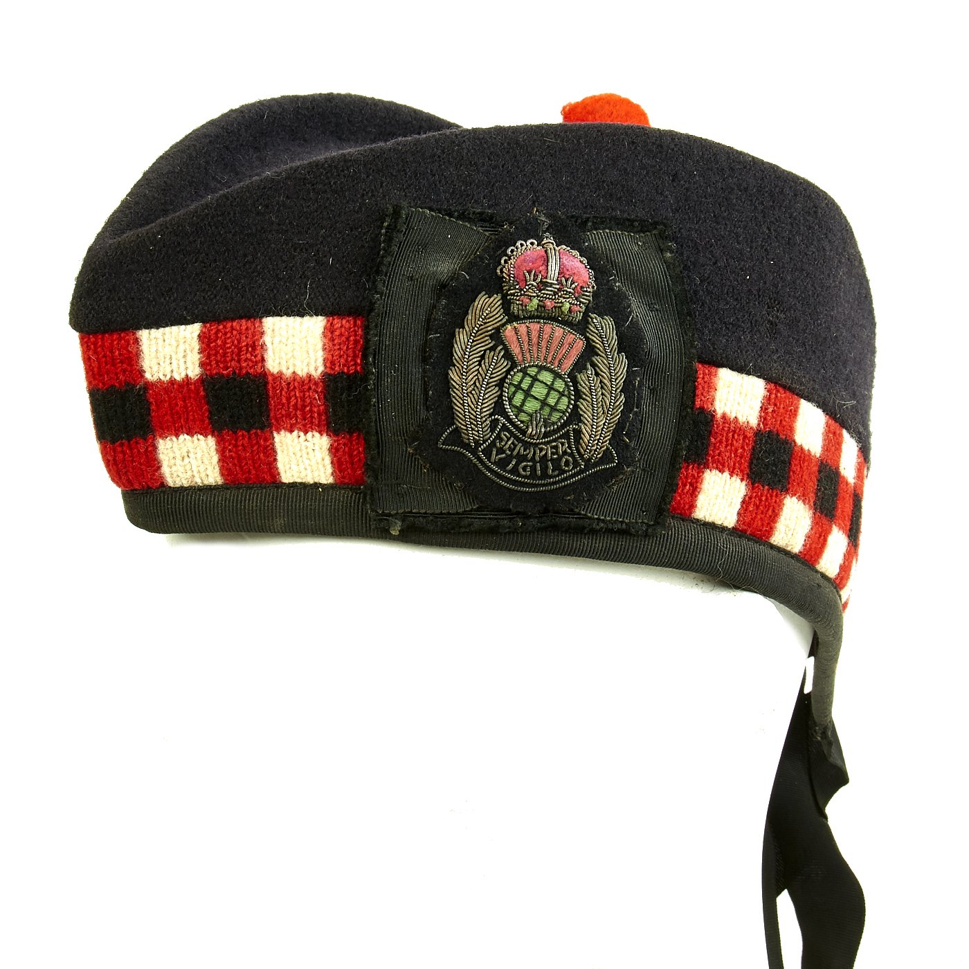 Original Item: Only One Available. The glengarry bonnet, or side cap, is a traditional Scots cap made of thick-milled woollen material, decorated with a toorie (small pom pom) on top, frequently a rosette cockade on the left side, and ribbons hanging behind. It is normally worn as part of Scottish military or civilian Highland dress, either formal or informal, as an alternative to the Balmoral bonnet or tam o' shanter. For many years it was the standard headgear of all highland regiments in the British Army, except for the Black Watch, who retained a blue Balmoral Bonnet.