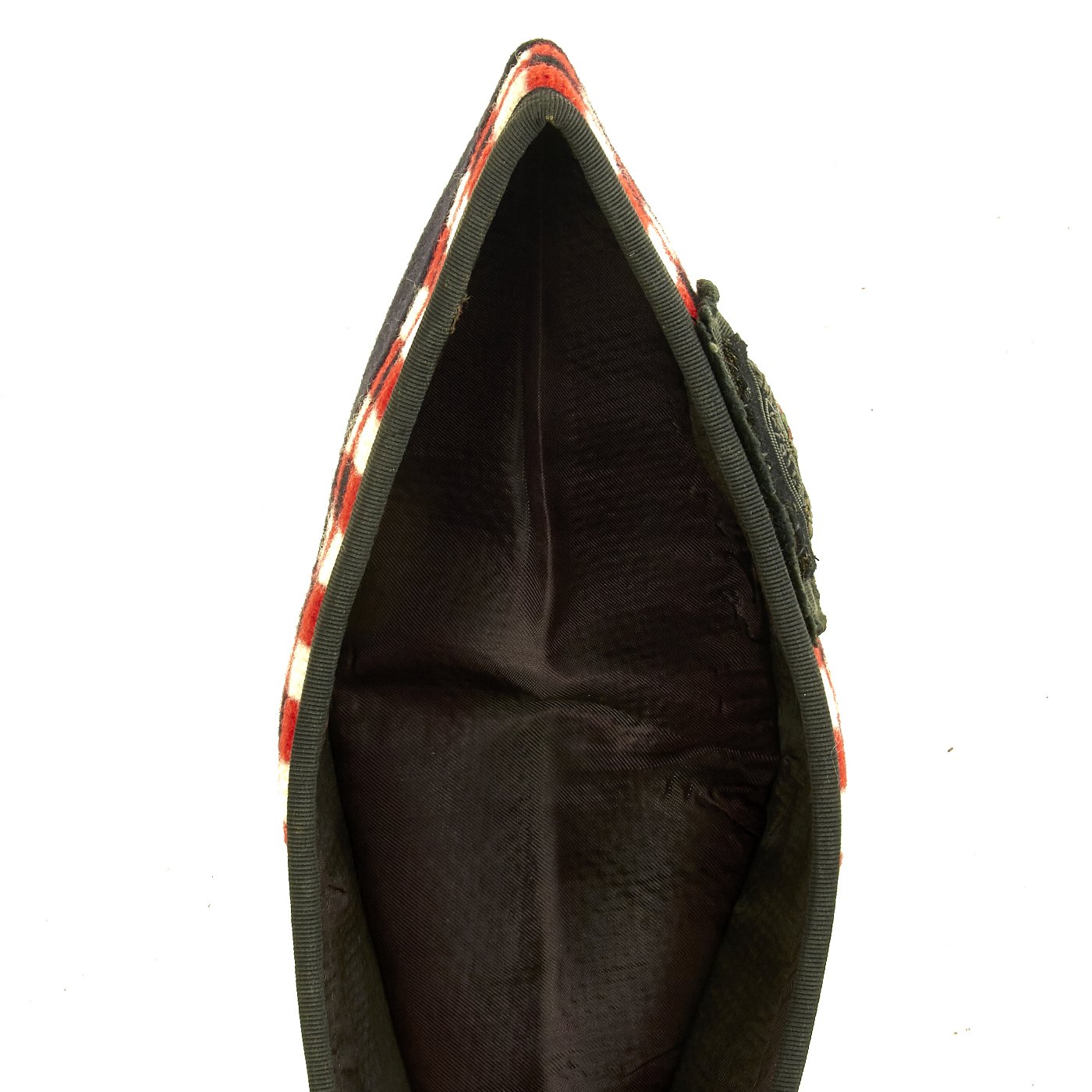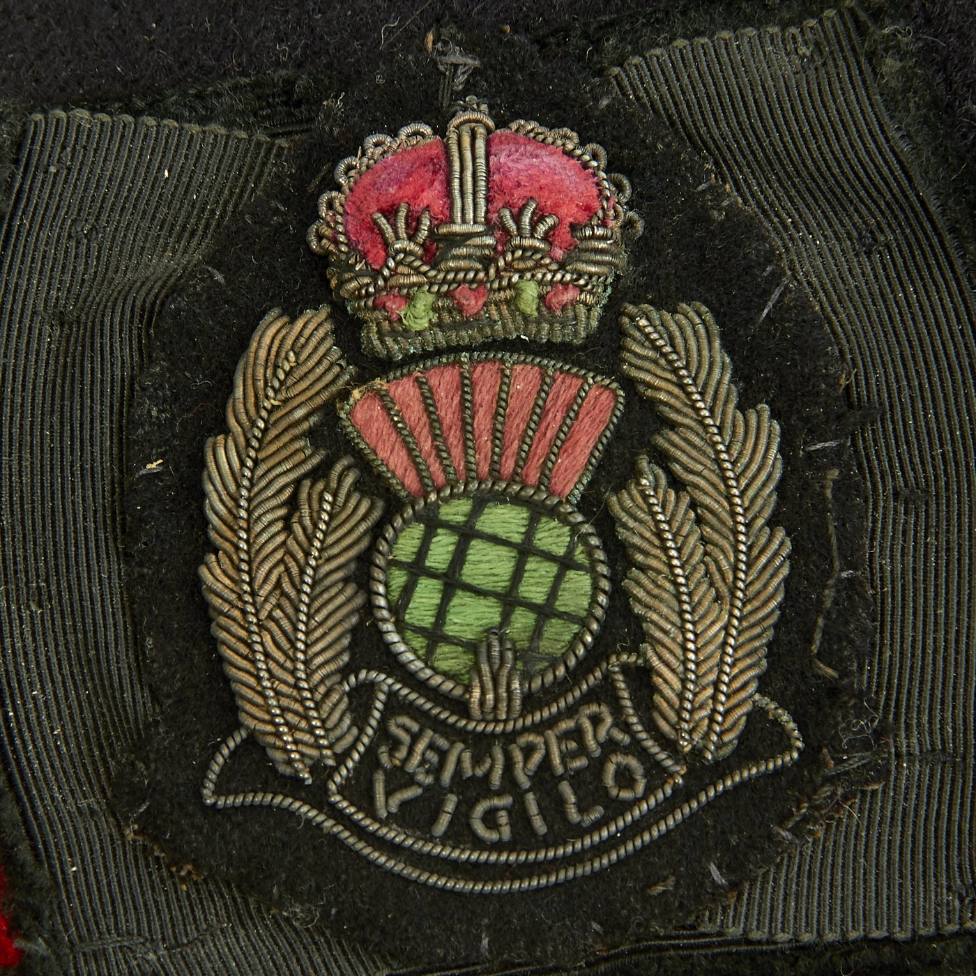 This example is in great shape, and has the red, white, and black "diced" checkerboard pattern on the sides, with a nice rosette on the left side. This has a lovely embroidered cap badge, which has a Thistle blossom in the middle for Scotland, under a King's Crown, with leaves to the side. Under this is the motto SEMPER VIGILO (Always Watching/Vigilant), the current motto and badge of the Scotland Police force. This was originally the badge of one of the smaller Scottish police forces, but was adopted by the overall force when it amalgamated in the late 20th century. We unfortunately have not been able to find out which police group it represented during WWII.
