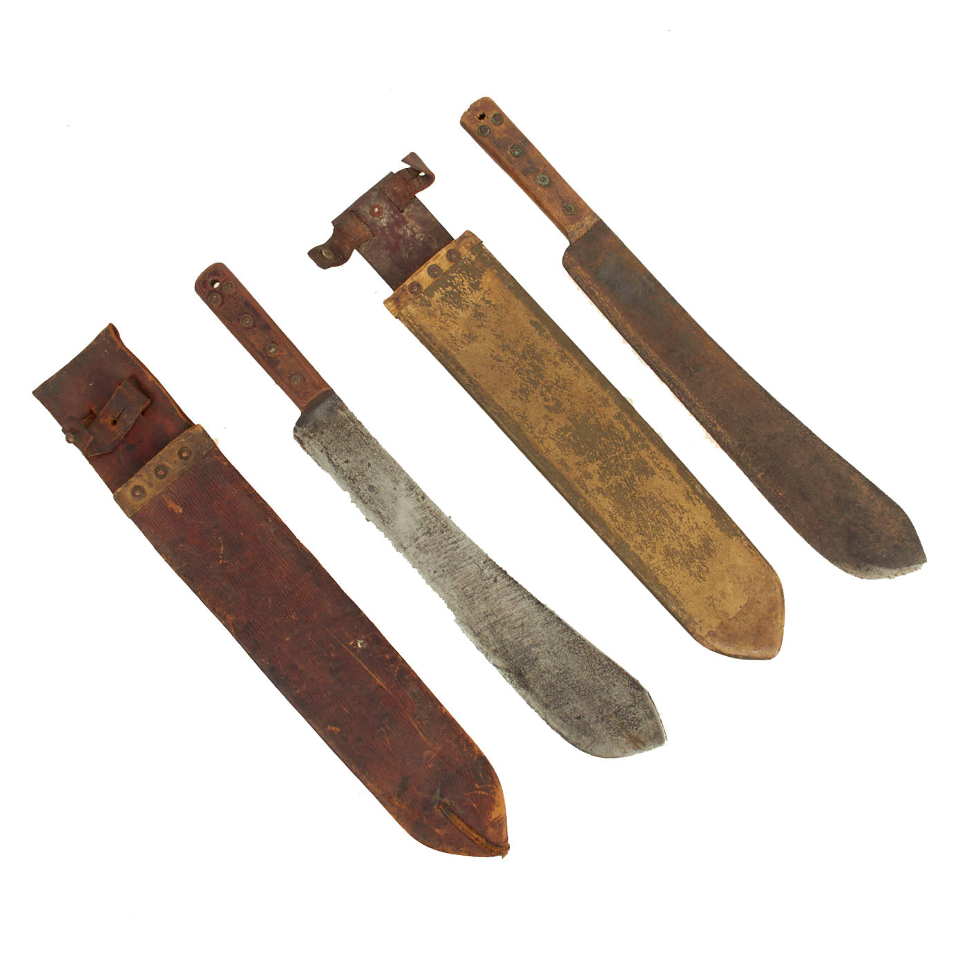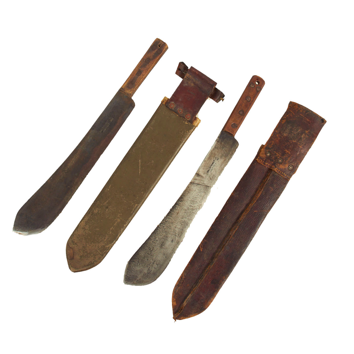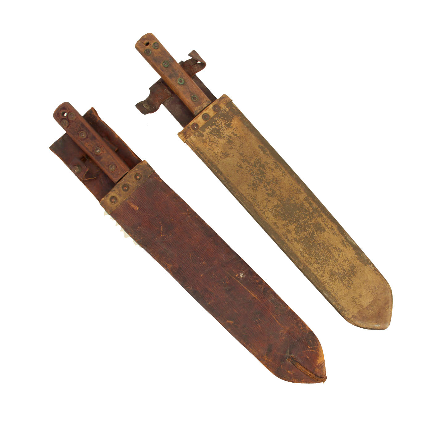 Original Items: Only One Lot of 2 Available. These are fine examples of WWII British Issue Machetes with scabbards! These are almost completely identical to the WWI issue machetes, but they have become increasingly difficult to find, and when you thought you found one, you usually see WWII dates on them, just like these examples.