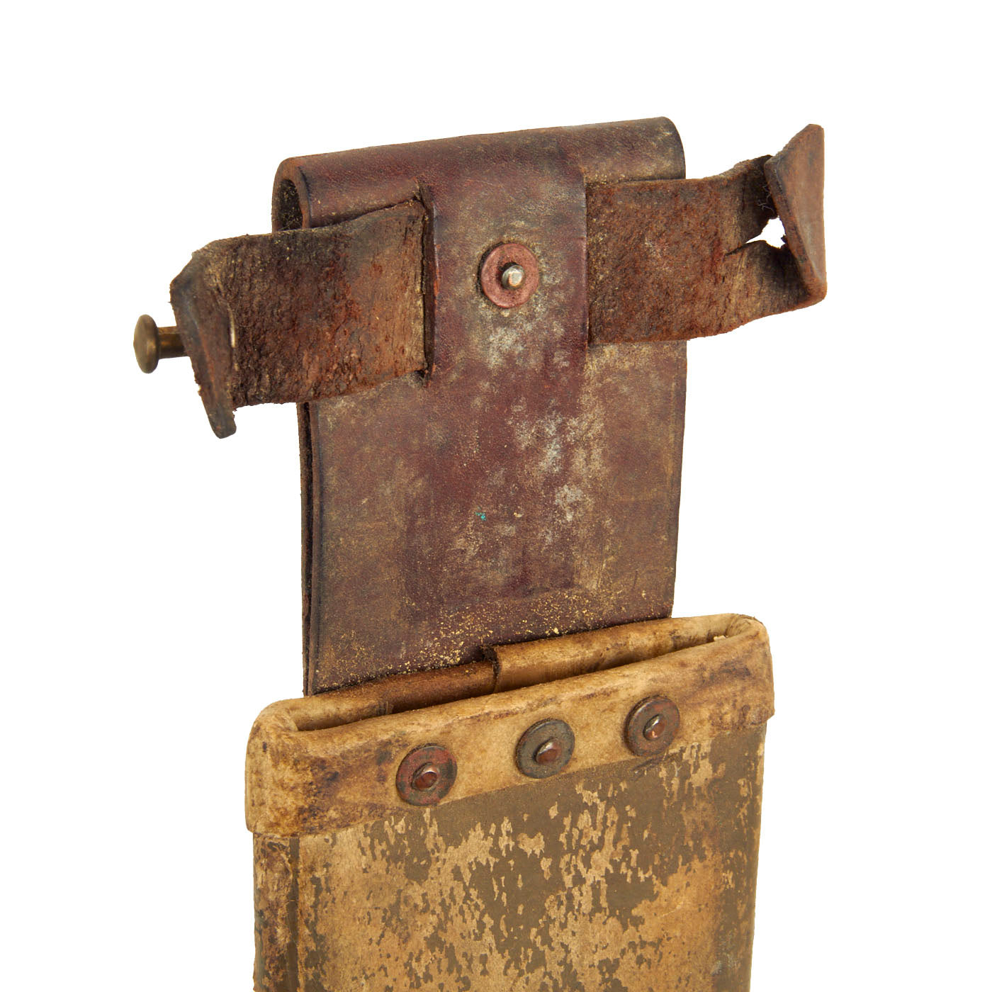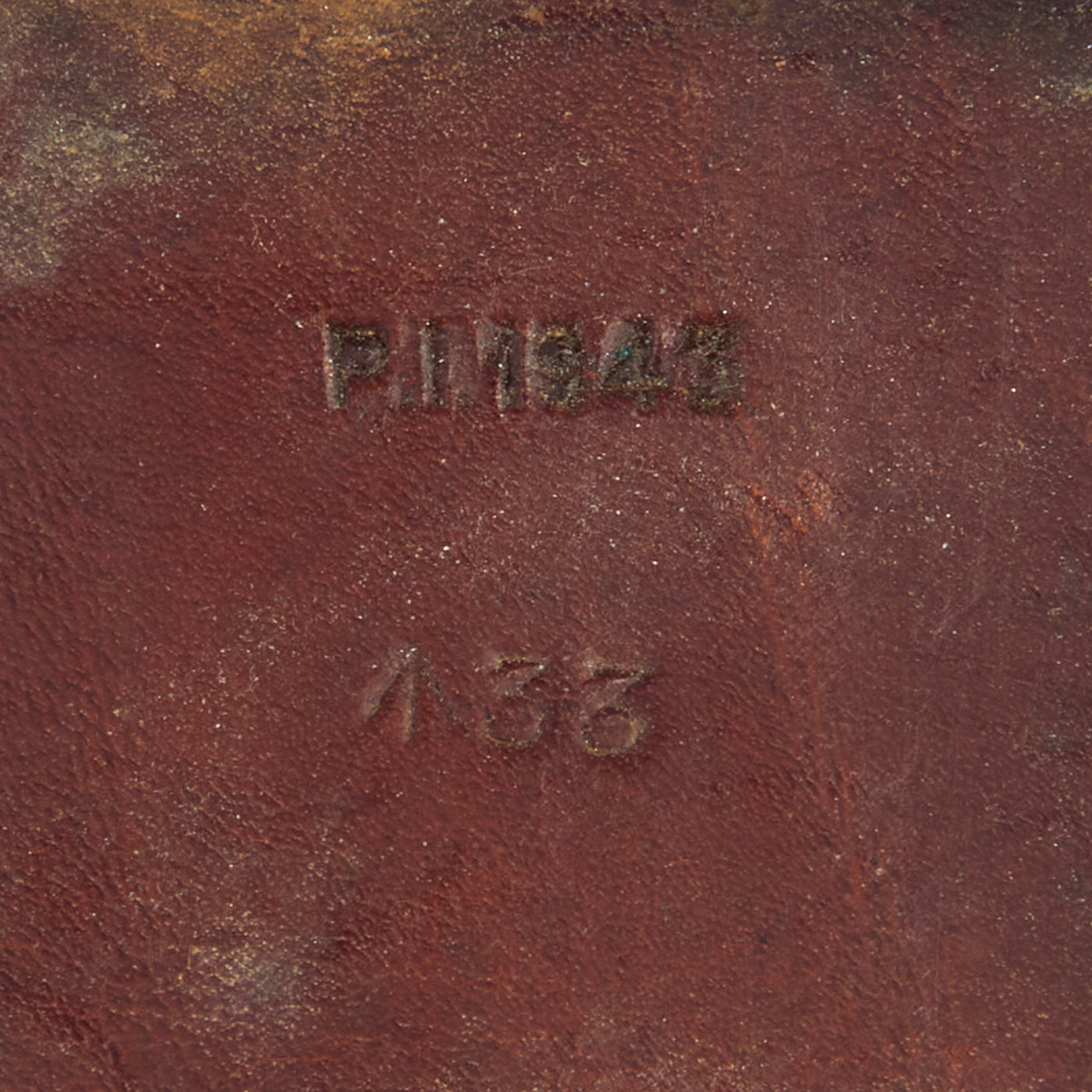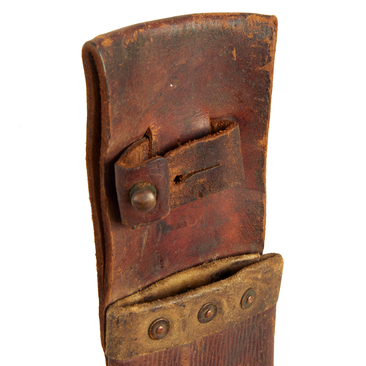 The scabbard is of leather and plastic with an artificial grain pattern, with a piece of buff leather secured to the throats by the means of three tinned copper rivets. The original closure tabs are intact, and not broken. The scabbards are marked with “B.H.G. 1942” and “P.I. 1943”.