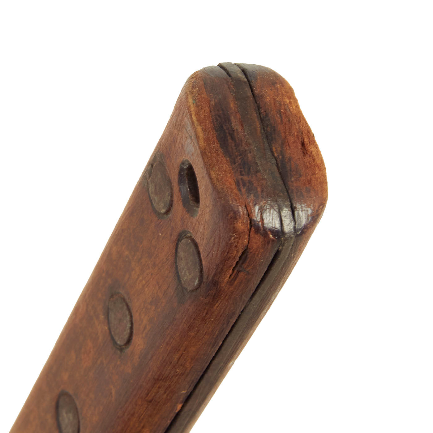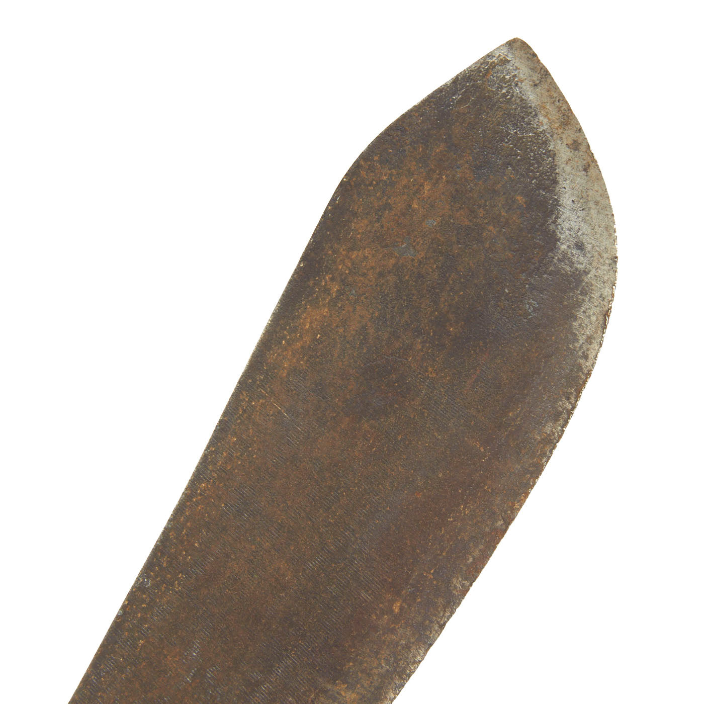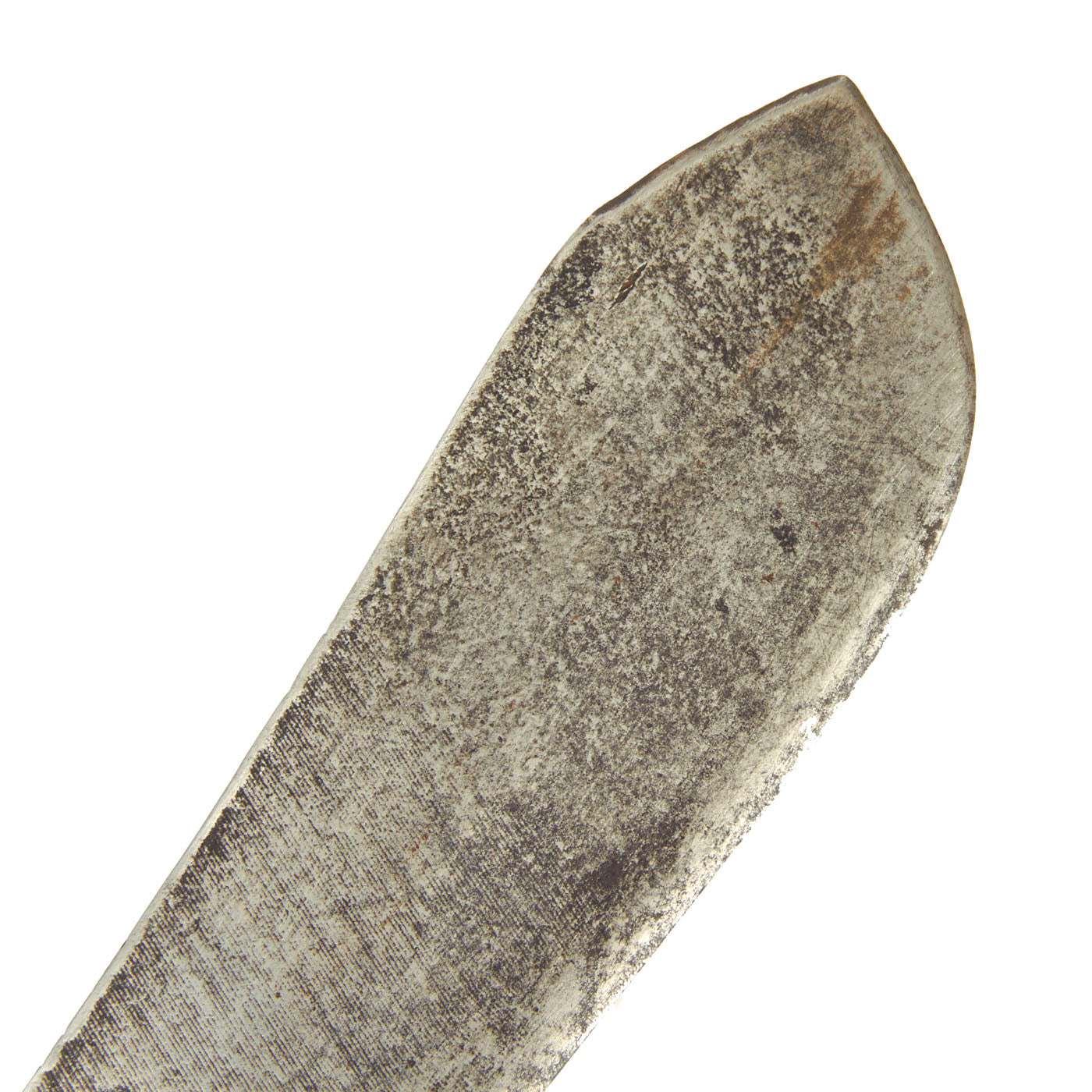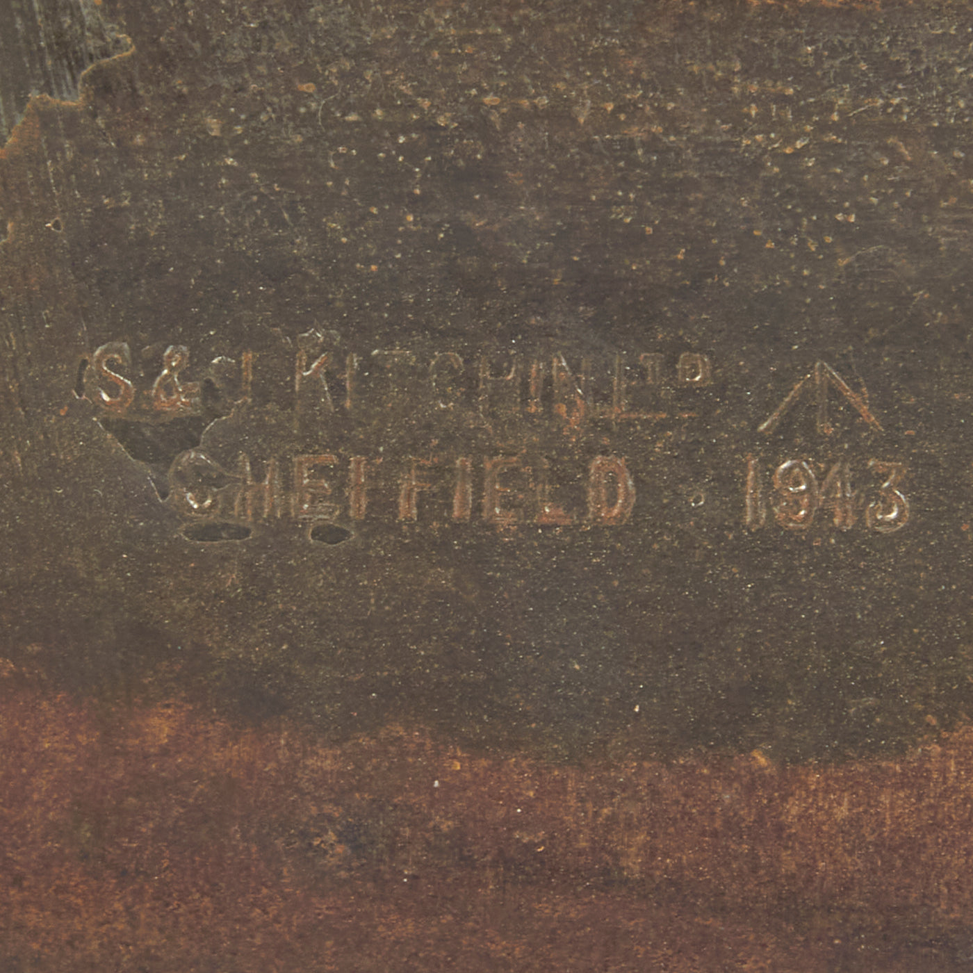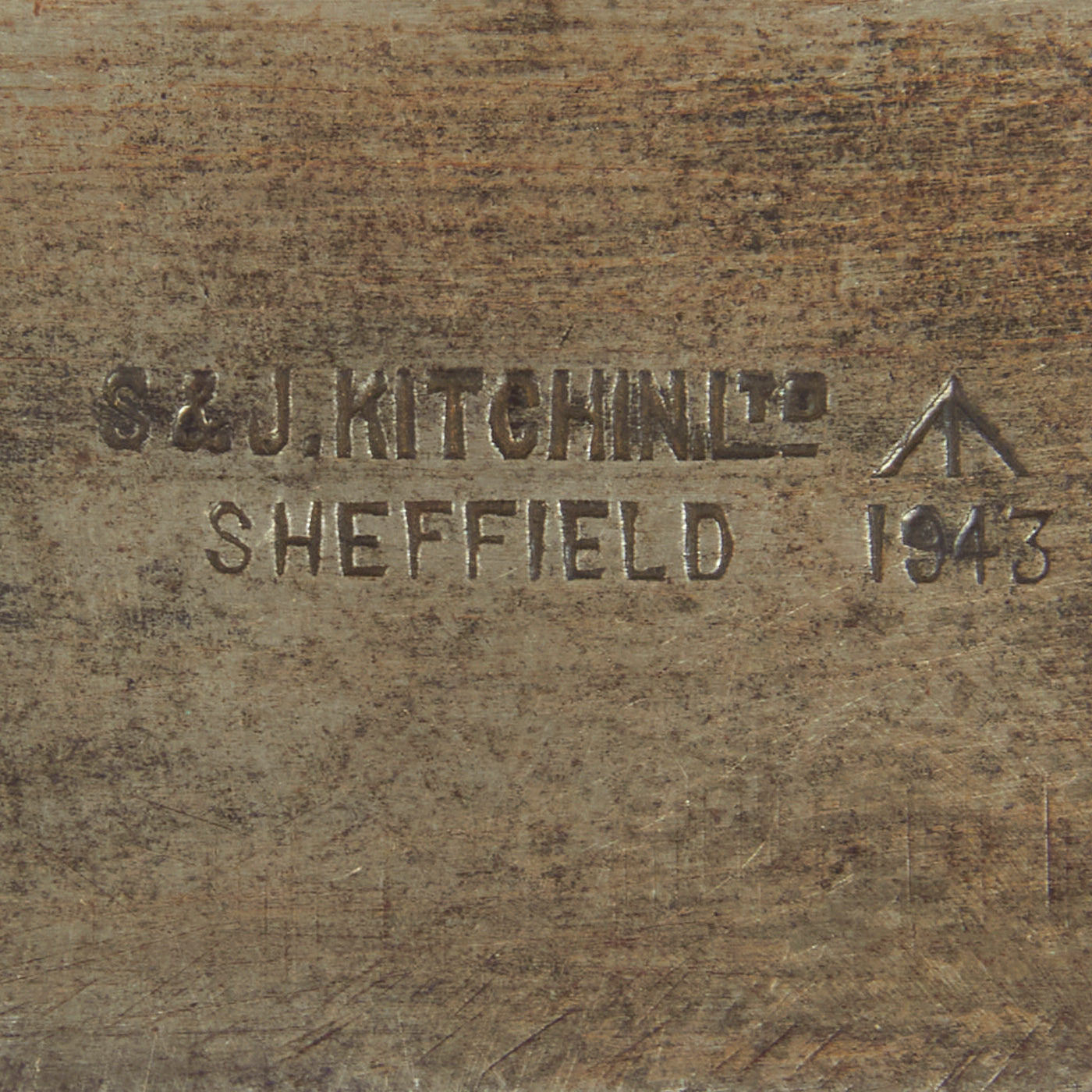 The machetes are in very good condition, especially considering their age. The blades no longer have the original blackened finish, with an edge that appears to have much post-factory sharpening and grinding. The blades are no longer marked with the maker logo for the firm of Samuel Kitchin, which is a coiled snake. The marking below is still present and reads S&J KITCHIN LTD. Below the logo is marked “Sheffield”, with the date to the right “1943” below the British Broad Arrow acceptance stamp. The grip scales, which are made of wood, are not marked and in good condition with minor chipping.