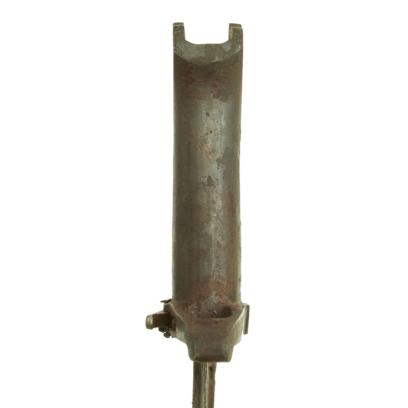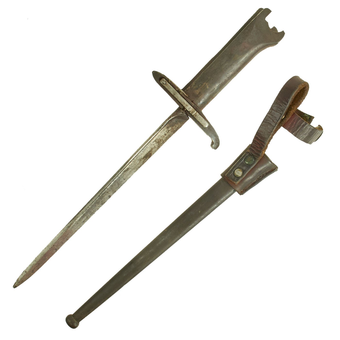 The bayonet is complete with its all steel Scabbard fitted with it's original Brown Leather belt frog and securing snap. Condition is very good, though it does have the expected patination from age. It also has an old repair around the bayonet catch, which unfortunately has given way.