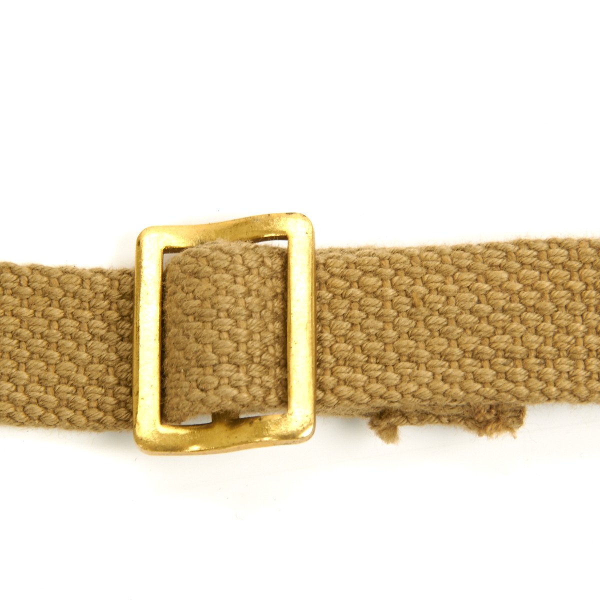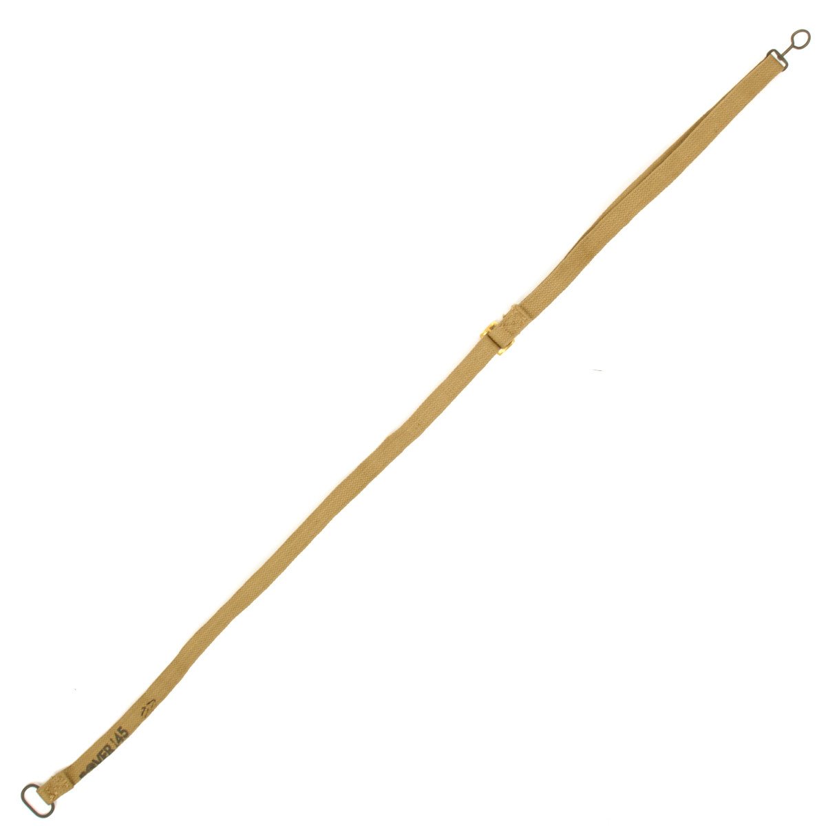 This sling was designed for the Sten Machine Gun Marks II, III, and V. Each sling has a steel oval loop at one end and a steel curly fitting at the other. It is adjustable with a brass or steel buckle. All slings are in the original tan color and are stamped with WW2 dates and the manufacturer's identity.