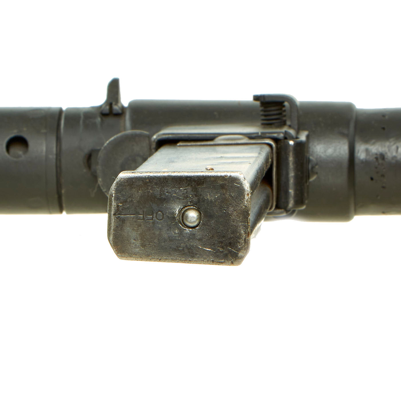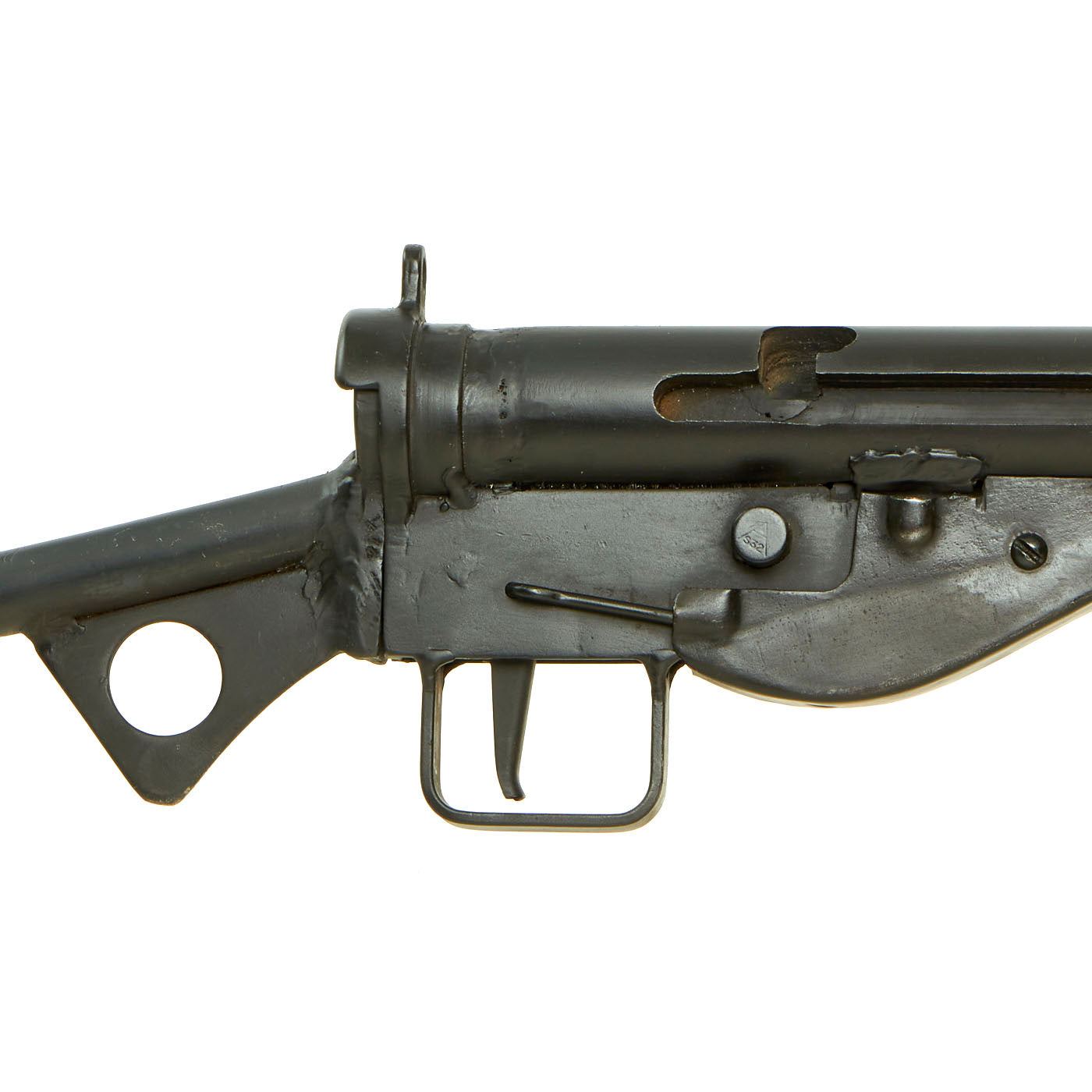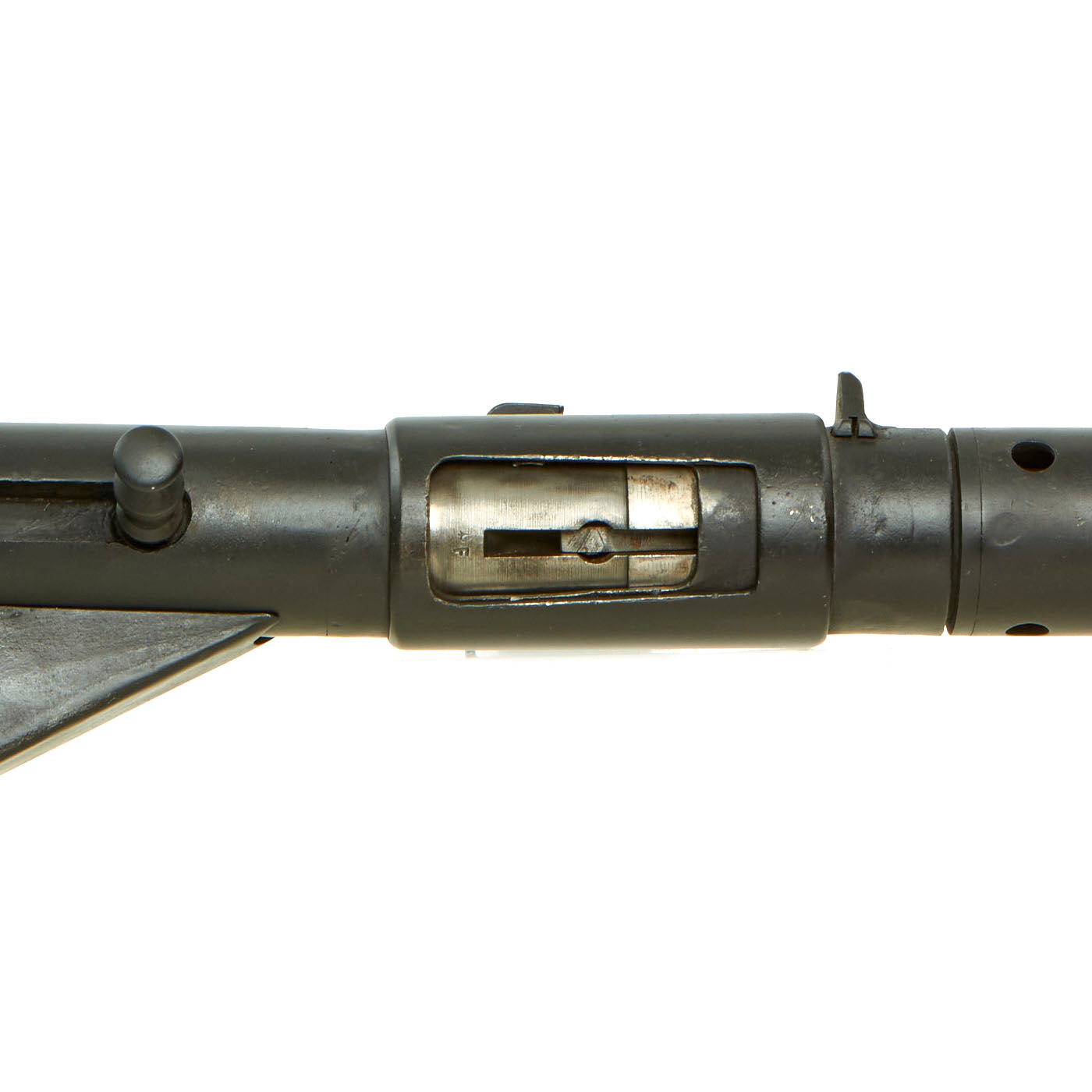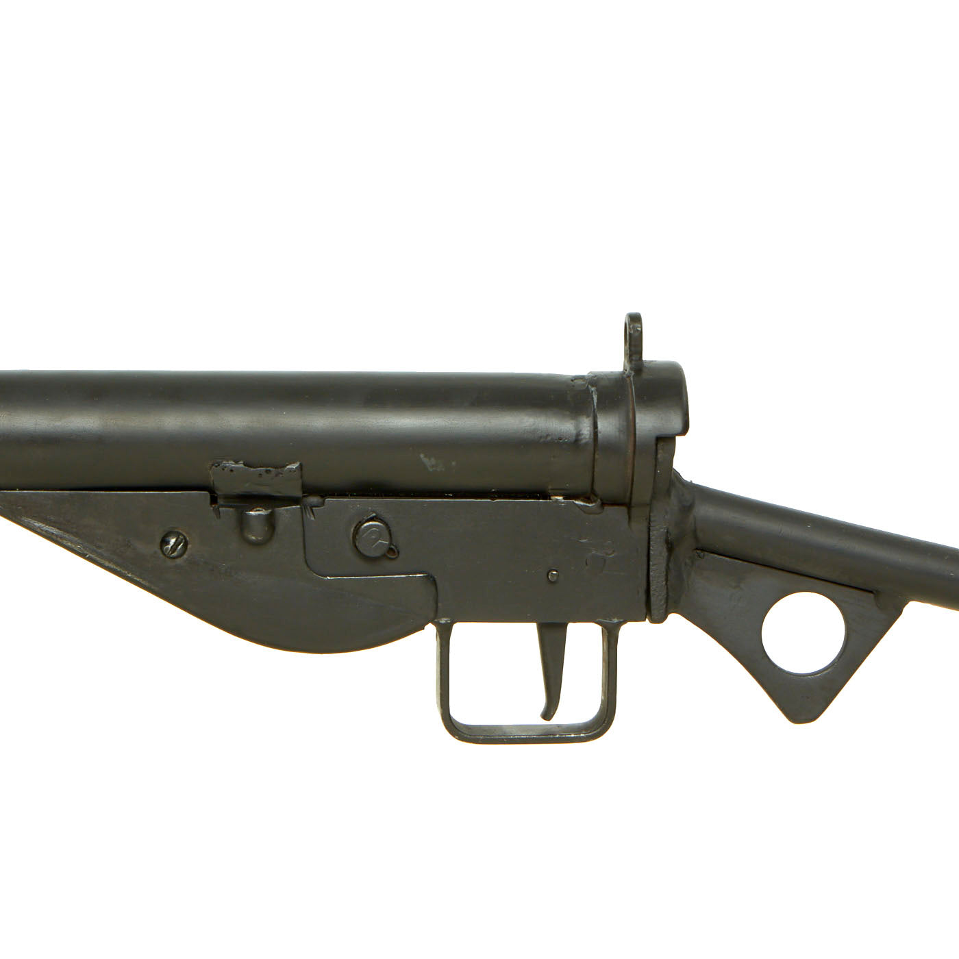 This non-firing BATF non-gun compliant Sten Mk II is made up of all original parts on a solid receiver and duplicates the feel and appearance of the original Sten Mk II Machine Carbine. The trigger still pulls and the selector moves, though the bolt handle does not move, per BATF regulations. It has an original bolt section installed into the ejection port to give it a great look. It is finished in the stove black used on most British small arms of the Second World War. The condition is very good, and it is marked with STEN MKII (very faint) on the underside of the magazine well and the serial number B 96443.