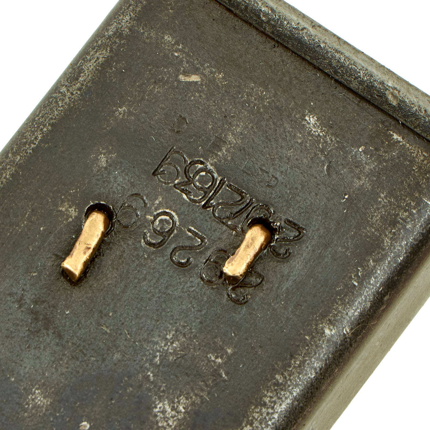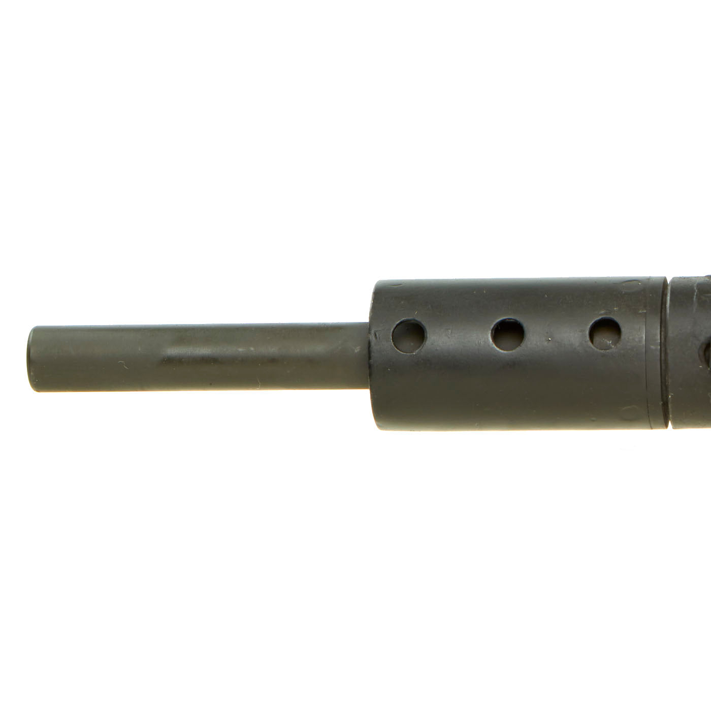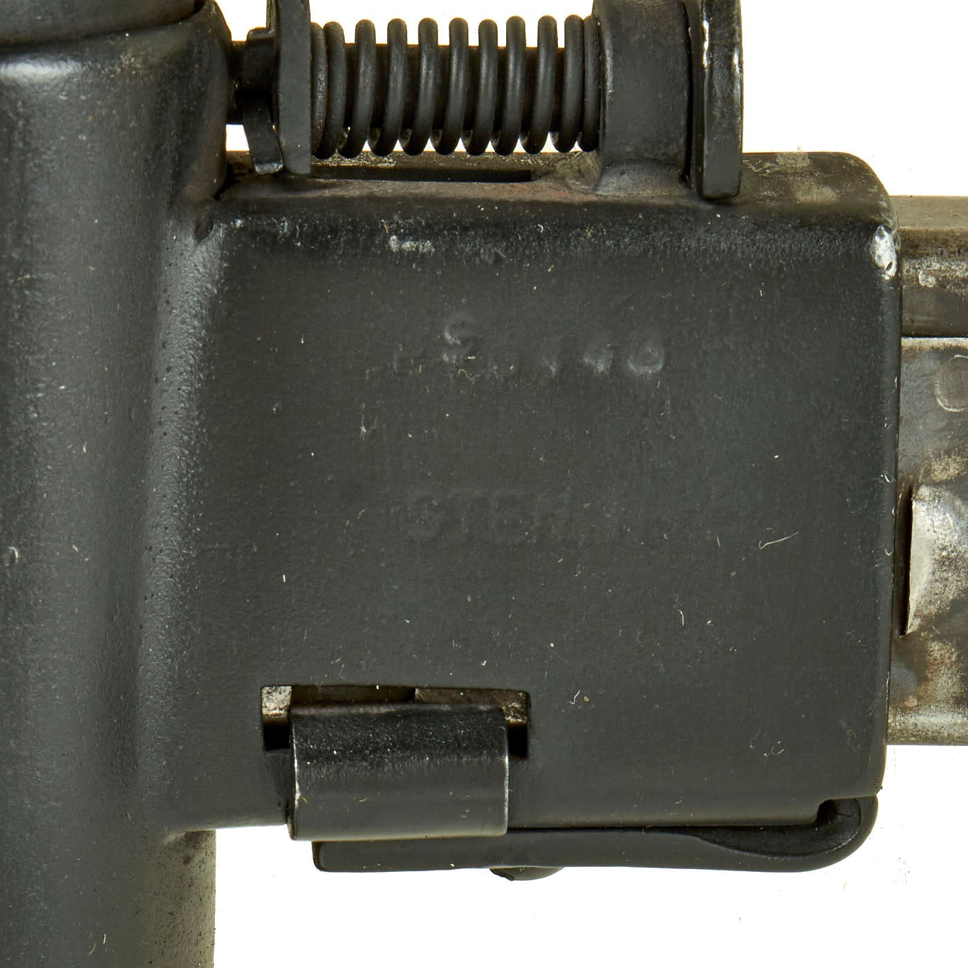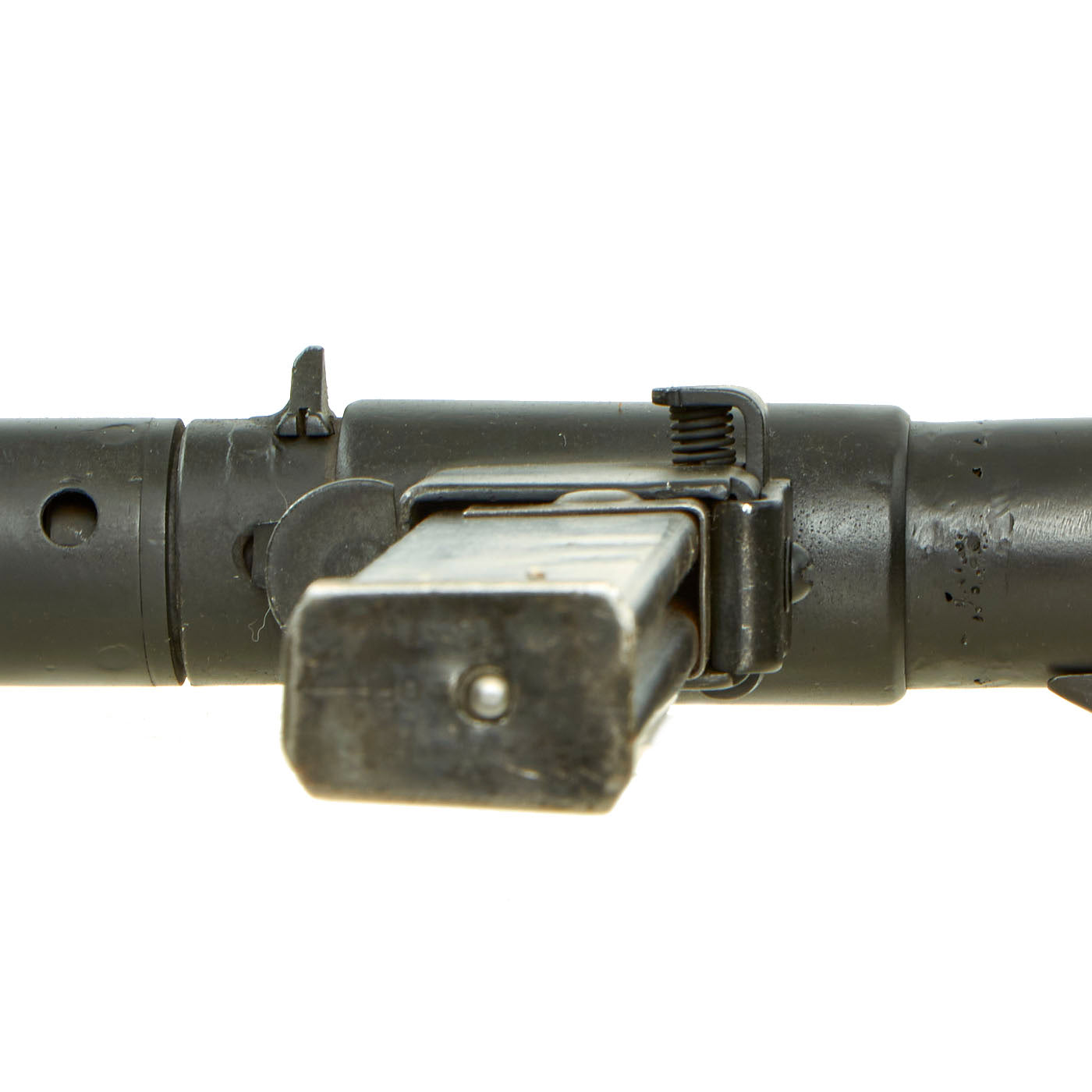 This non-firing BATF non-gun compliant Sten Mk II is made up of all original parts on a solid receiver and duplicates the feel and appearance of the original Sten Mk II Machine Carbine. The trigger still pulls and the selector moves, though the bolt handle does not move, per BATF regulations. It has an original bolt section installed into the ejection port to give it a great look. It is finished in the stove black used on most British small arms of the Second World War. The condition is very good, and it is marked with STEN MKII (very faint) on the underside of the magazine well and the serial number B 96443.