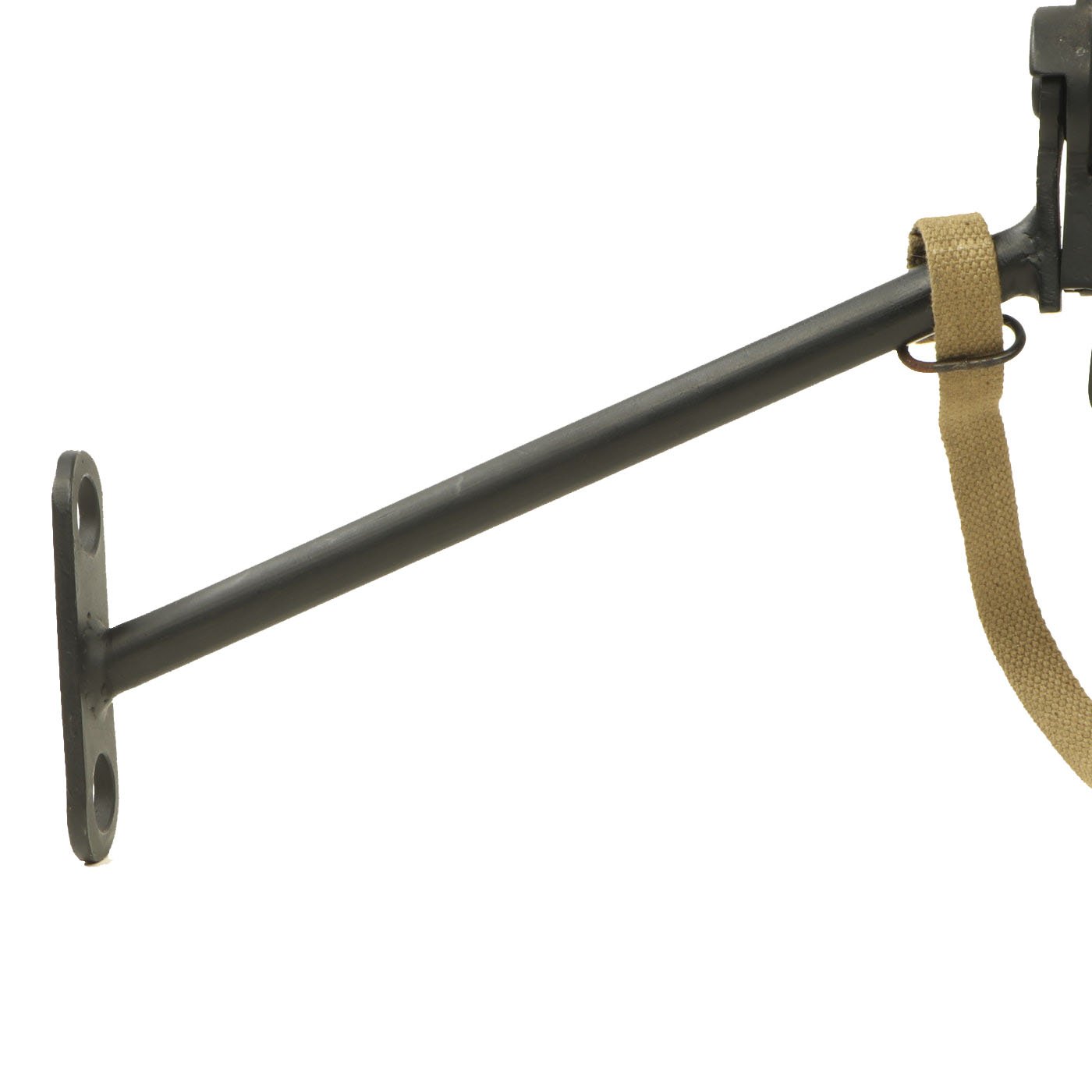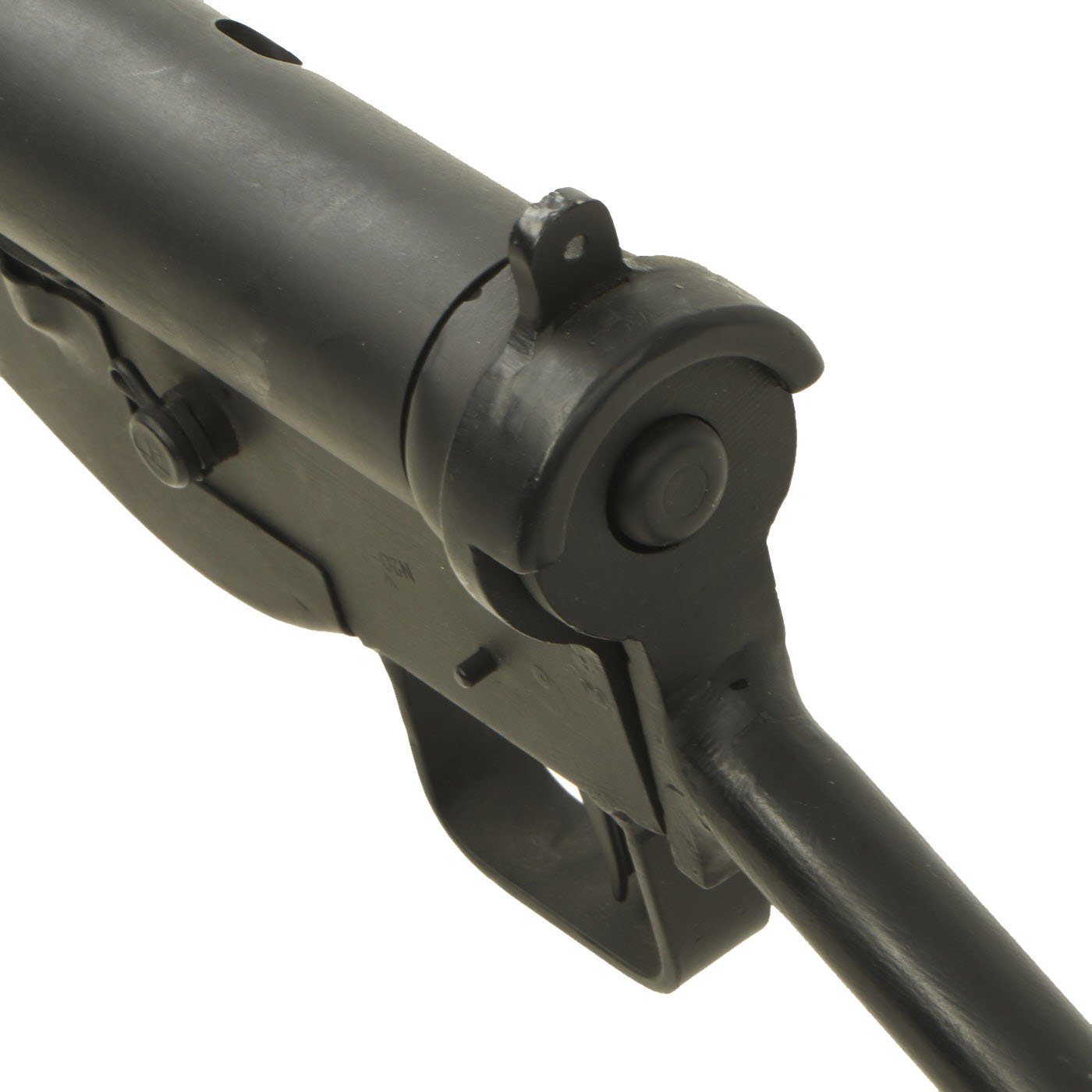 The Mk II was the most widely distributed of the various Sten models, and was featured in numerous motion pictures, including the marquee poster for the great The Bridge On The River Kwai. This sample has the popular T butt stock, much more durable than the earlier "loop" butt stock, which was prone to bending and breaking.