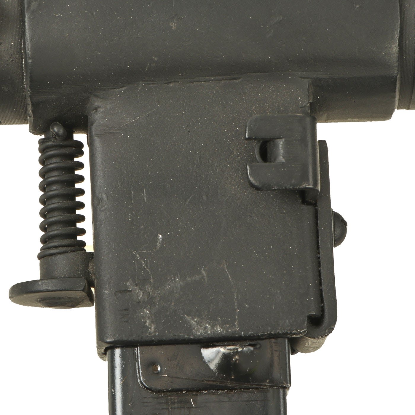 This non-firing BATF approved Sten Mk II is made up of original parts on a solid receiver with a dummy barrel, and duplicates the feel and appearance of the original Sten Mk II Machine Carbine. The trigger still pulls and the selector moves, though the bolt handle does not move, per BATF regulations. It is finished in the stove black used on most British small arms of the Second World War. The condition is very good, and is is marked STEN MKII on the top of the magazine well, while the bottom is marked with serial number 75607 on the top of the magazine well. Unfortunately, the other markings were stamped out with small peened marks, probably to hide the origin of the weapon after overseas sale. However it is definitely a British MkII Sten Gun.