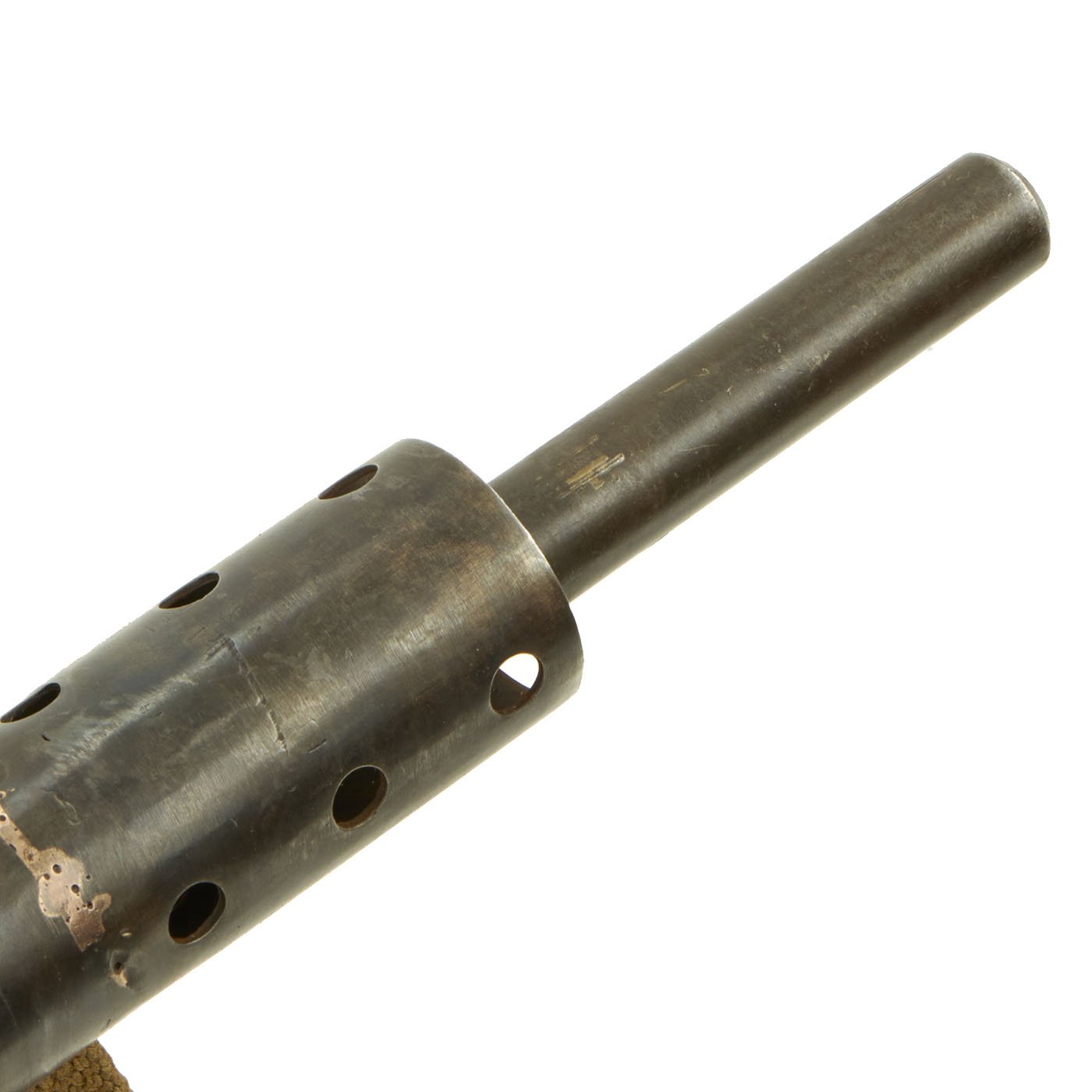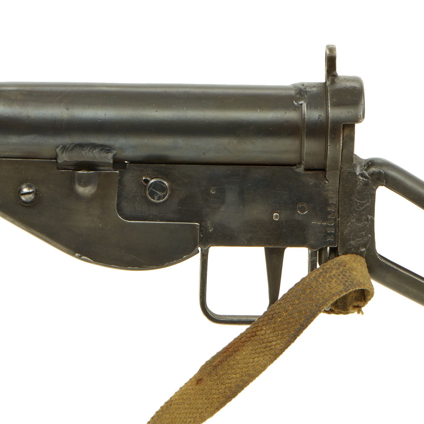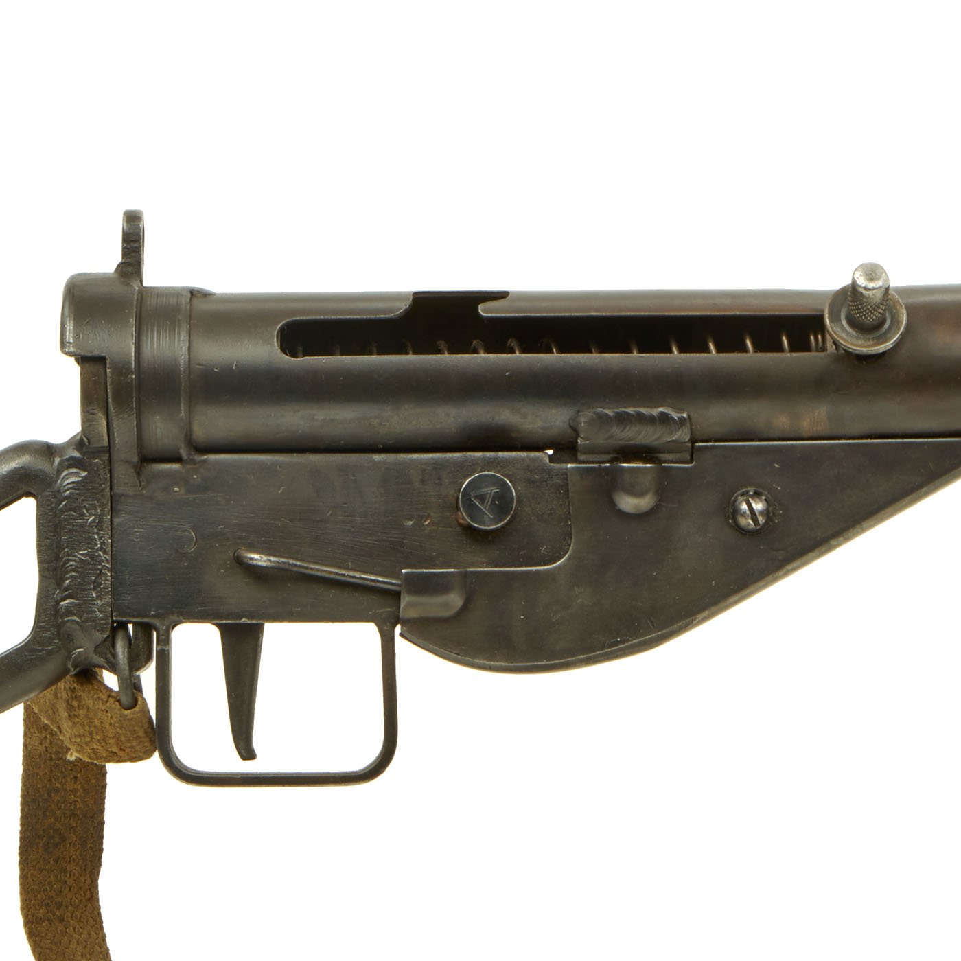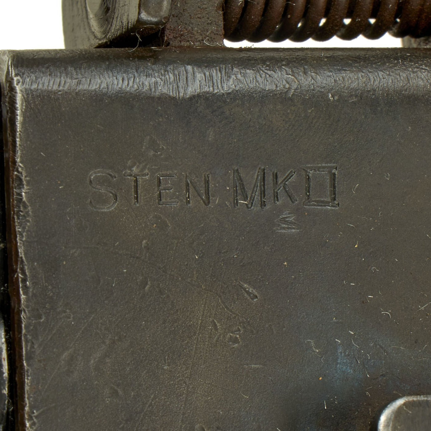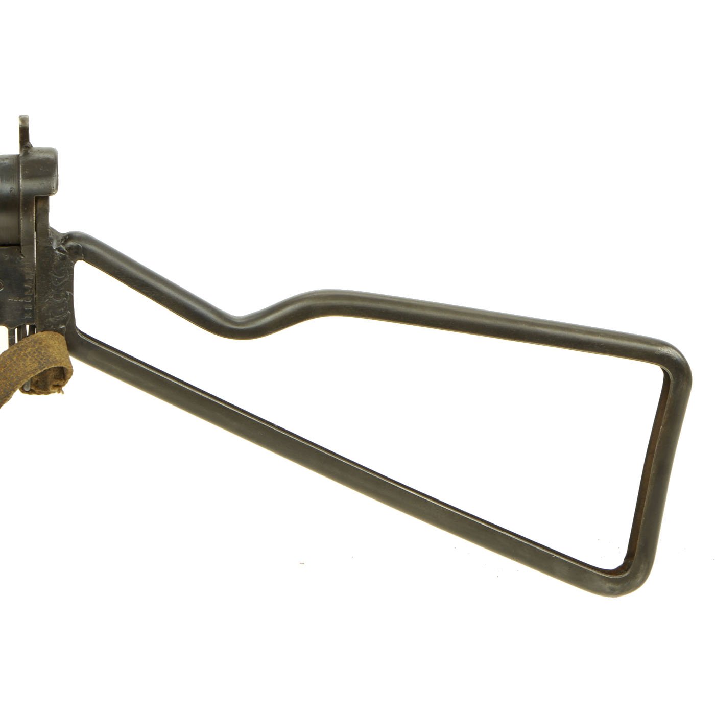 This non-firing BATF approved Sten Mk II is made up of all original parts on a BATF approved re-welded original receiver, and duplicates the feel and appearance of the original Sten Mk II Machine Carbine. Almost all examples we have had previously were built on solid aluminum receivers, but this one actually has the original deactivated tube. It also has the rare and hard to find early model "Loop" butt stock, which was quickly replaced in the field with a sturdier "T" butt stock, which was also carried over to the Mk III. The trigger still pulls, though the selector and bolt handle do not move, per BATF regulations.