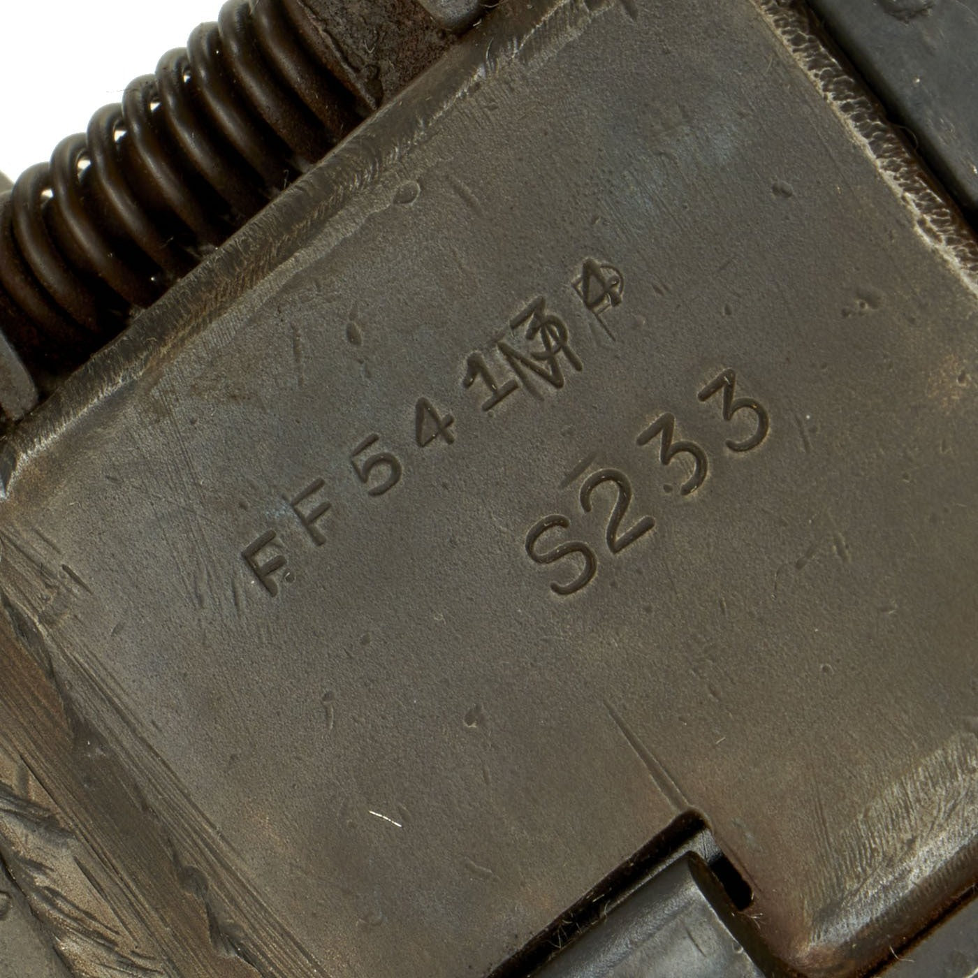 The condition is very good, and it is clearly marked with a STEN MkII on the top of the magazine well, along with a small Broad Arrow proof. The underside is marked with dispersal code S233, which indicates which contractor manufactured it, and possibly the entire gun. There is also the guns serial number, FF54134 and a Broad Arrow. There is an M255 marking on the rear of the loop stock, and the trigger group is actually stamped ENGLAND on the rear left under a proof mark. Lots of markings on this great example!