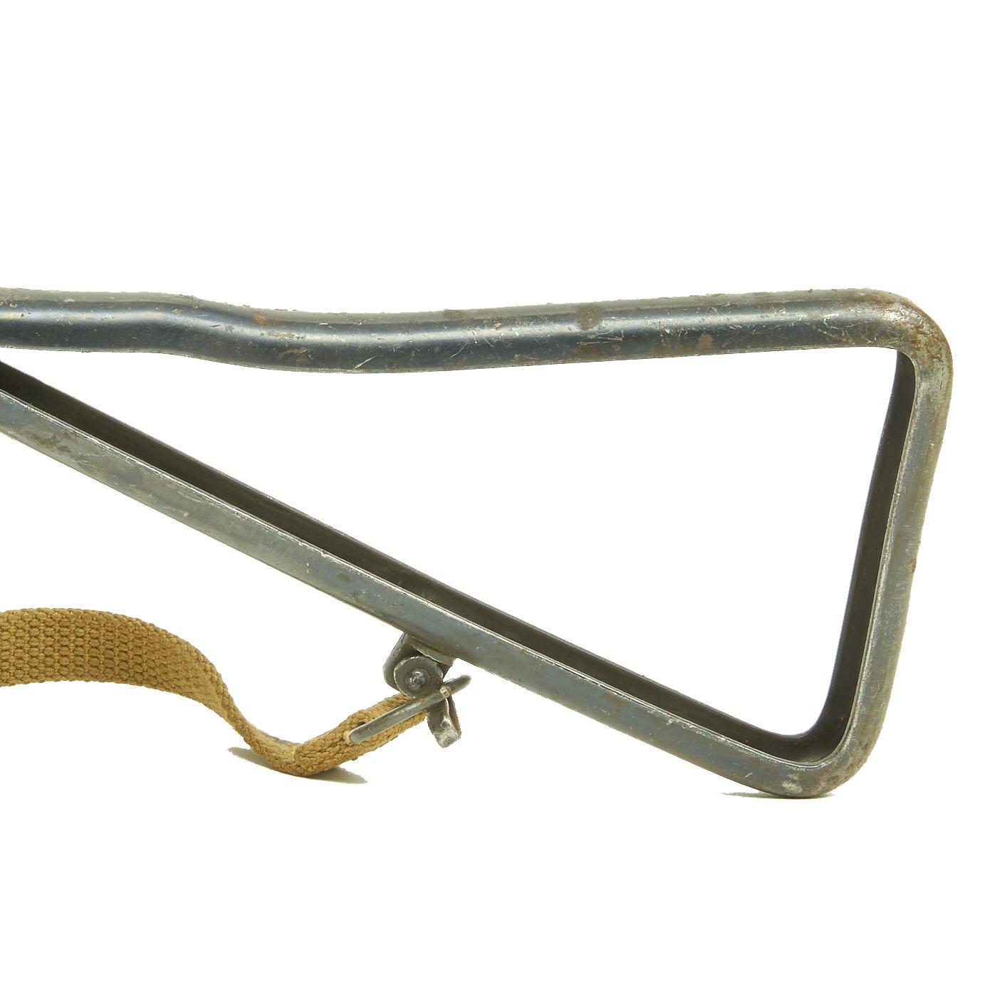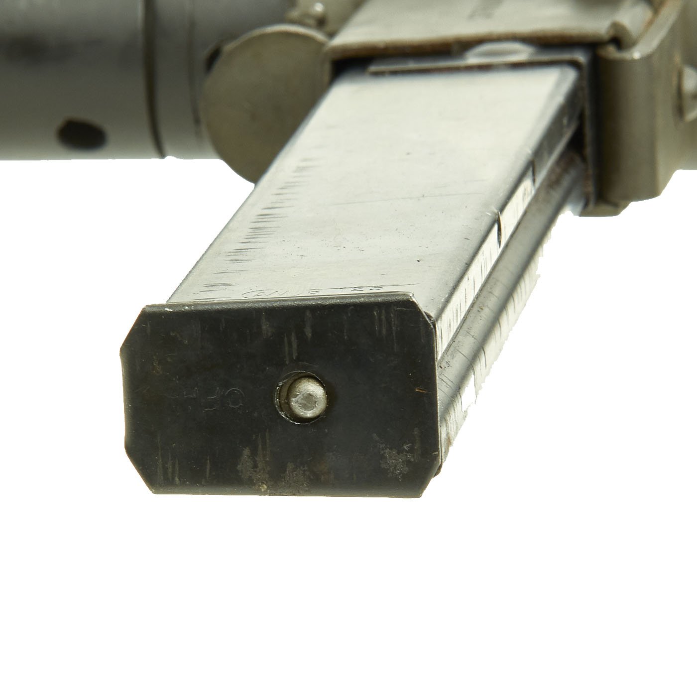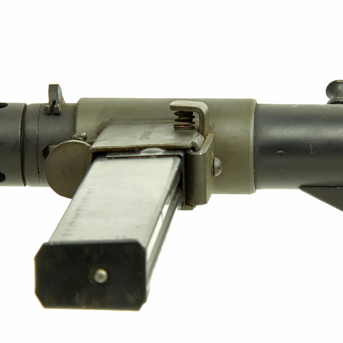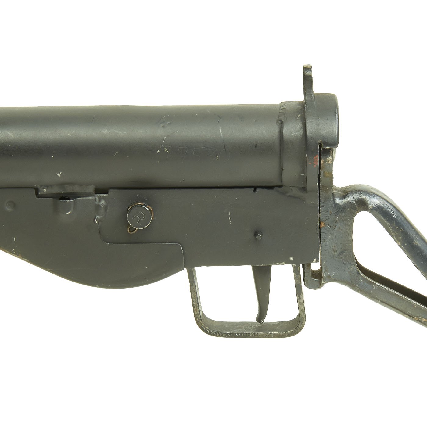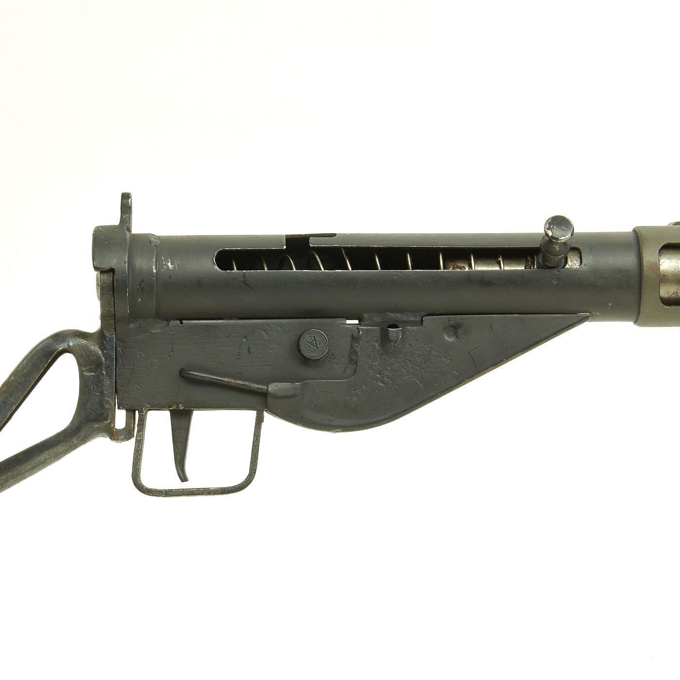 This non-firing BATF approved Sten Mk II is made up of all original parts on a BATF approved dummy receiver, and duplicates the feel and appearance of the original Sten Mk II Machine Carbine. It also has the rare and hard to find early model "Loop" butt stock, which was quickly replaced in the field with a sturdier "T" butt stock, which was also carried over to the Mk III. The trigger still pulls, though the selector and bolt handle do not move, per BATF regulations. It is finished a lovely satin stove black, like that used on most British small arms of the Second World War.