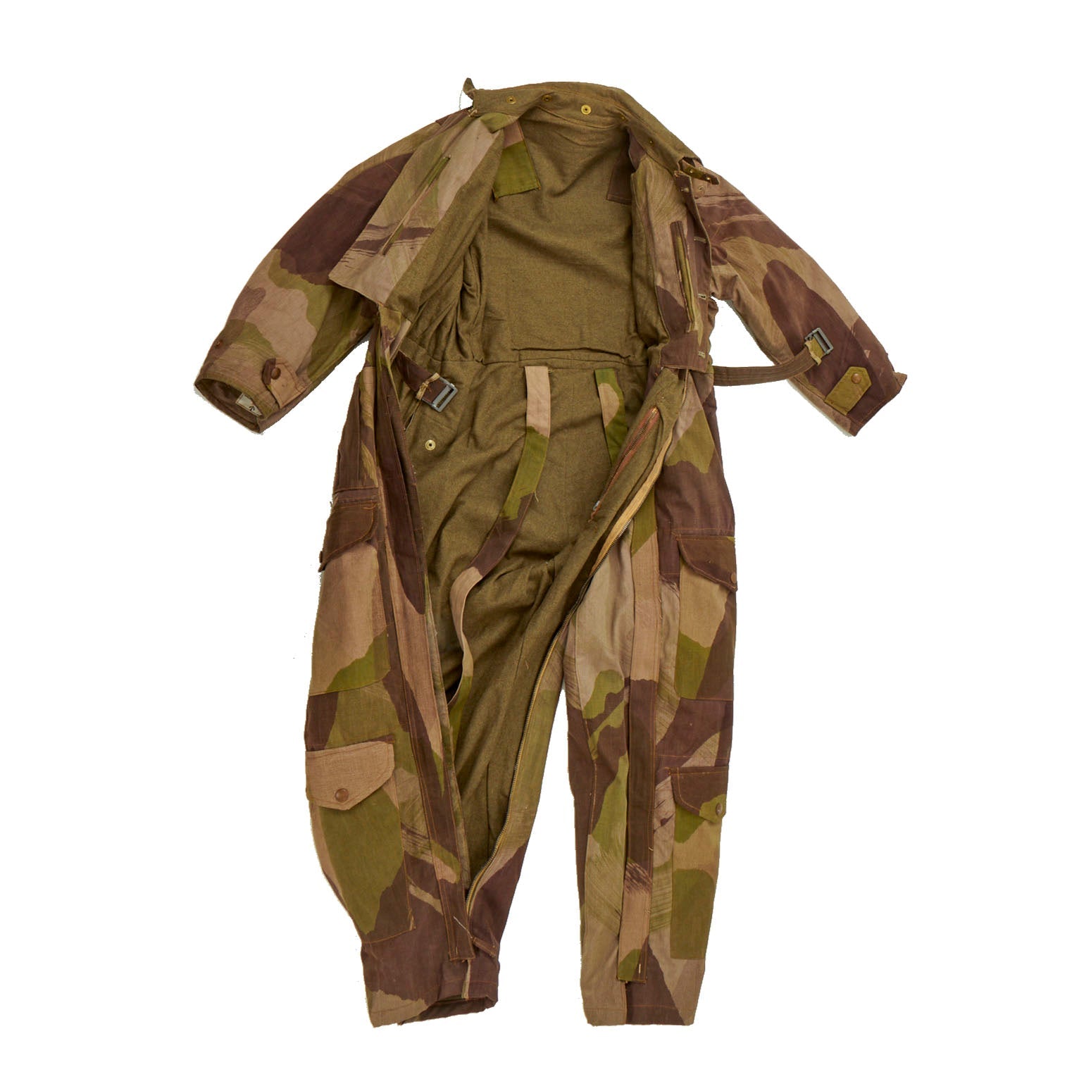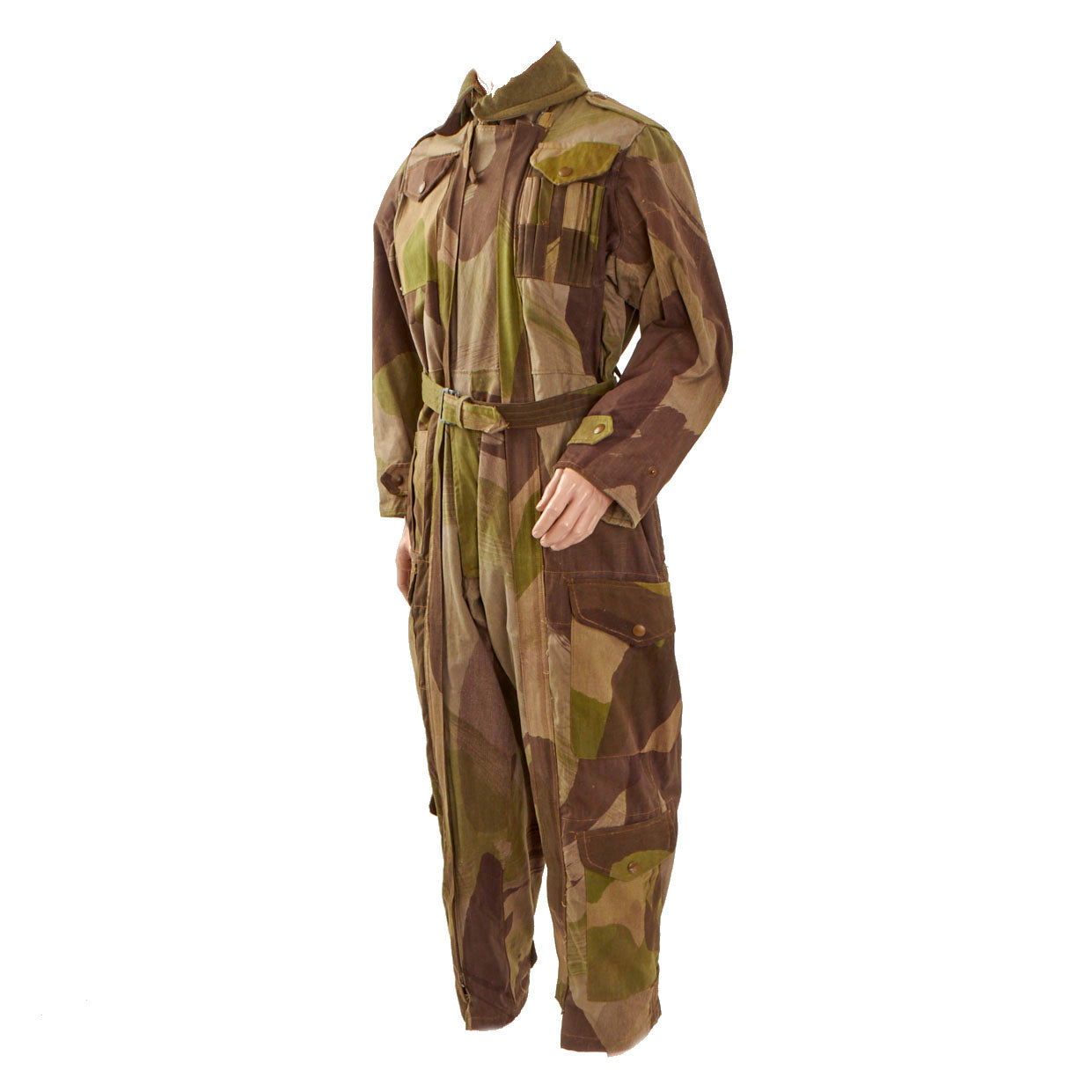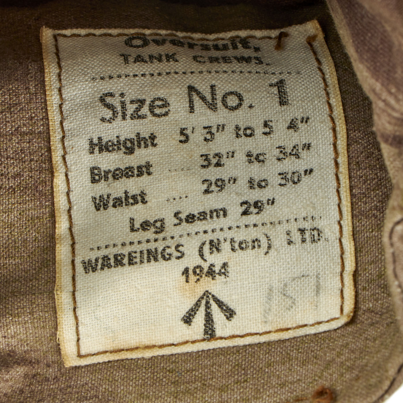 Original Item: Only One Available. This is an genuine 1944 Dated WWII British Tankers set of camouflage coveralls. This suit is in unbelievable condition and is 100% complete and without damage. It would appear that the suit was never even issued out. The right inside cuff has a data label with maker name (WAERINGS), broad arrow and 1944 date. Size 1.