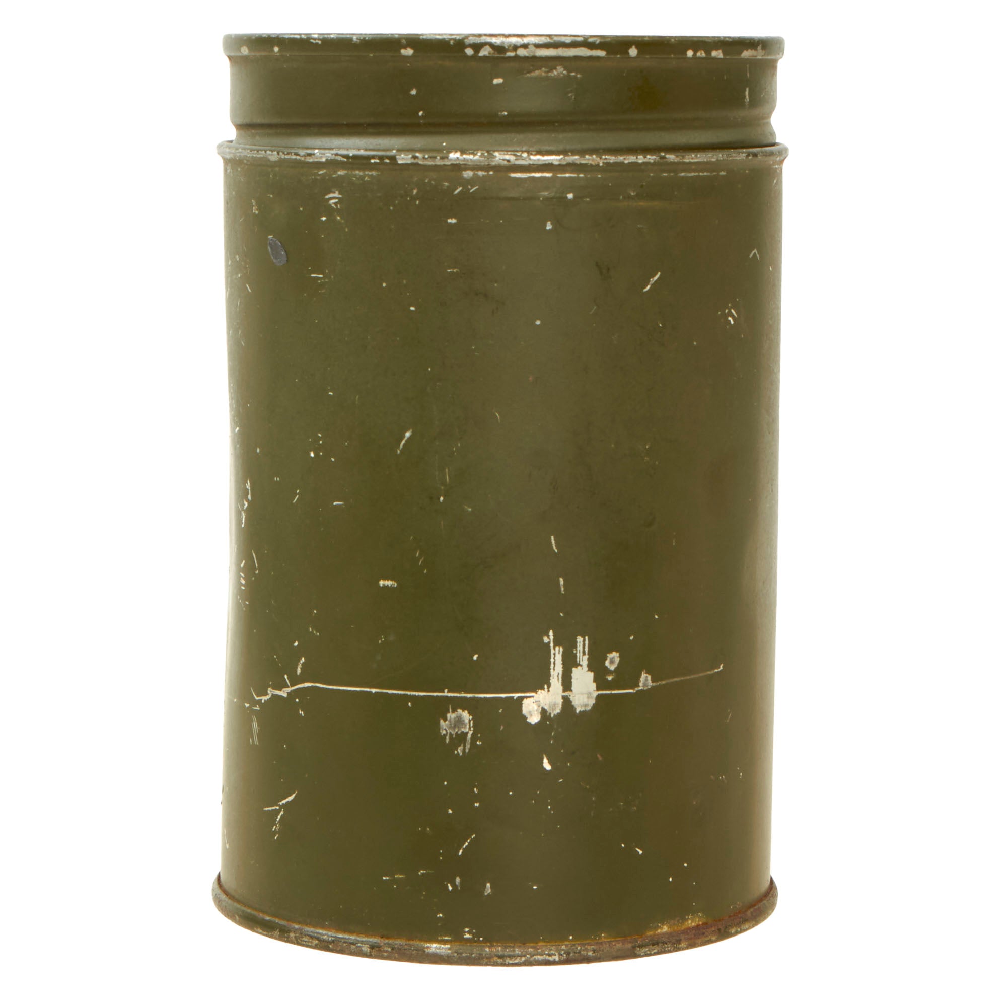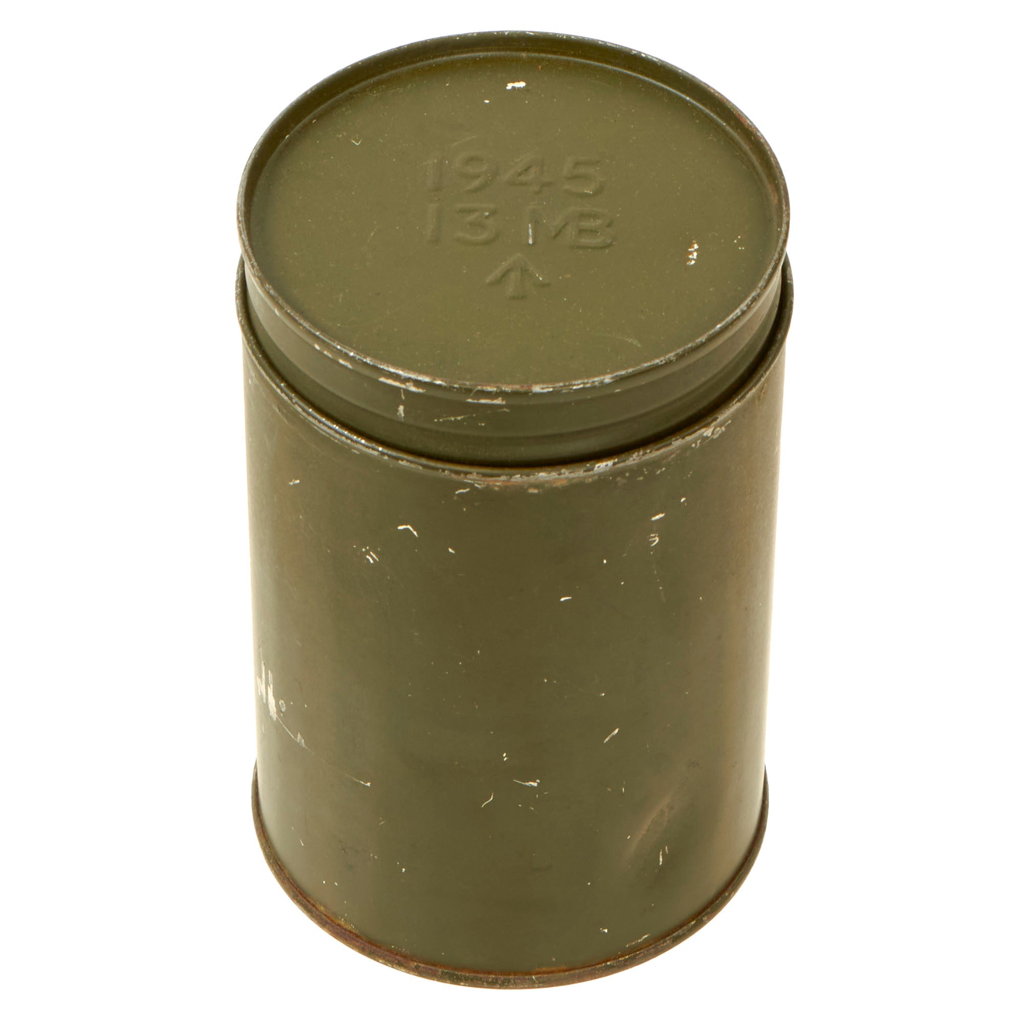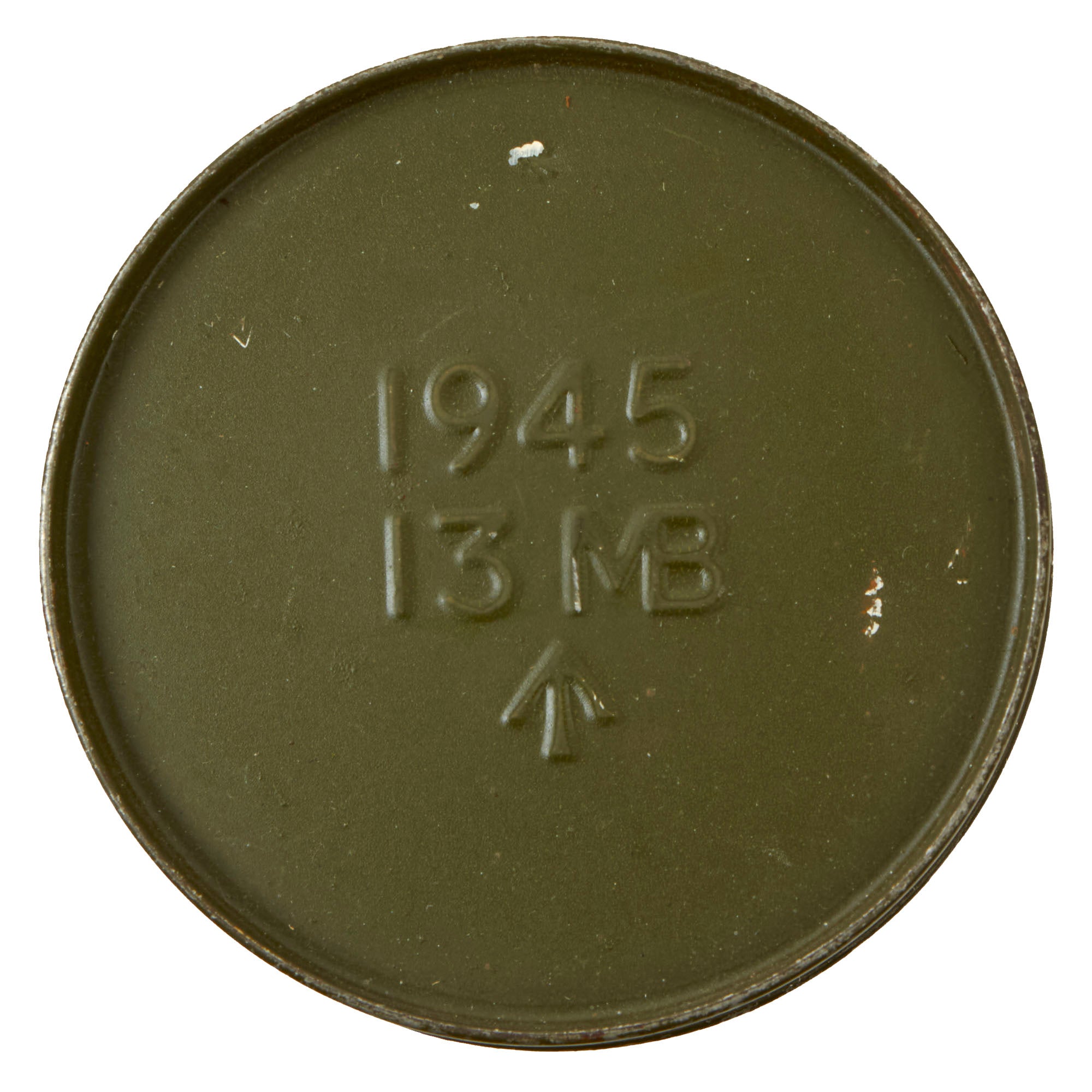 Original Item. Only One Available. A very niche piece of British WWII militaria, this is a “tent heater” dated 1945, a very portable heater with a mesh cover for the wick. The top of the can is marked, no doubt, so that it would be stored upright to prevent loss of the Parafin used to light it.