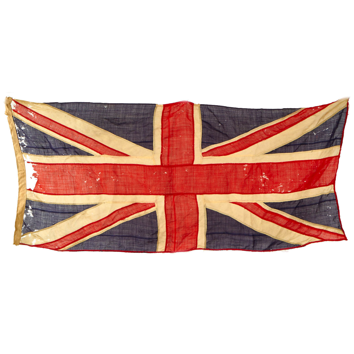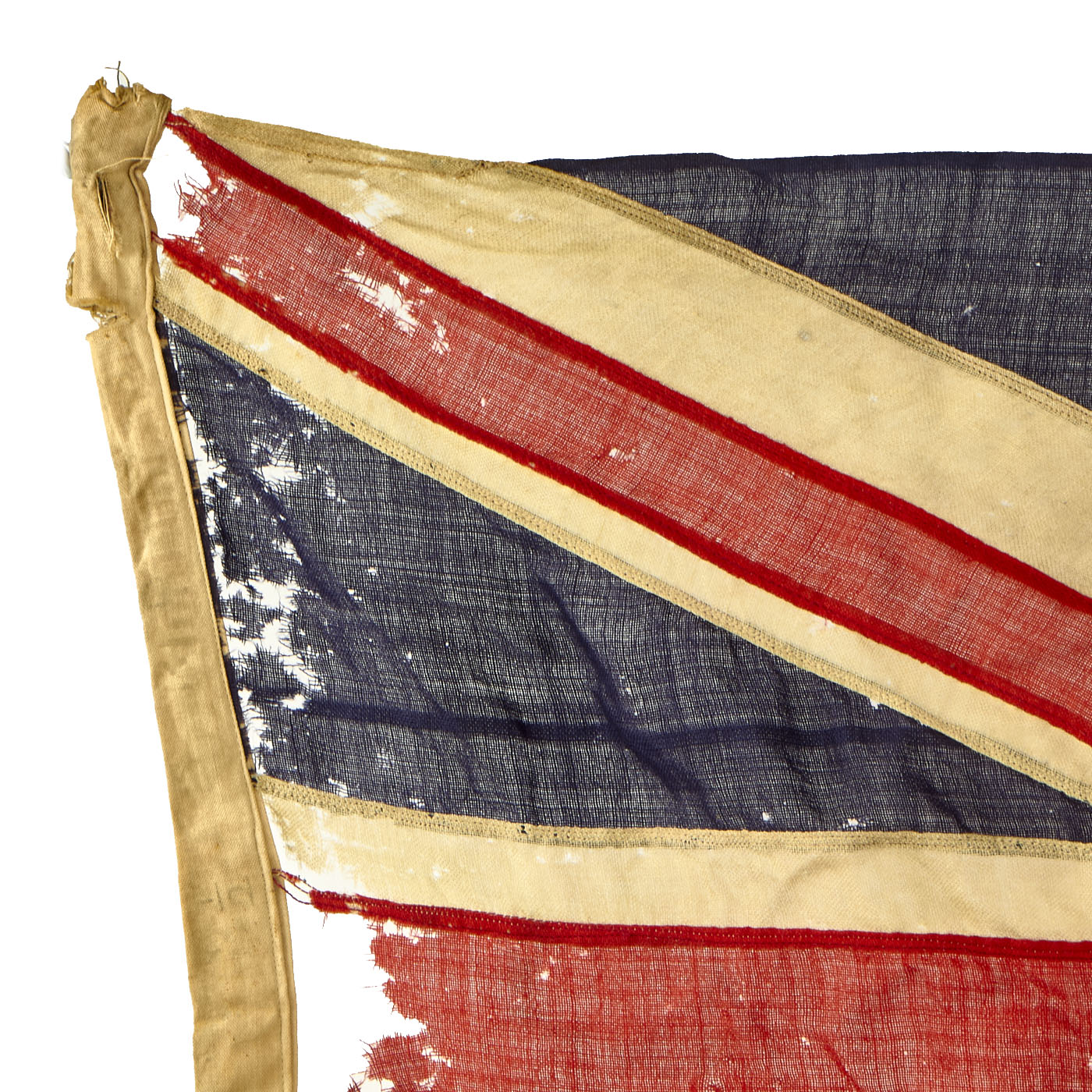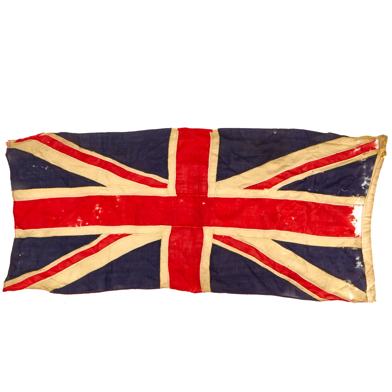 Original Item: Only One Available. This is a very nice Original British World War Two Union Jack Flag, measuring approximately 56" X 23 ½”. The flag header is marked, but this flag seems to have seen long service, so it was probably washed several times, which probably removed and faded the markings.
