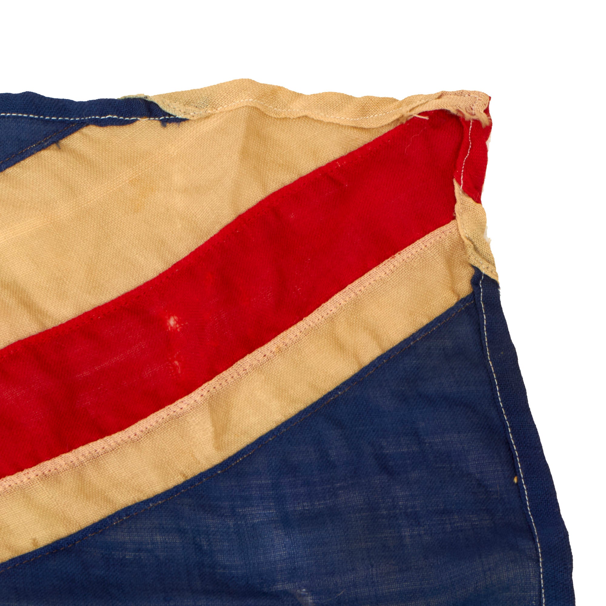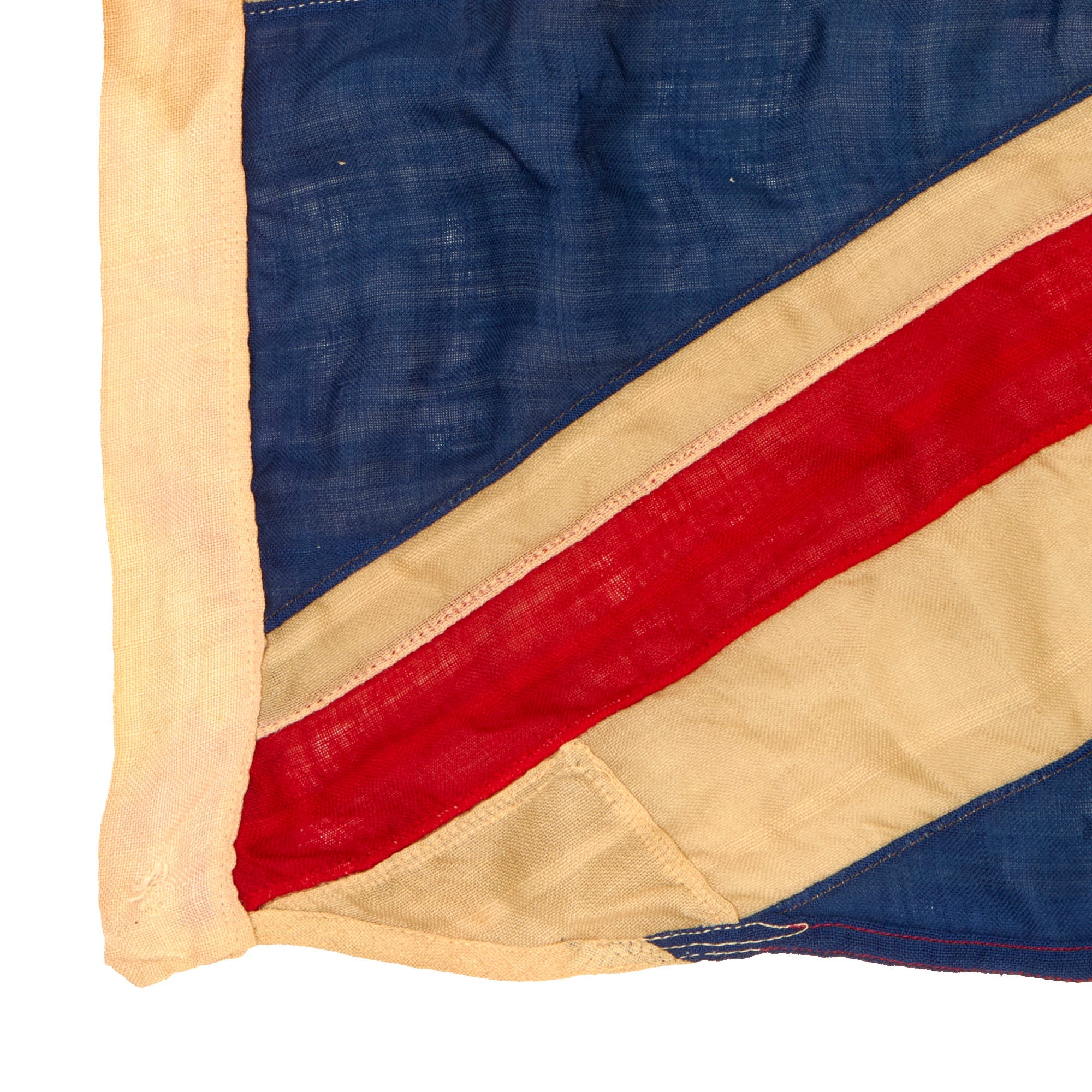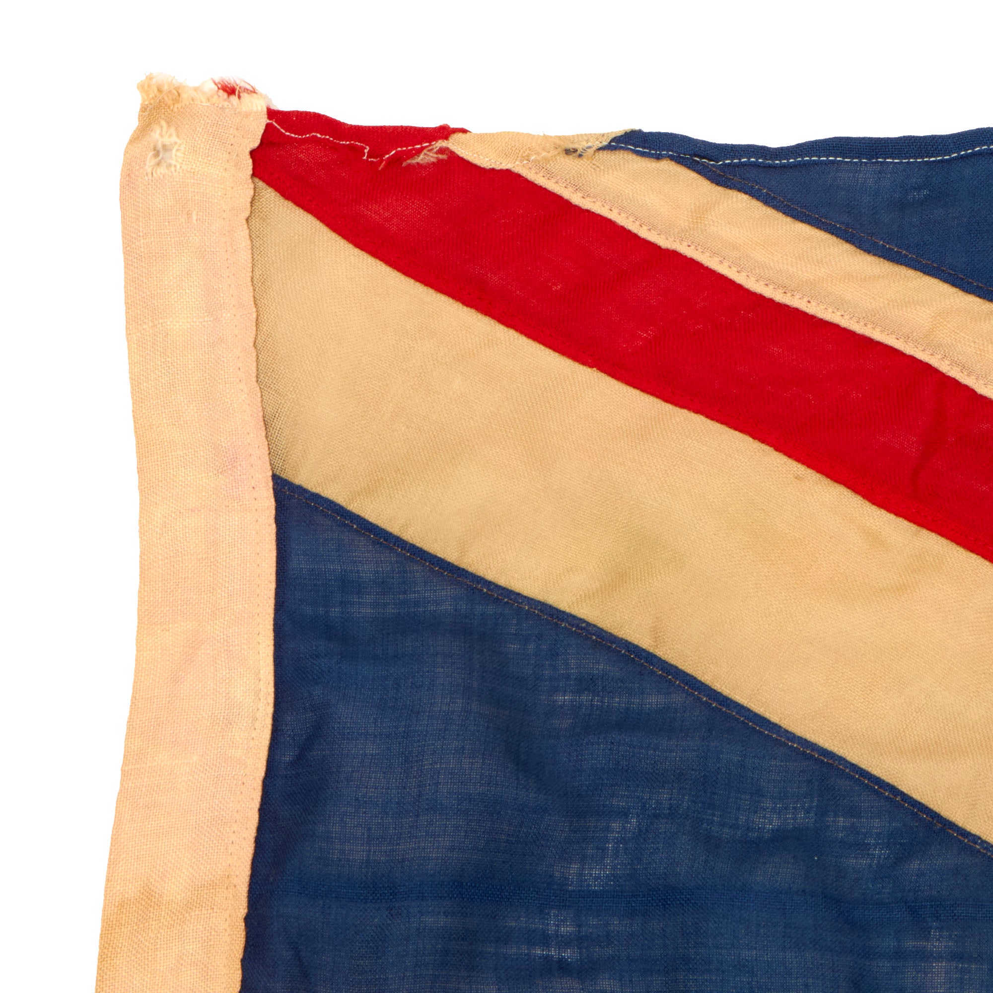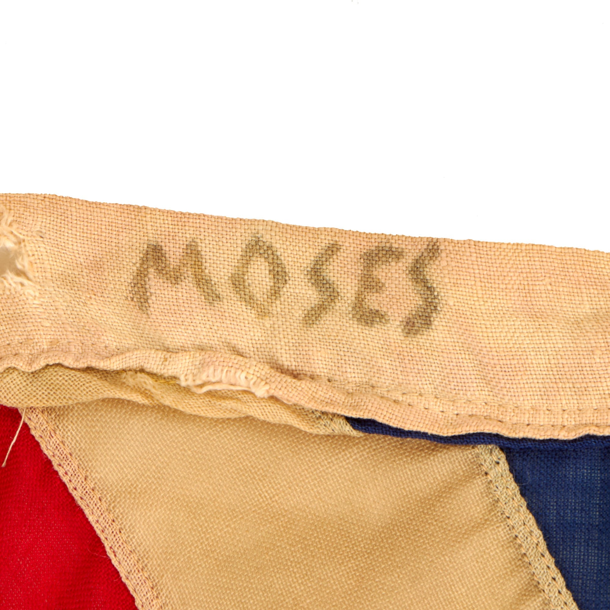 Original Item: Only One Available. This is a very nice Original British World War Two Union Jack Flag, measuring approximately 36 x 60”. It features a canvas header on the multi-piece wool bunting body, which rapidly went out of favor following WWII as superior synthetics became available. The header is marked in writing, MOSES, and the flag looks to have seen long service on display, which has resulted in significant age toning / yellowing to the fabric.