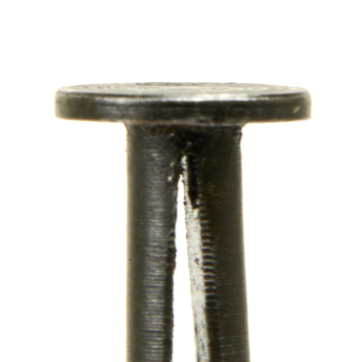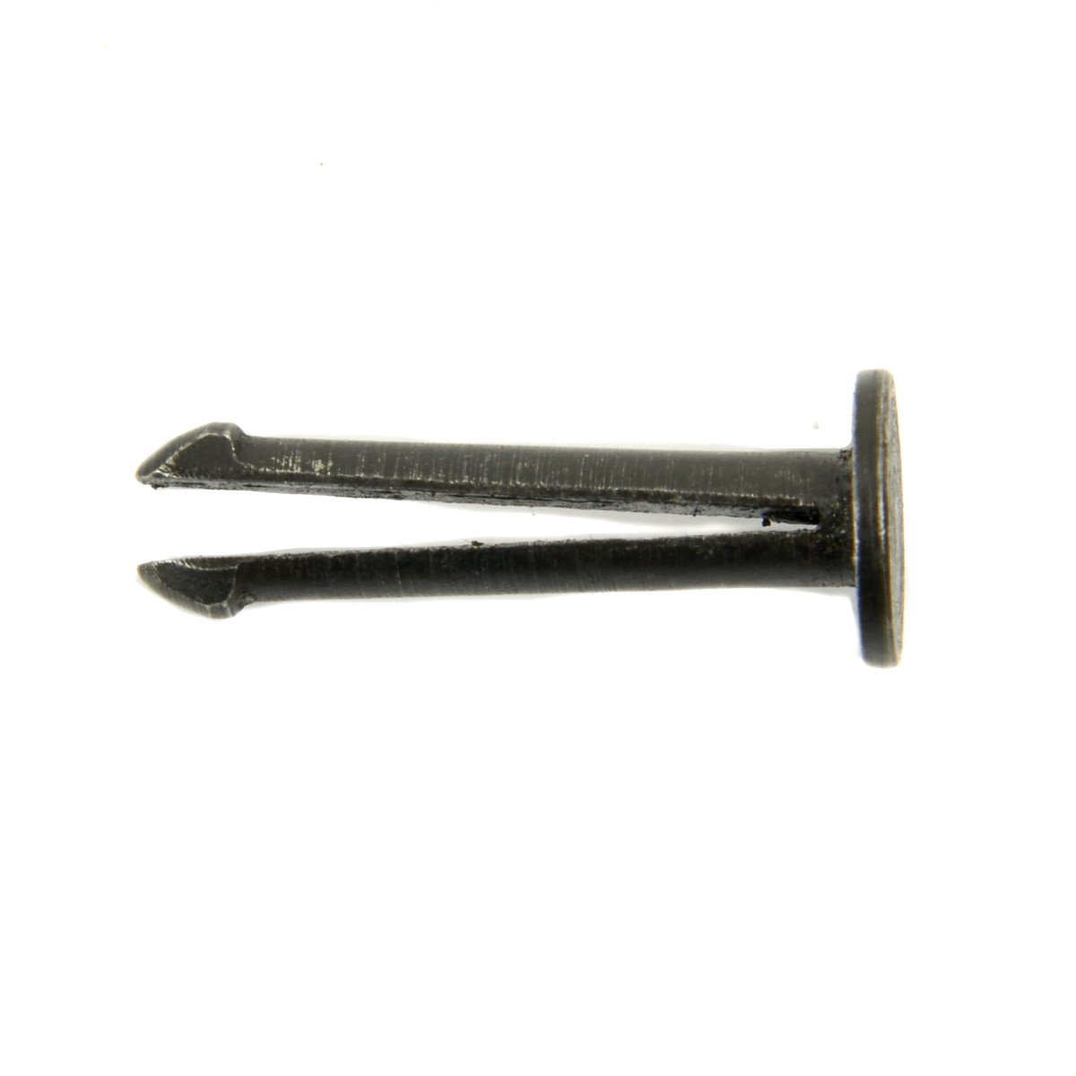 Original Item: The Vickers lock side levers are pivoted to the lock casing with the pivot bushing, and the pivot busing is retained in place with this split pin. The pin has a thin, broad flange at one end, while the other end is split and studded to latch into the bushing. In a very clever move, since the lock has to be disassembled frequently for cleaning, the T pin that helps secure the grip assembly to the receiver is designed so that one arm of the T serves as a drift pin to drive the split pin out of the bushing.