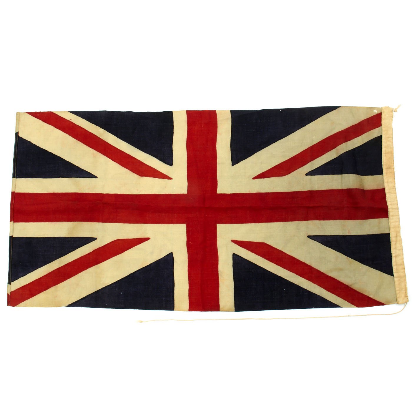 - Original Item: Only One Available. This is a very nice Original British World War Two Union Jack Flag, measuring approximately 52" x 26". The flag header is shows some wear from use. The flag is free of moth and other damage thought it is flecked with some small nips and minor staining which is consistent with age and use. It is constructed of wool bunting. The flag still has a portion its original hang line attached. Overall a nice flag from WW2 offered in very good condition.