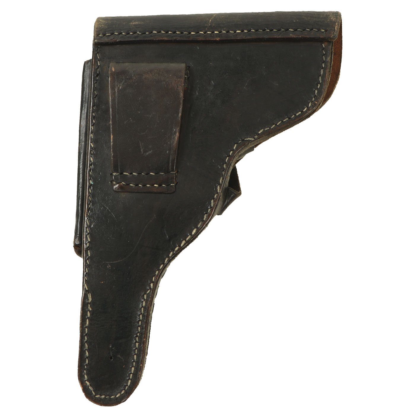 As they had been supplied by Germany since the WWI era, they utilized many of the same small arms, including the P-08 Luger. The holsters originally used had a full length front flap, secured by a leather strap through a loop near the bottom. As time went on they simplified the design, with a more standard size top flap, secured by a small strap over a front stud. This particular holster is very similar to one shown on page 77 of Luger Holsters and Accessories of the 20th Century by Eugene J. Bender. The book photo shows a separate flap for the magazine which was eliminated later in the war as it was considered somewhat redundant.
