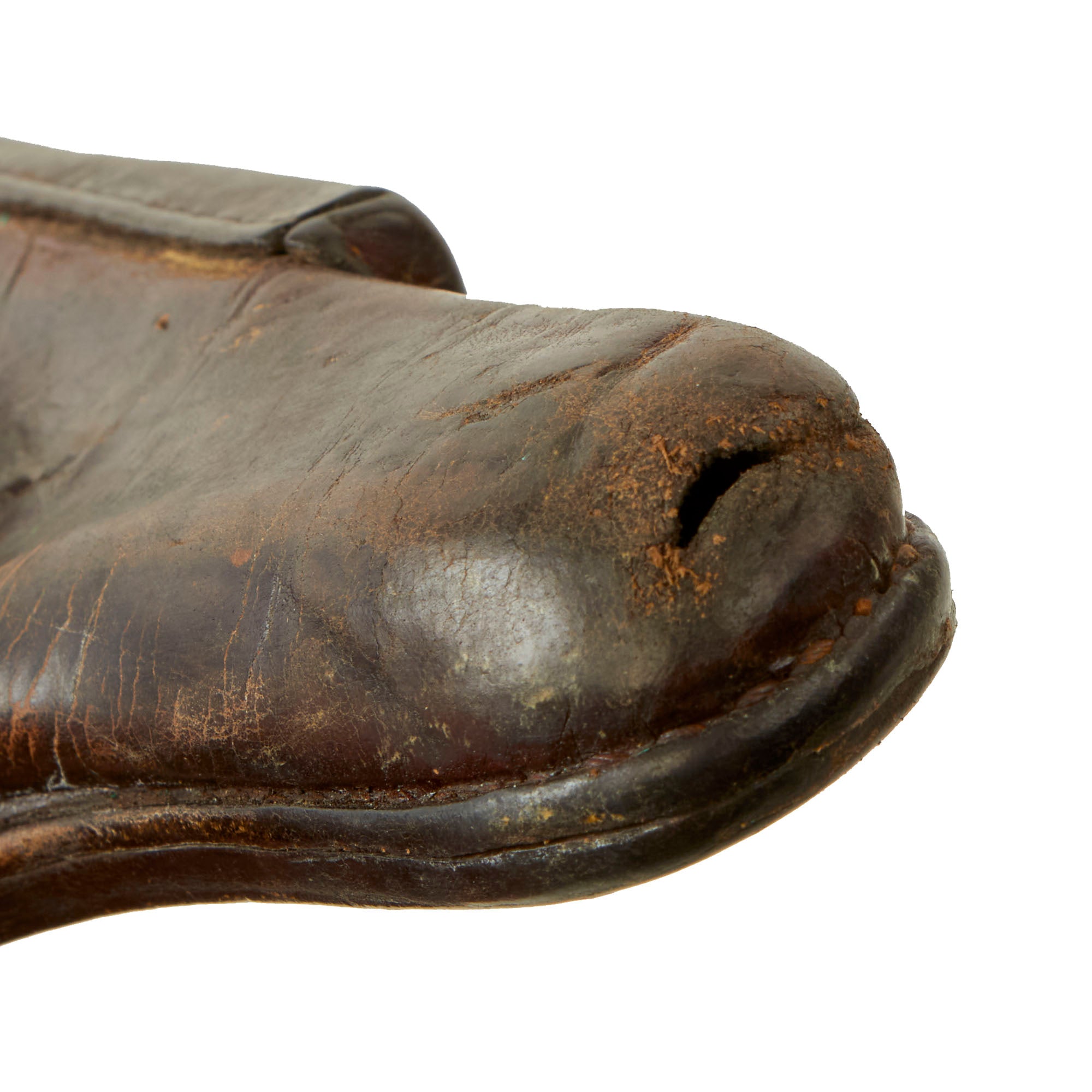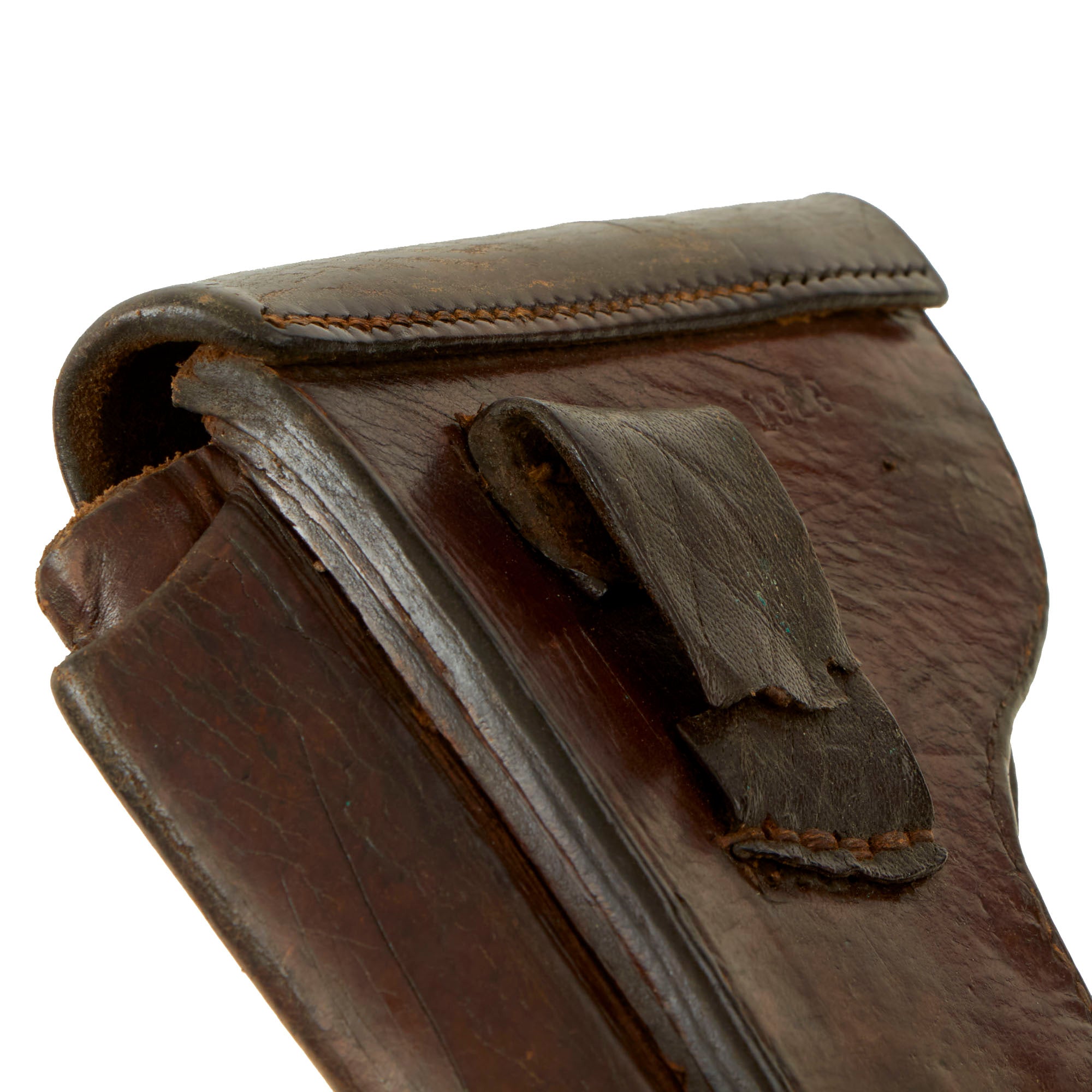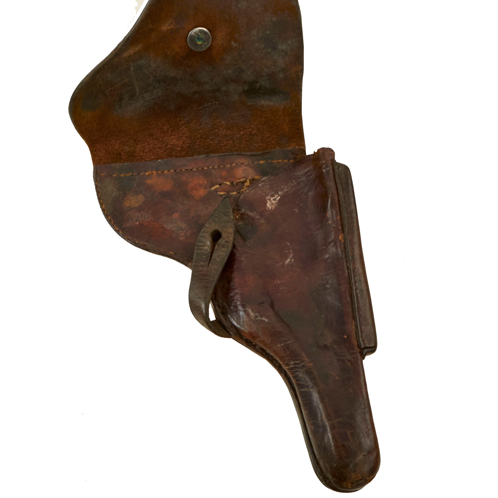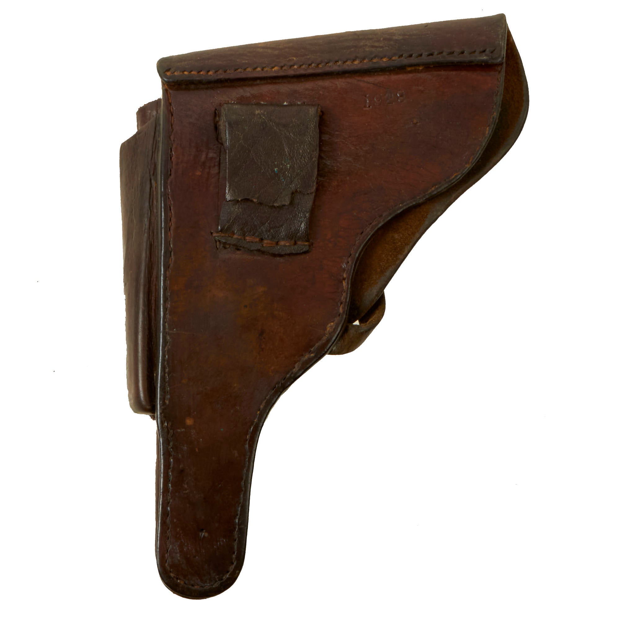 Original Item: Only One Available. This is a very nice Bulgarian WWII Issue holster for the legendary German P08 Luger Pistol. During WWII Bulgaria was one of many smaller countries that Allied itself with Germany, partly hoping of regaining territory lost during previous wars. They originally had been Neutral, but with the majority of their trade being related to Germany, including their arms supply, their nationalist leadership decided to formally join the Axis powers.As they had been supplied by Germany since the WWI era, they utilized many of the same small arms, including the P-08 Luger. The holsters originally used had a full length front flap, secured by a leather strap through a loop near the bottom. As time went on they simplified the design, with a more standard size top flap, secured by a small strap over a front stud.The condition of the holster is good, and looks to have been brown leather, which retains its original color. The back of the holster is stamped 1928. The leather is still supple, but the belt loop on the back is almost entirely torn through, the only serious condition issue on this holster.Ready to display or use!The Pistole Parabellum—or Parabellum-Pistole (Pistol Parabellum), commonly known as just Luger—is a toggle-locked recoil-operated semi-automatic pistol which was produced in several models and by several nations from 1898 to 1948. The design was first patented by Georg Luger as an improvement upon the Borchardt Automatic Pistol and was produced as the Parabellum Automatic Pistol, Borchardt-Luger System by the German arms manufacturer Deutsche Waffen und Munitionsfabriken (DWM). The first production model was known as the Modell 1900 Parabellum. Followed by the "Marinepistole 1904" for the Imperial German Navy. The later versions included the popular "Parabellum Pistole Modell von 1908" or simply "P08" (Pistole 1908) which was produced by DWM and other manufacturers such as W+F Bern, Krieghoff, Simson, Mauser, and Vickers. The first Parabellum pistol was adopted by the Swiss army in May 1900. 1904 they were adopted by the German Navy. In German Army service, it was adopted in slightly modified form as the Pistole Modell 1908 (Pistole 08) in caliber 9×19mm Parabellum. The Model 08 was eventually succeeded by the Walther P38.The Luger is well known from its use by Germans during World War I and World War II, along with the interwar Weimar Republic and the postwar East German Volkspolizei. The P.08 was introduced in 7.65mm Parabellum, though it is notable for being the pistol for which the 9×19mm Parabellum cartridge was developed, also known as the 9×19mm Luger. The pistol has been used in fictional works by many villainous characters over the past several decades because of its association with AH's Germany.