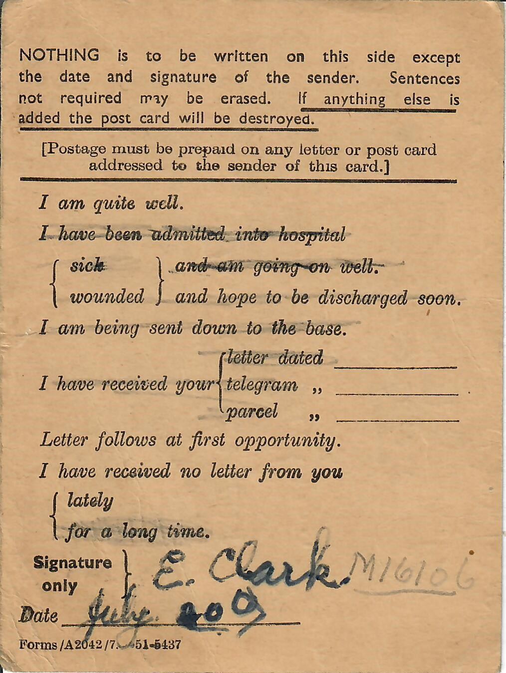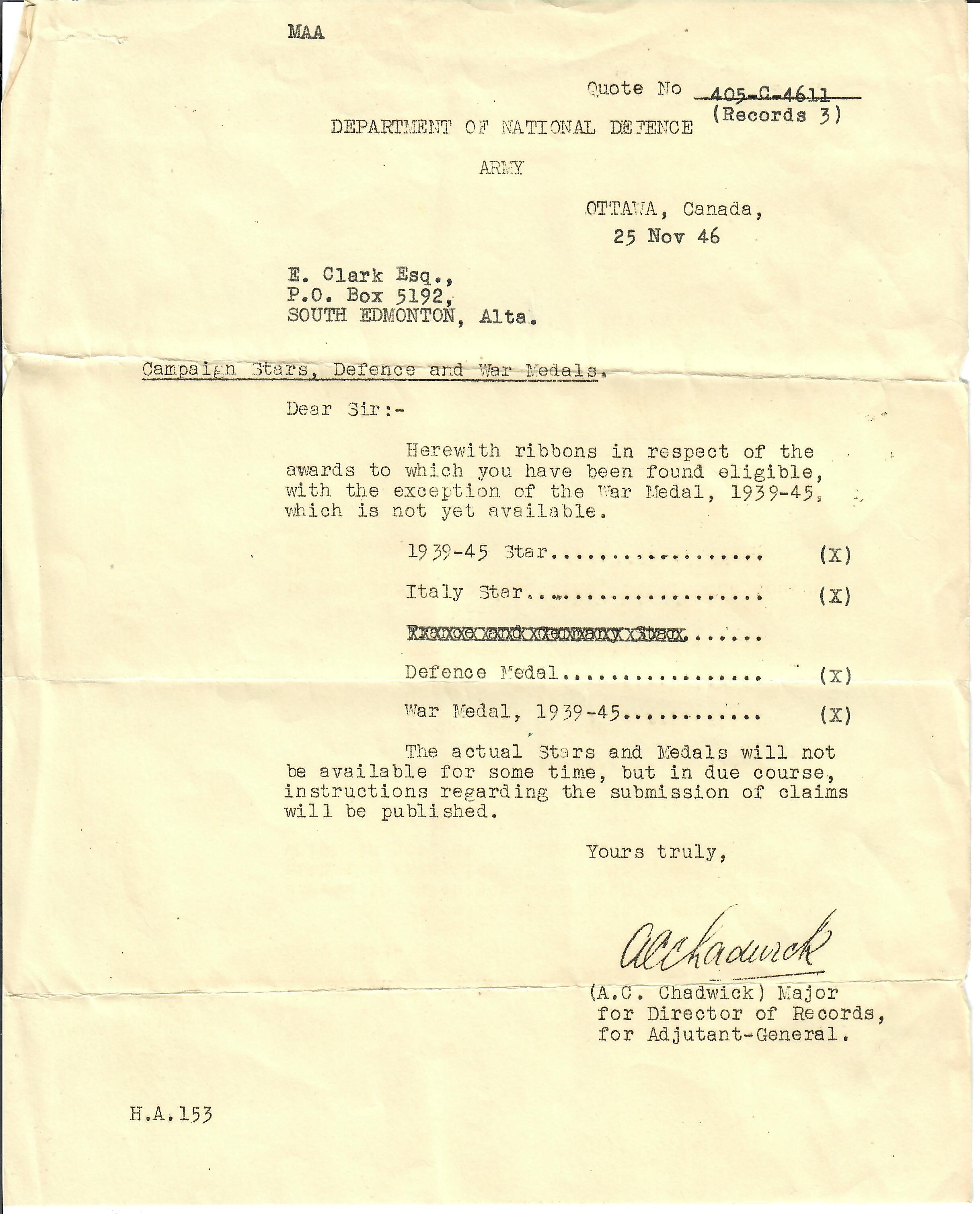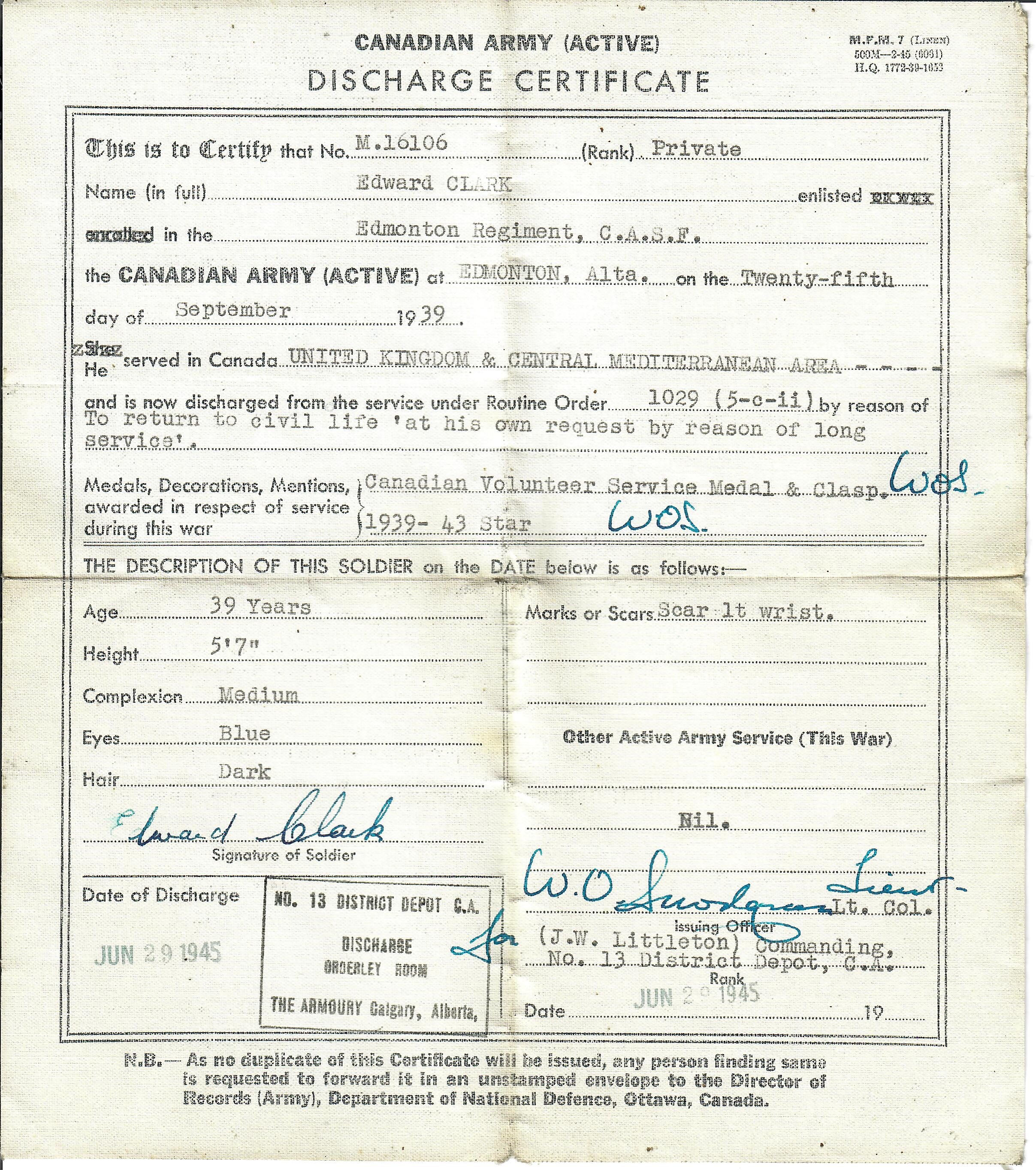 - Canadian Army (Active) Discharge Certificate: States that Clark was in the Edmonton Regiment, C.A.S.F. and enlisted on September 25, 1939 and was discharged as a Private on June 29, 1945.