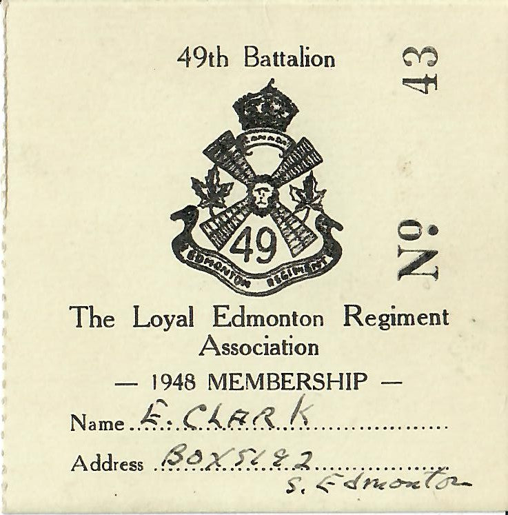 Original Items: Only One Group Available. This is a fantastic little Canadian grouping for Private Edwark Clark of the Loyal Edmonton Regiment. The Loyal Edmonton Regiment (4th Battalion, Princess Patricia’s Canadian Light Infantry), or L Edmn R, is a Primary Reserve infantry unit of the Canadian Armed Forces based in Edmonton, Alberta. The Loyal Edmonton Regiment is part of 3rd Canadian Division's 41 Canadian Brigade Group. They are colloquially known as "The Loyal Eddies".