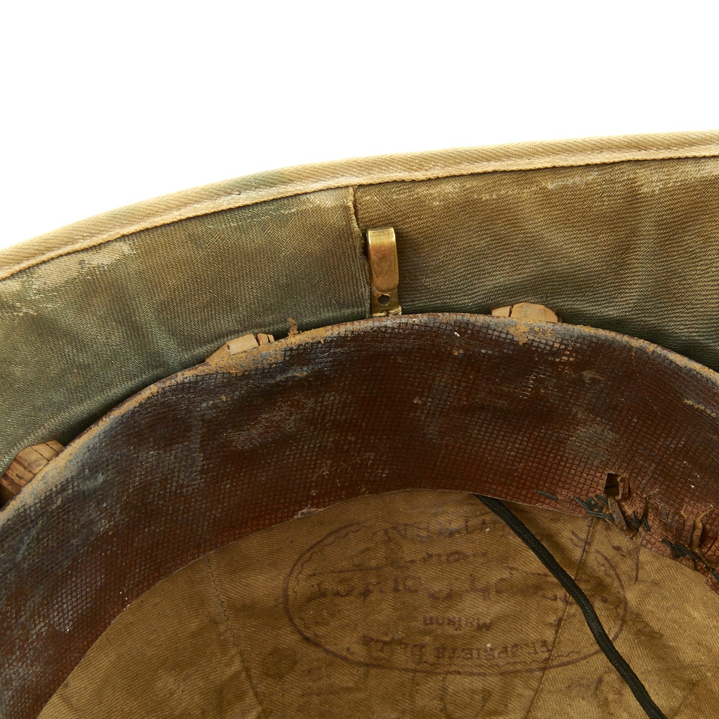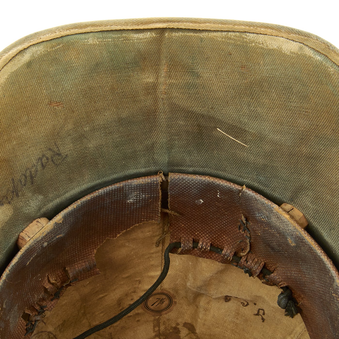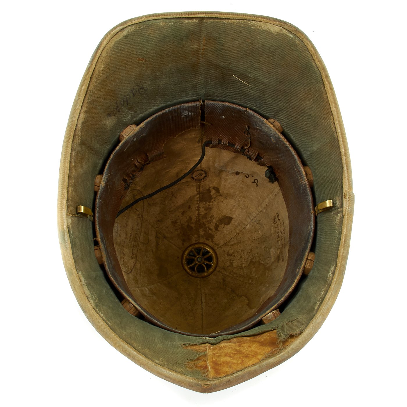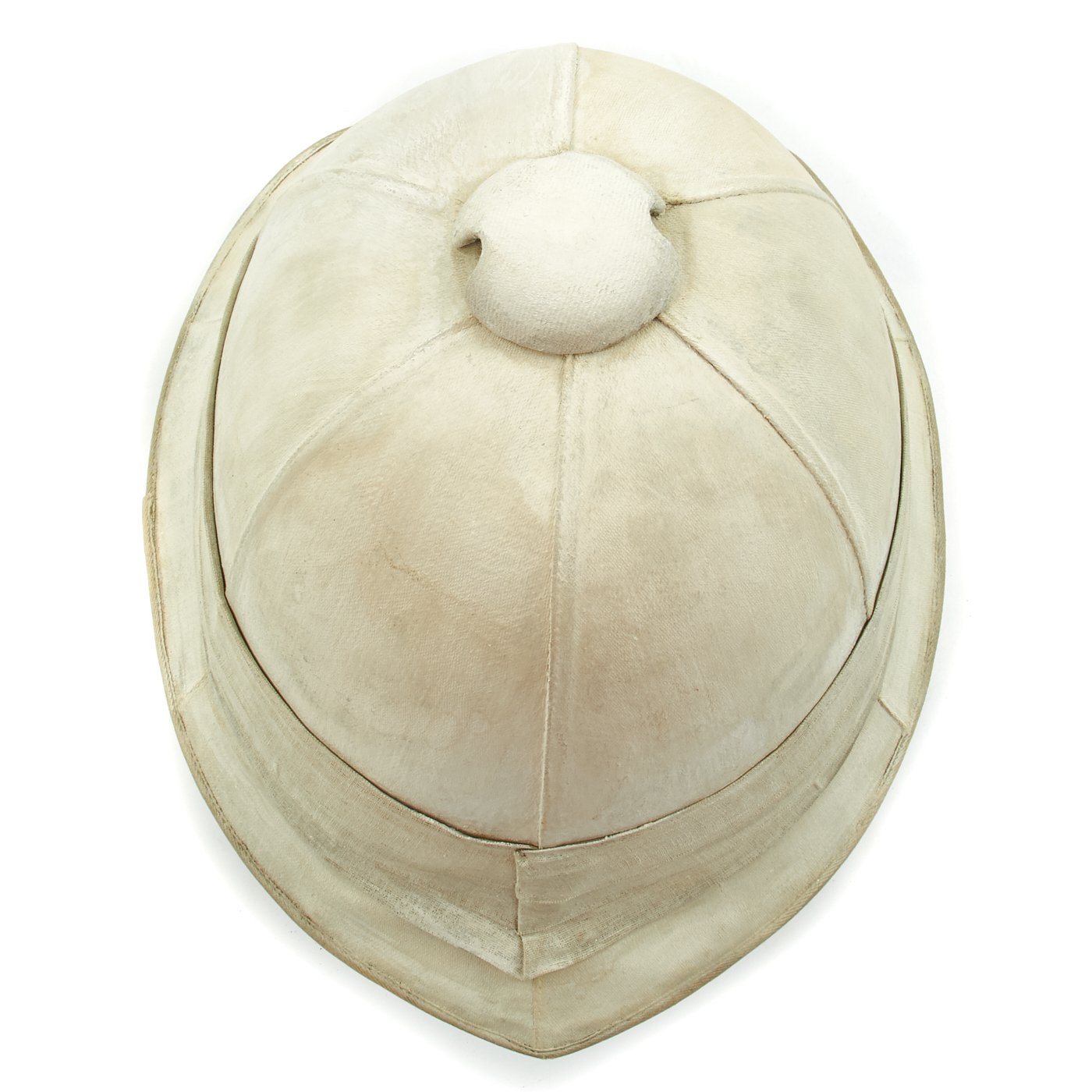 The word “khaki” is Persian for “dust.” While serving in India, it was common for officers to attempt to break up the white color of helmets, as well as other white garments with the use of mud, tea, coffee, tobacco juice and curry powder. The results varied greatly, and by 1884 a patented dyestuff produced a fast “khaki” dye. It wasn’t until the second Afghan War in 1885 that a full khaki uniform replaced the red uniforms and white helmets. But because the helmet was often a private purchase item, many continued to be produced in white. Many officers purchased a white helmet and relied on a khaki cover, rather than having to purchase both a white and a khaki helmet. For this reason, it isn’t uncommon to find Foreign Service Helmets from much later than 1885 that are white in appearance.