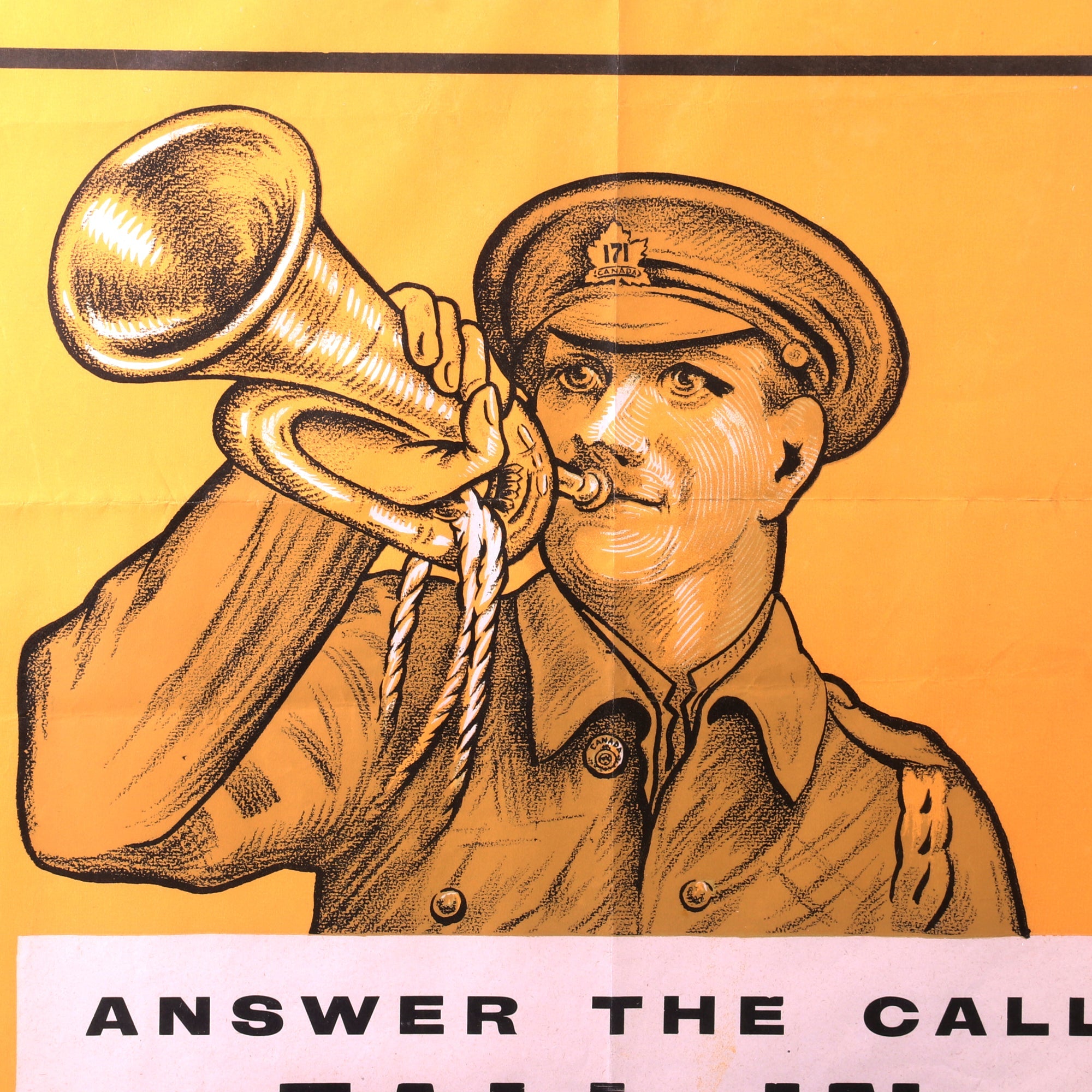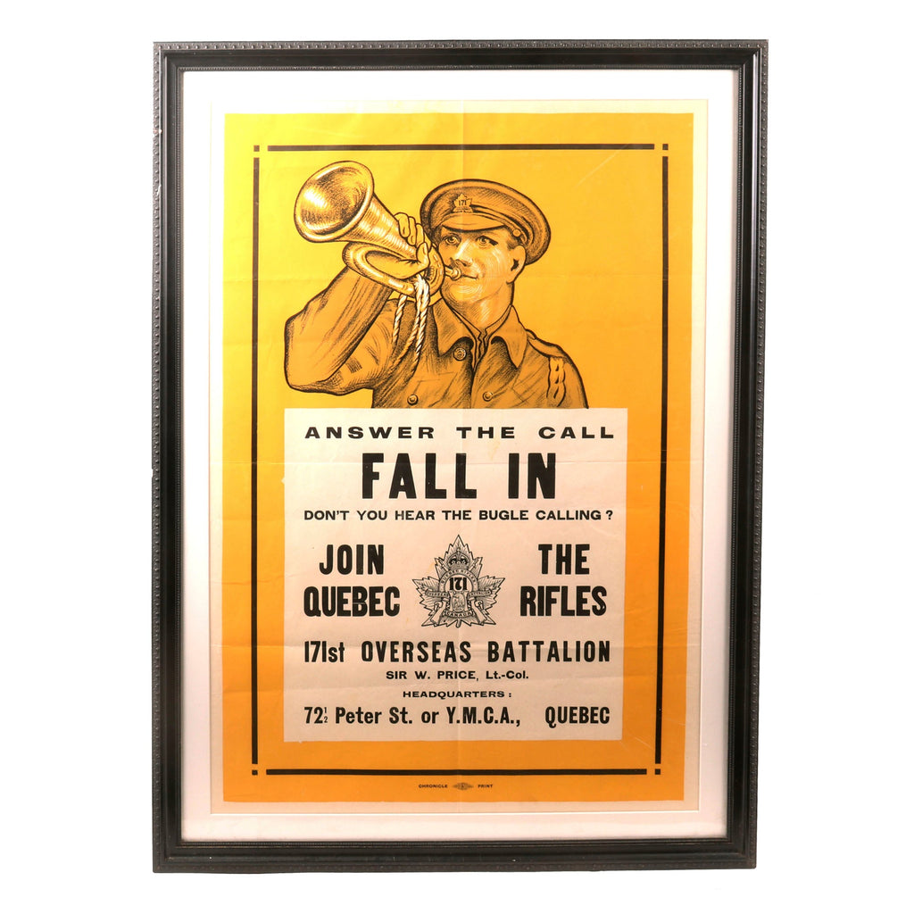 This is one of the most tremendous WWI Recruitment posters we have ever offered, one that we could not find a single comparable example of, so we are confident in calling this example one-of-a-kind. This poster was produced to garner recruitment for the 171st Battalion (Quebec Rifles), CEF. The poster features a Bugler in the 171st, with the correct cap badge, over the text:
